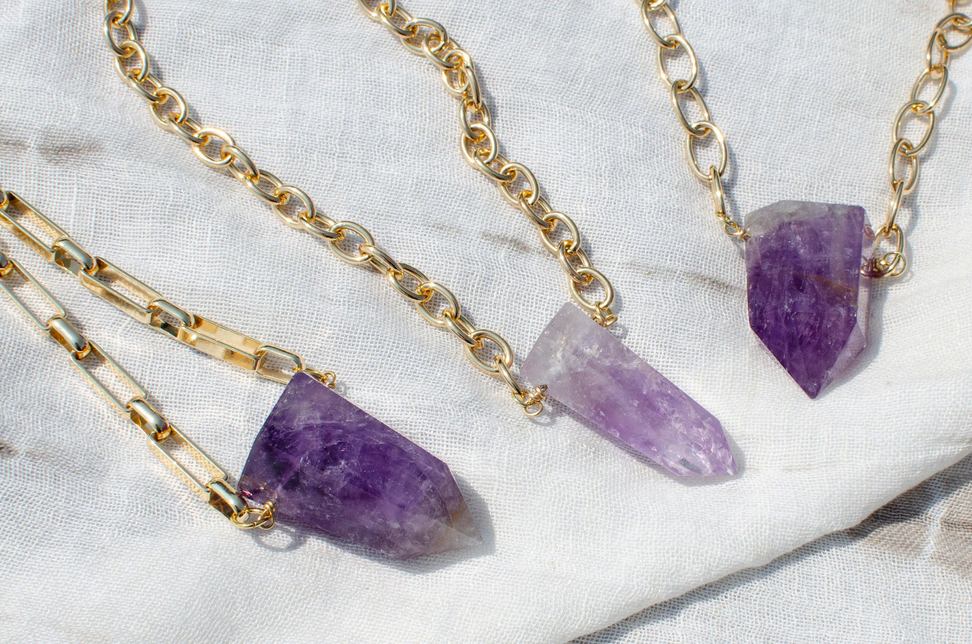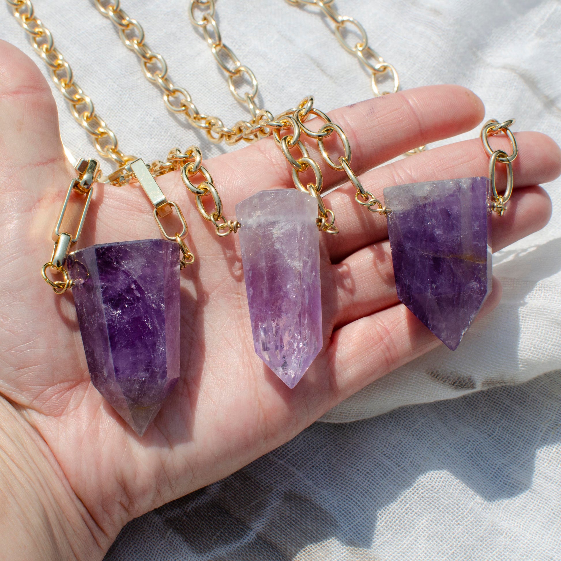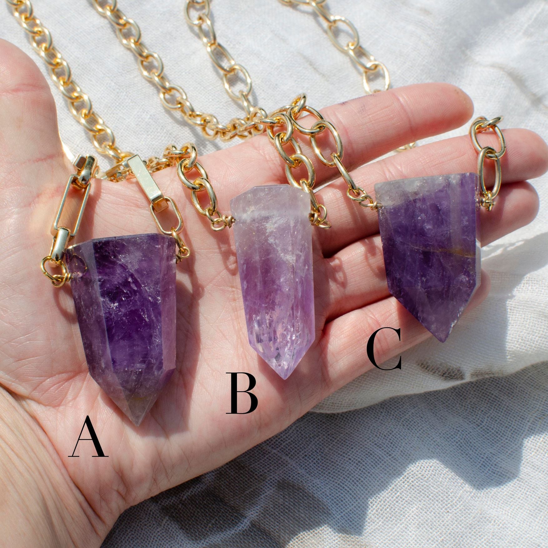 Handmade in Nashville, these stunning amethyst crystal point necklaces are crafted with natural stones and feature high-quality 14k gold-plated chains. Each necklace measures 18" with an additional 3" extender for versatile wear. Choose from three unique crystal options: A, B, or C. Every crystal is hand-drilled and wire wrapped, creating a timeless piece that’s become one of my best sellers. Amethyst is known for its calming and protective properties, promoting spiritual growth, clarity, and emotional balance.