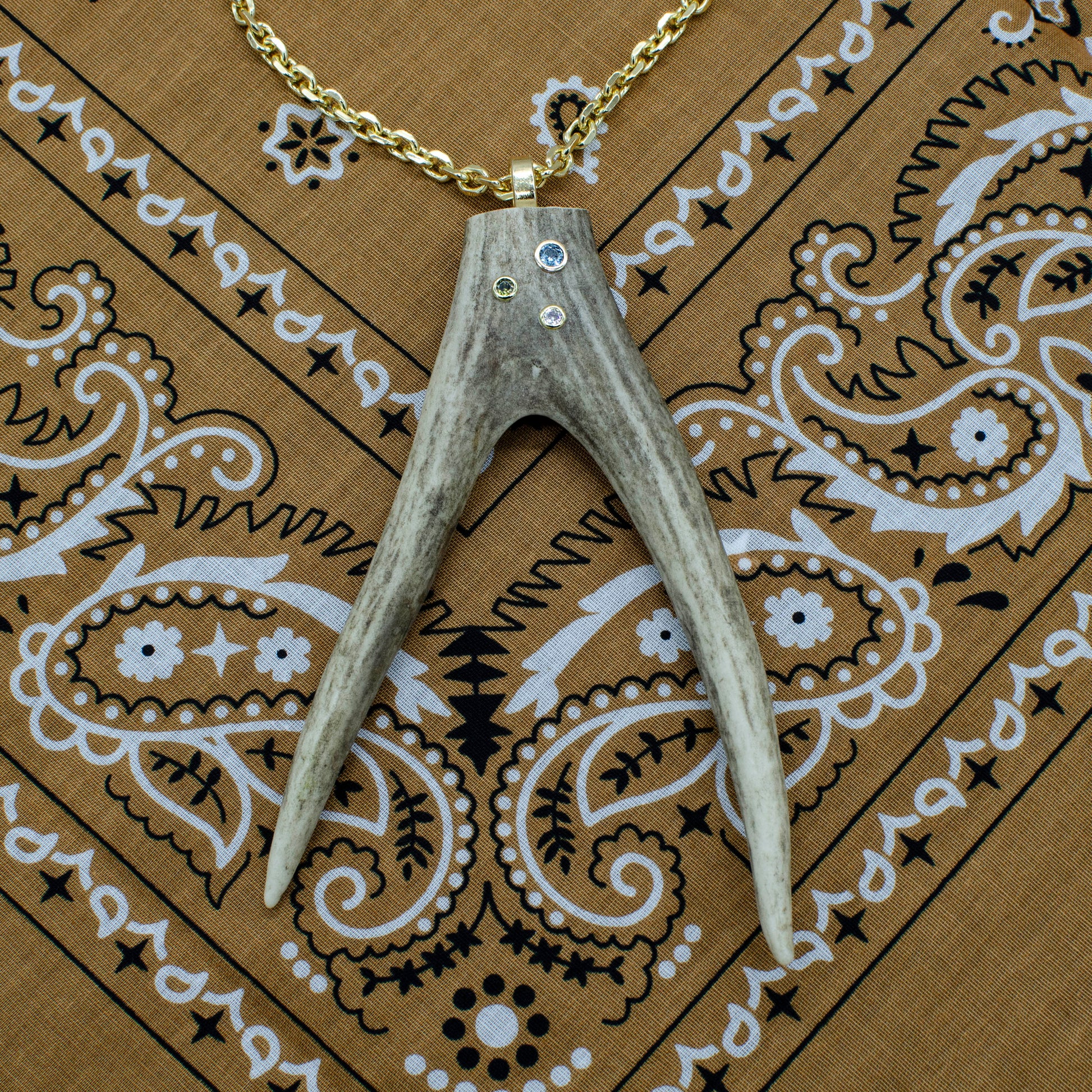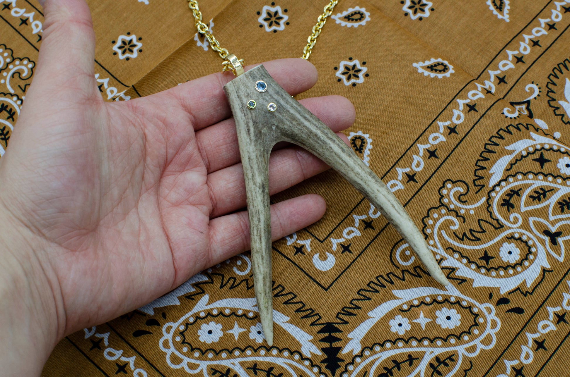 A true Southern statement piece. This one-of-a-kind necklace features a naturally shed antler tine with hand-drilled stone inlays in clear, olive green, and light blue. The 14k gold plated bail is securely drilled into the antler for long-lasting wear, paired with a gold-plated chain that can be worn at adjustable lengths. Perfect for a southern huntress, outdoors lover, or anyone who loves nature-inspired jewelry.