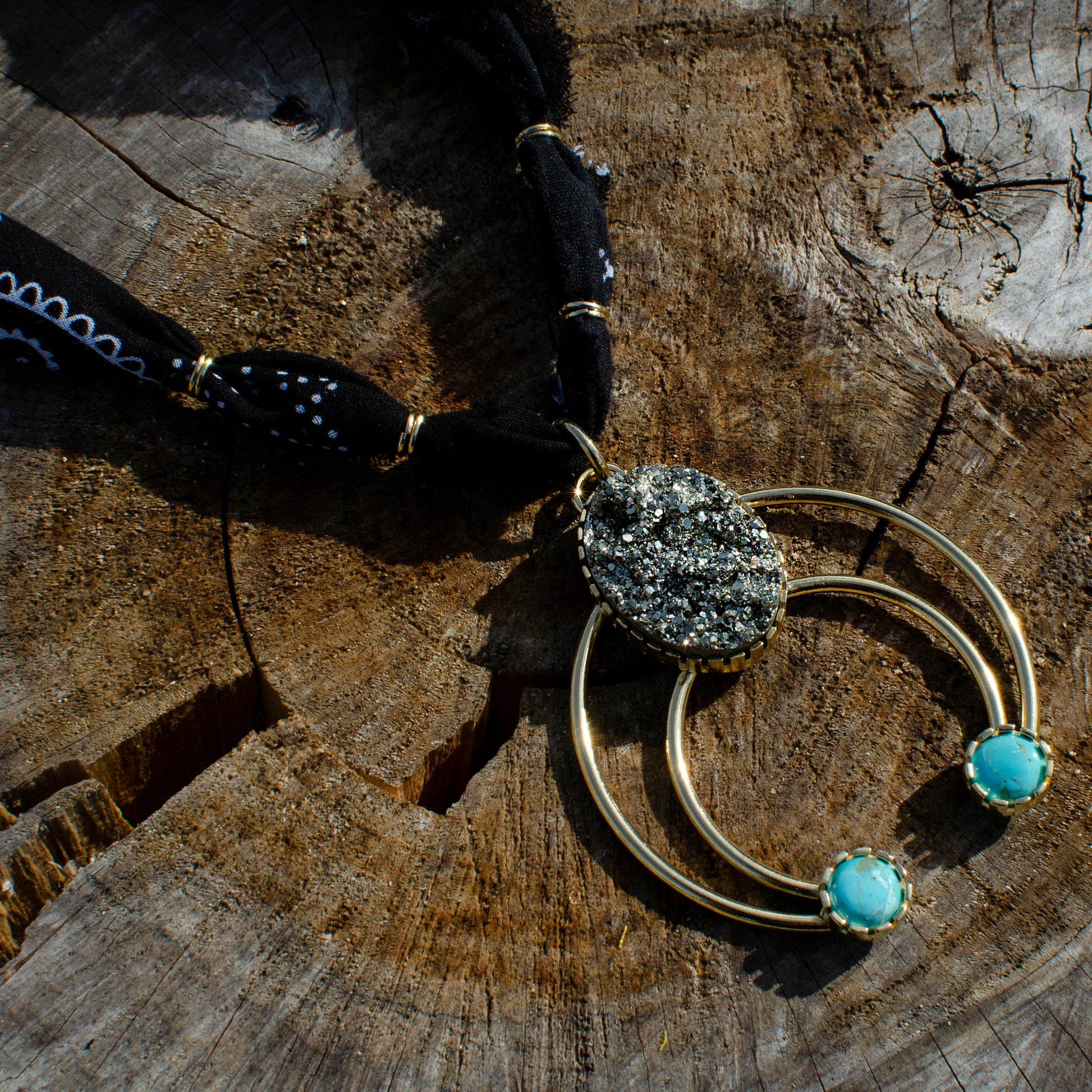 A celestial twist on a classic silhouette. This handmade one-of-a-kind pendant features natural Peruvian pyrite and Tibetan turquoise set in a bold, 14k gold-plated squash blossom design. Strung on a soft, frayed black bandana for the perfect blend of Western, boho, and beachy vibes.