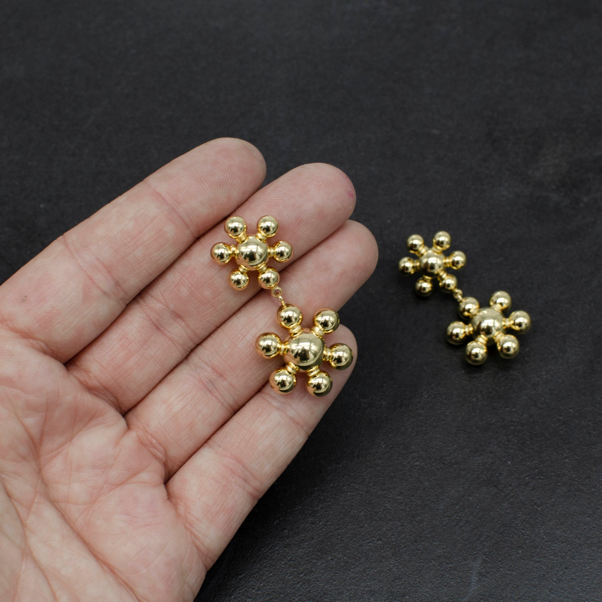 Bubble Flower Drop Earrings, a delightful blend of elegance and simplicity. Crafted from brass and heavily plated in 14k gold, these lightweight earrings boast a charming floral motif. Perfect for any occasion, from everyday wear to special events, their versatile design adds a touch of sophistication to any ensemble. Ready to ship and effortlessly stylish, elevate your look with these chic earrings today.
