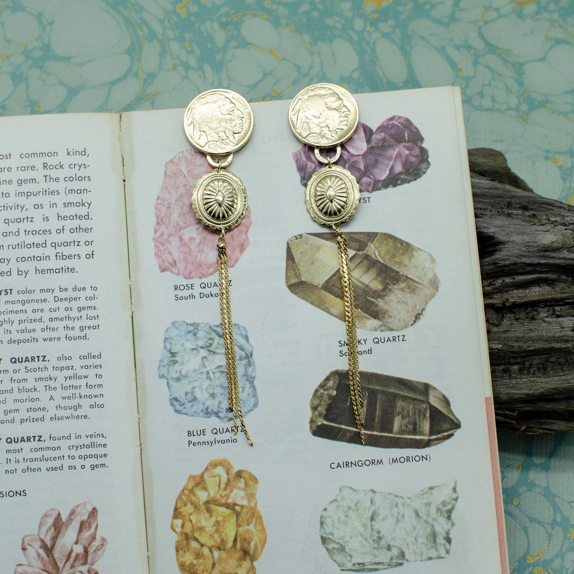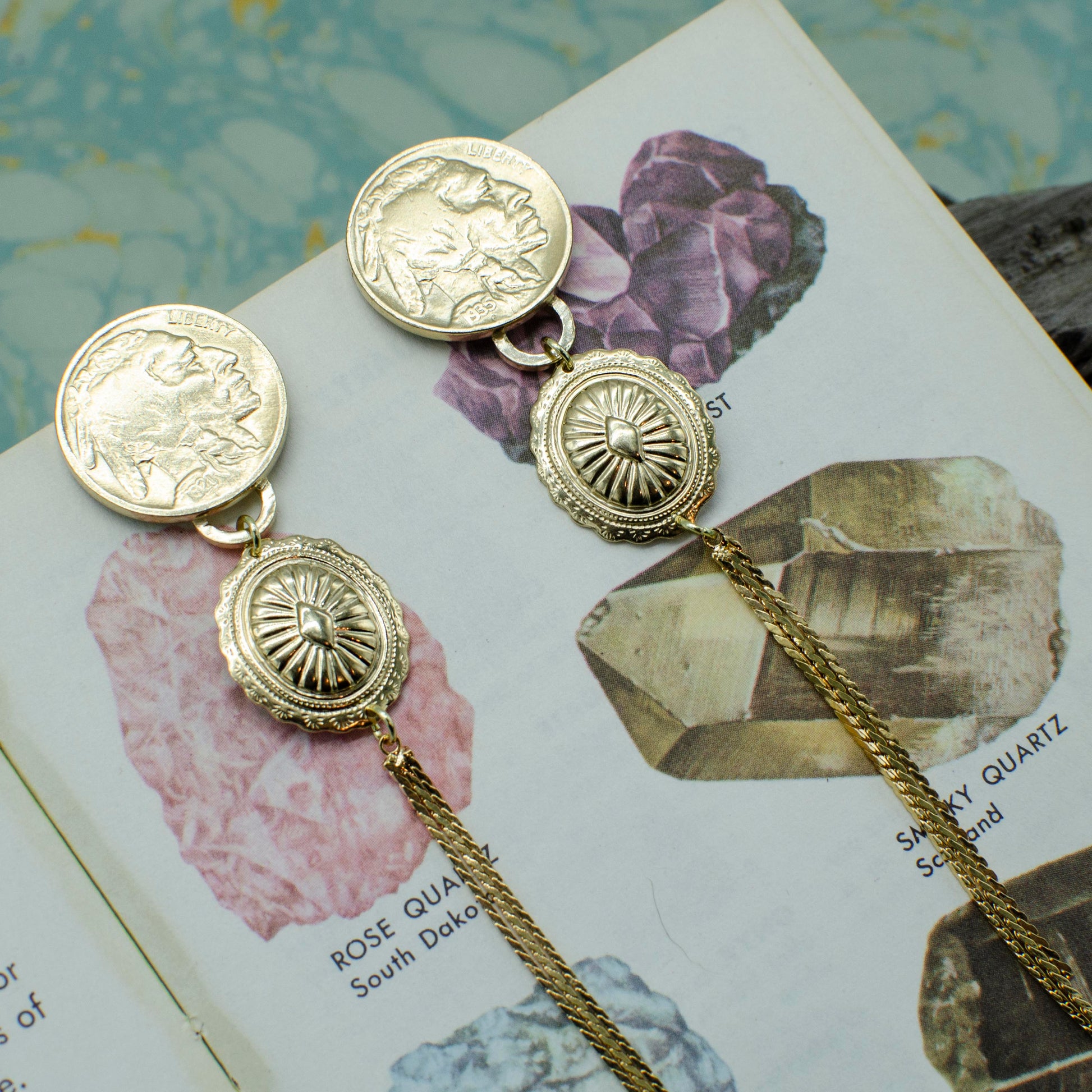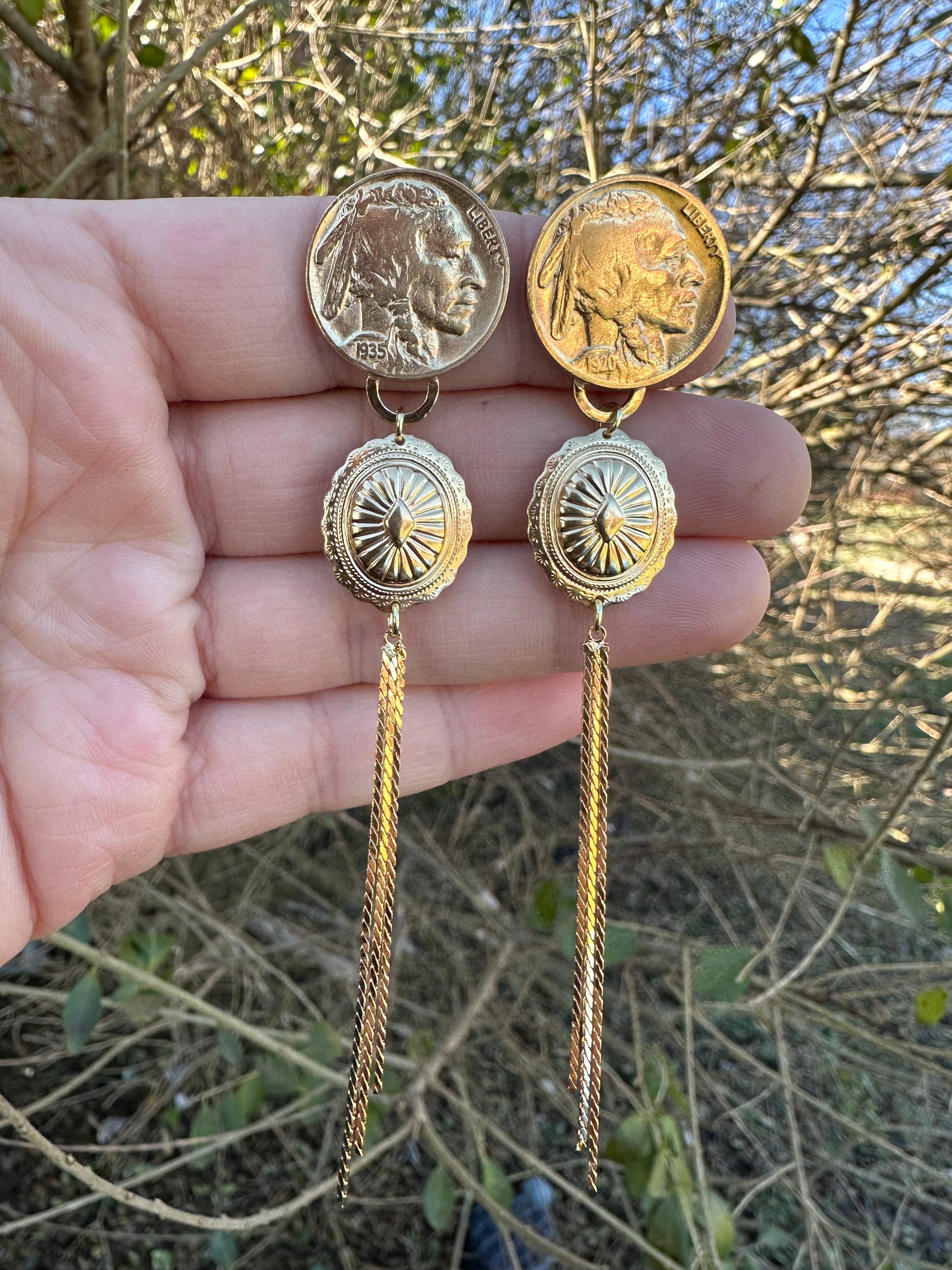 Make a bold statement with these stunning Buffalo Nickel Concho Statement Earrings. These drop earrings are crafted from high-quality 14k gold plating, ensuring durability and longevity. The elegant design of these earrings is perfect for both everyday wear and special occasions, making them a versatile addition to any jewelry collection.