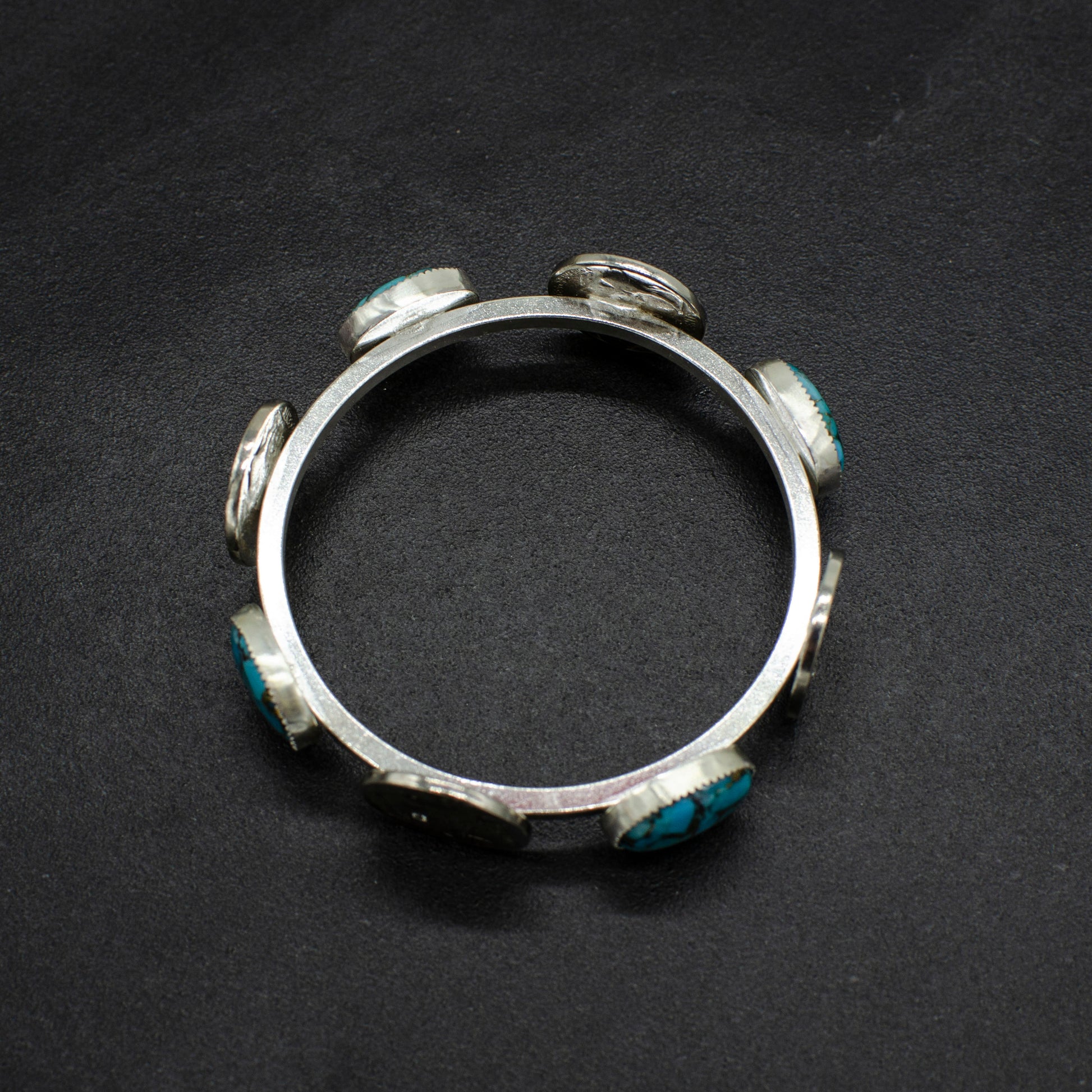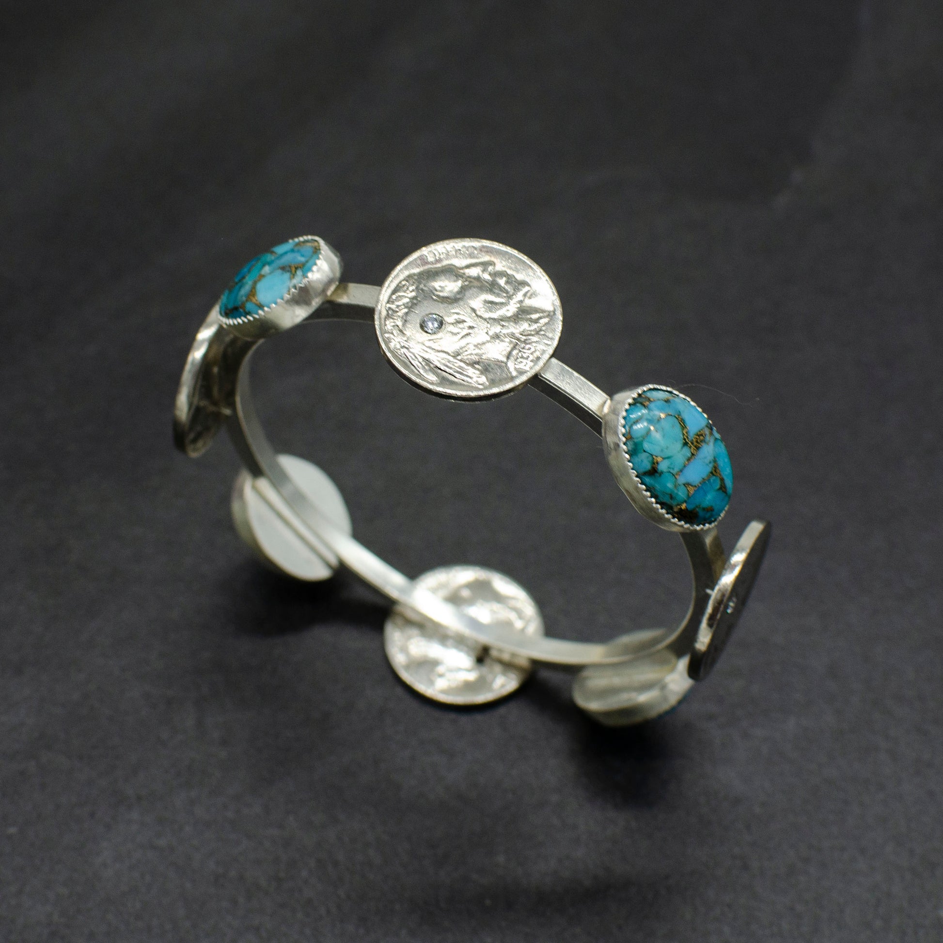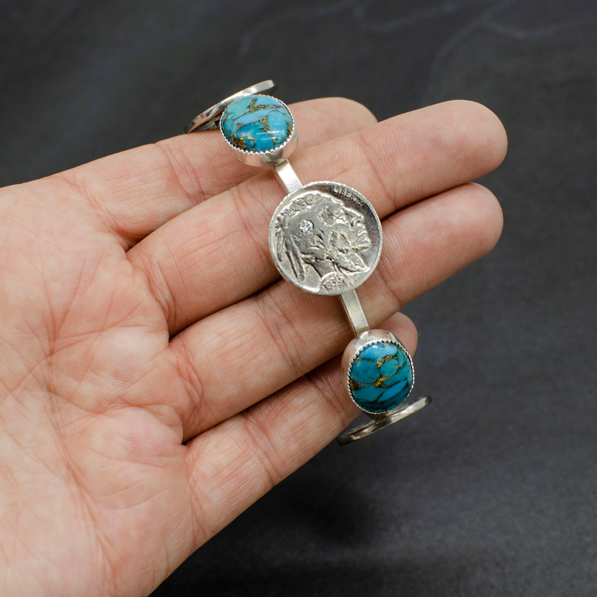 -Featuring four authentic Native American Buffalo Nickels surrounded by oval turquoise