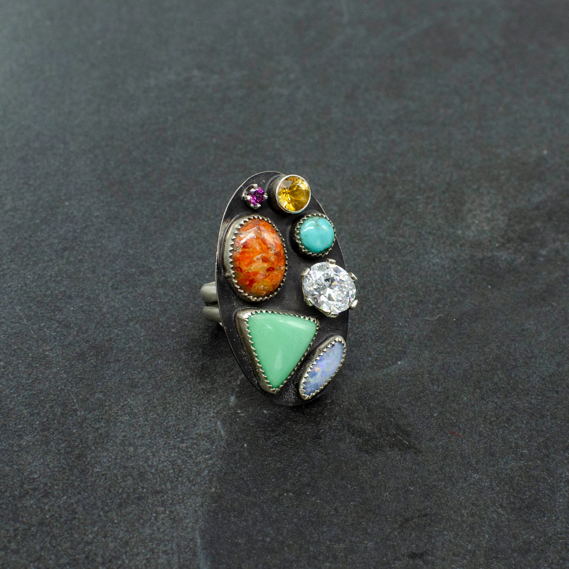 Introducing the handmade sterling silver Cluster ring, size 8, ready to ship. Featuring a cluster of seven stones including Australian Opal, cubic zirconia, garnet, citrine, variscite, turquoise, and red spiny oyster. Features a sturdy and comfortable double band sterling shank. Each stone adds its unique charm, creating a one-of-a-kind design.