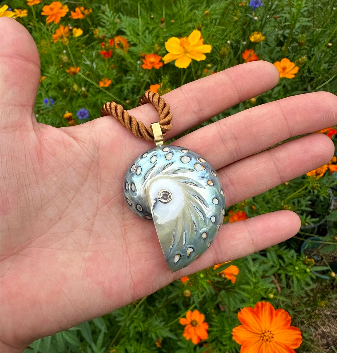 This nautilus shell is a large cabochon measuring approx. 2.2 inches long, 1.7 inches at widest and convex to approx. 0.65 inch thick. It features the shell’s distinctive pearlized sea blue finish with “spotted” accents. These effects take poetic license to highlight the Nautilus as a universal symbol for peace and coexistence. The Nautilus shell is never unscathed; it is scarred by predators but his animal does not attack, rather it retreats into its chambers.