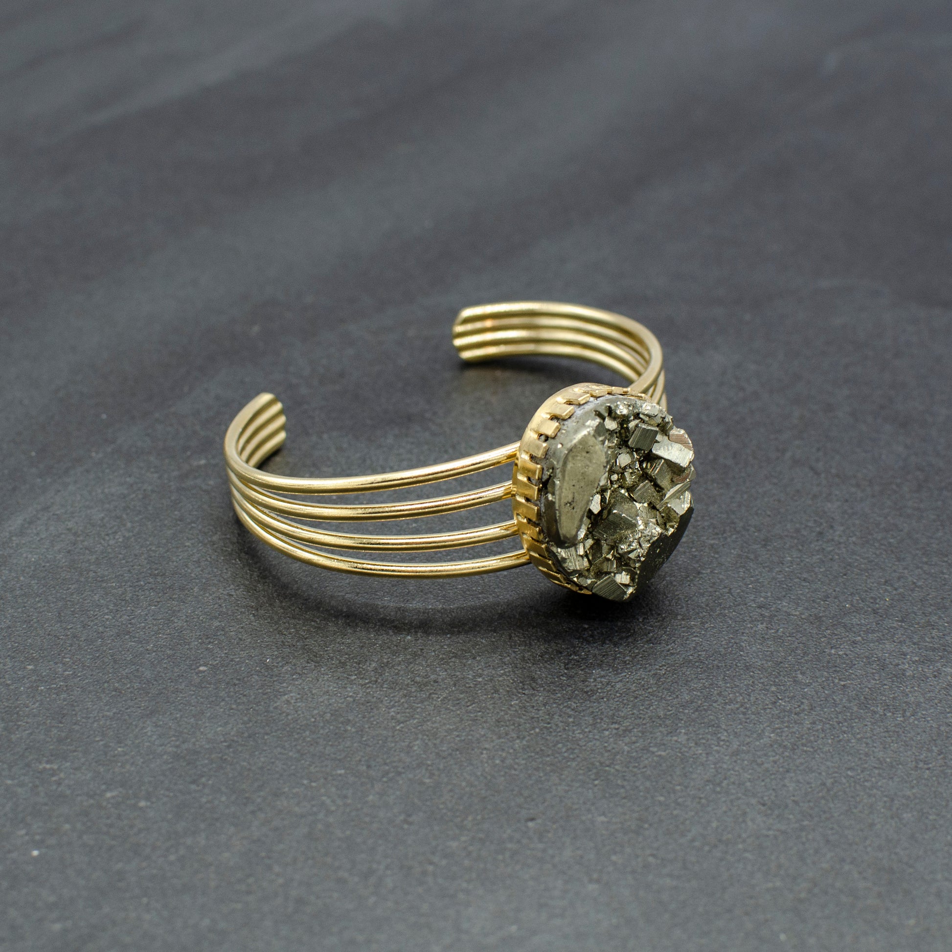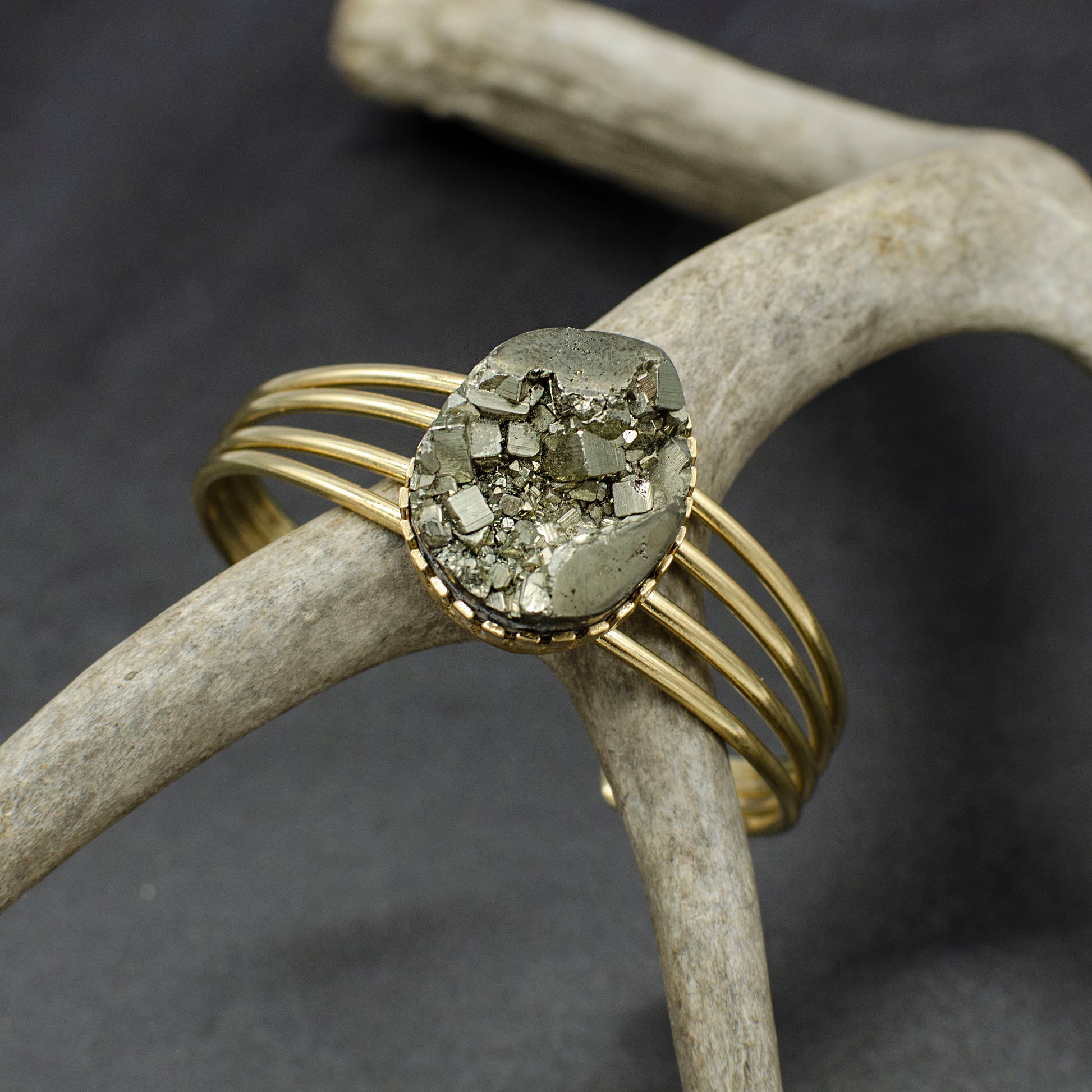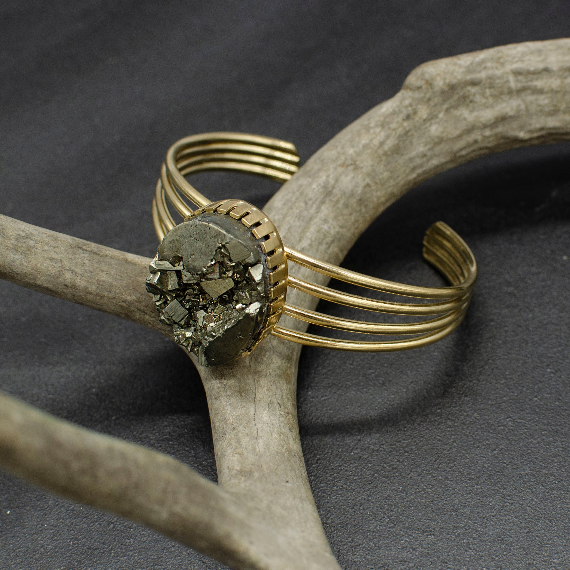 -Feature Peruvian Pyrite stone set in decorative bezel.