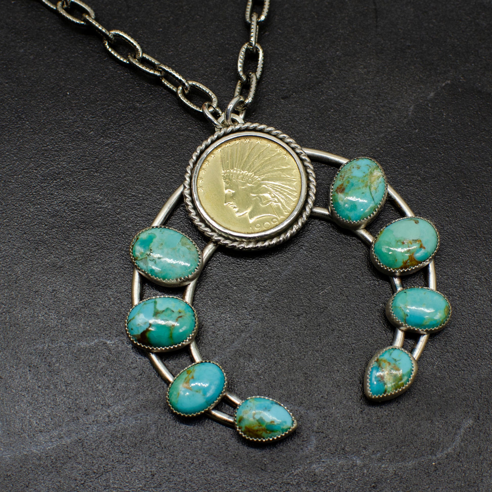 -This necklace features a large Native American Liberty Coin replica surrounded by bezel set turquoise.