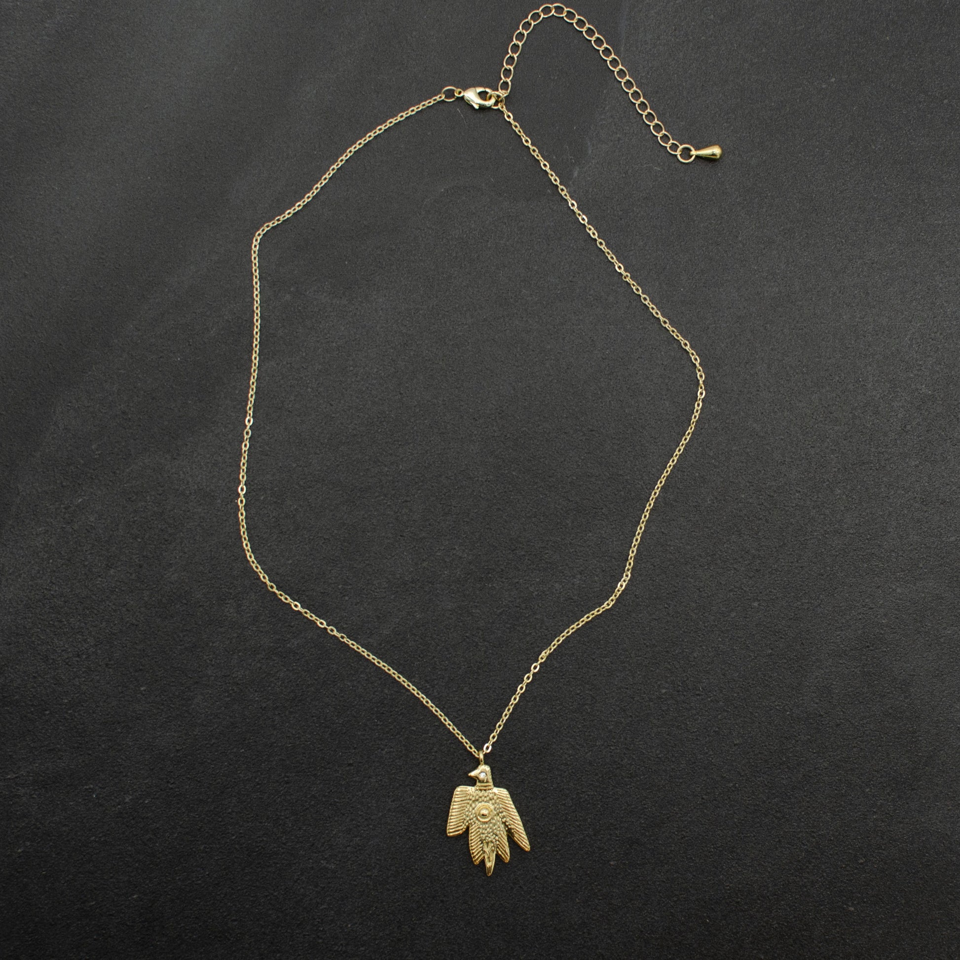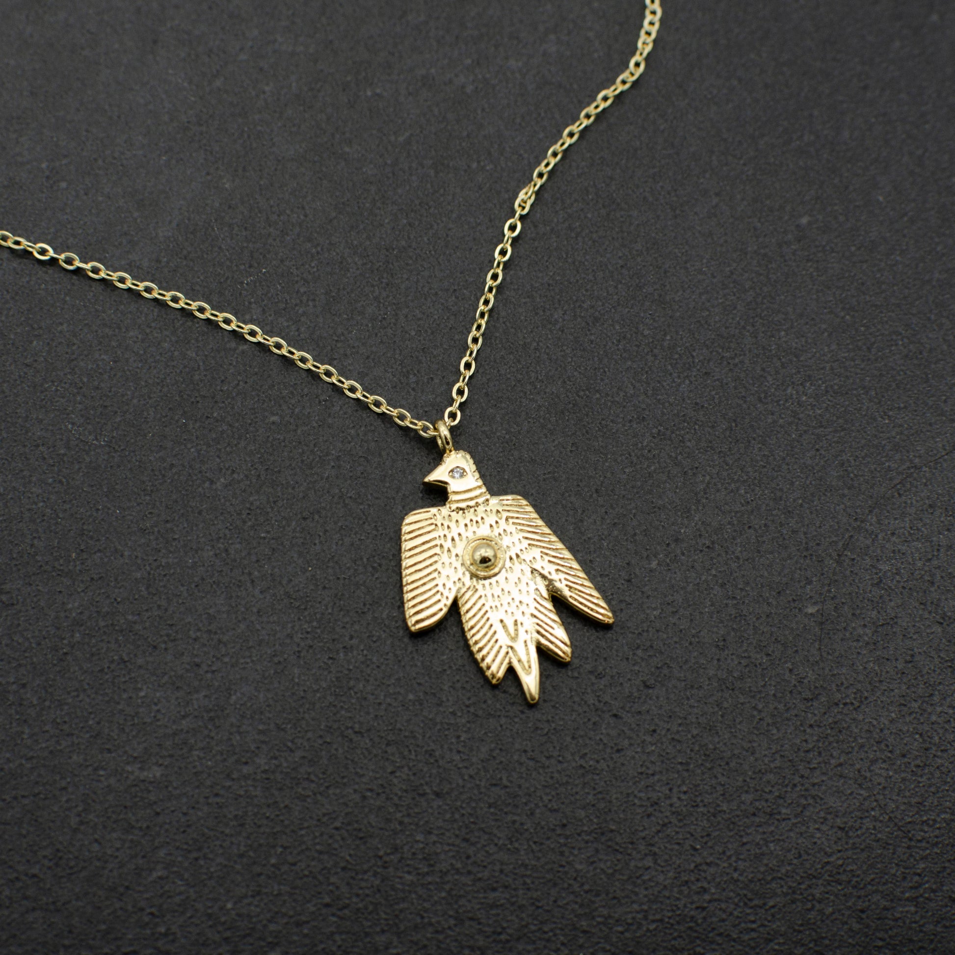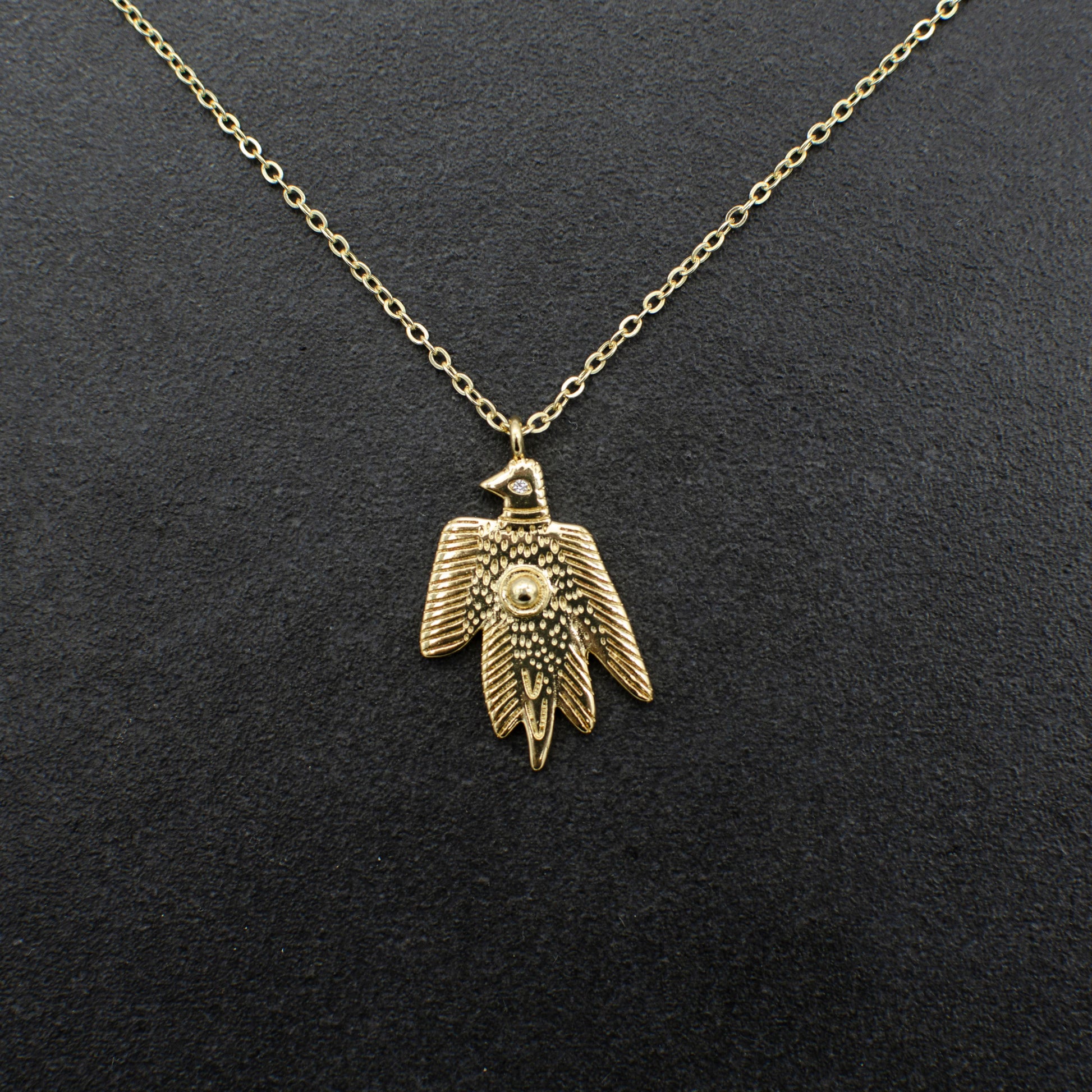 -14k gold plated bird pendant with flush set cubic zircon faceted stone accent.