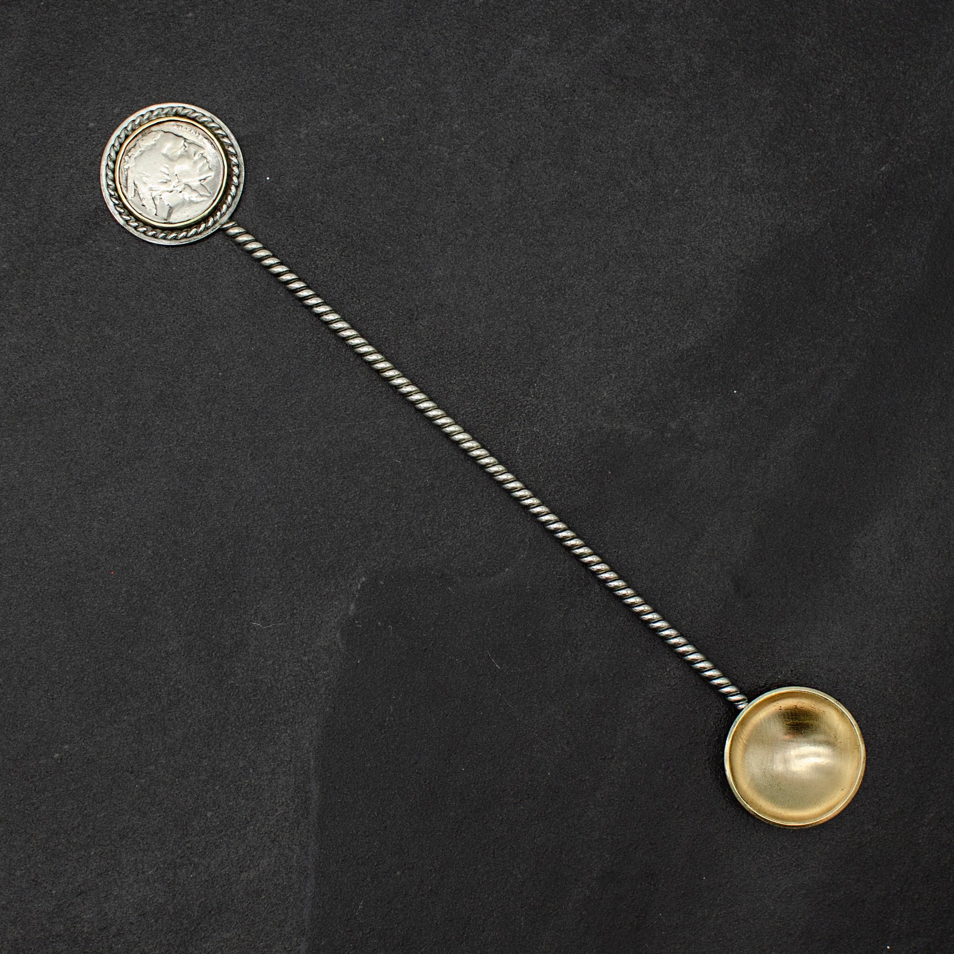 One of a kind handmade sterling silver and brass cocktail/coffee stirring spoon with authentic buffalo nickel. 12" long. Measures teaspoons for mixing.