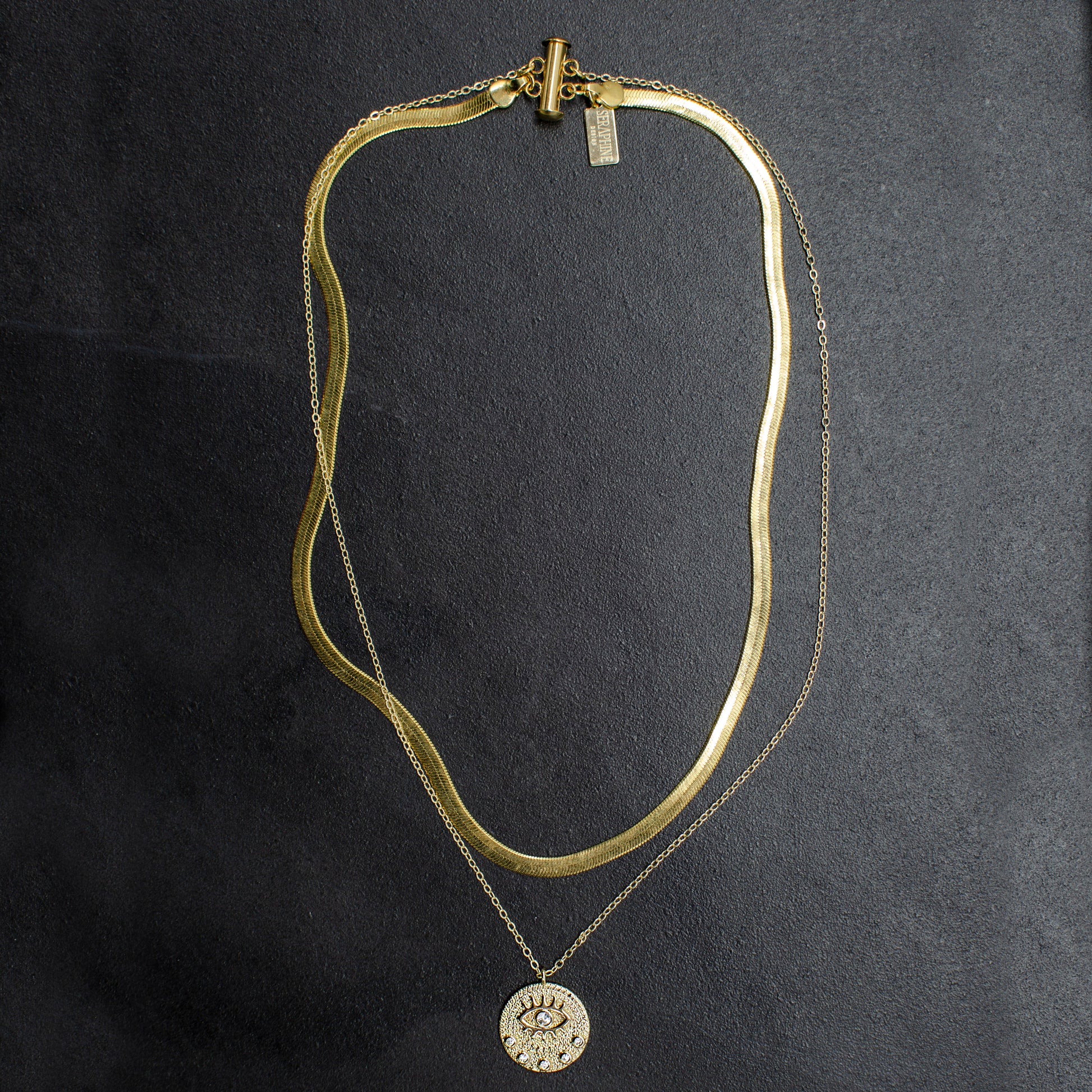 In 14k gold plate with evil eye coin with cz stones on a dainty link chain paired with herringbone/snake chain. Chains measure apx. 18", 20".