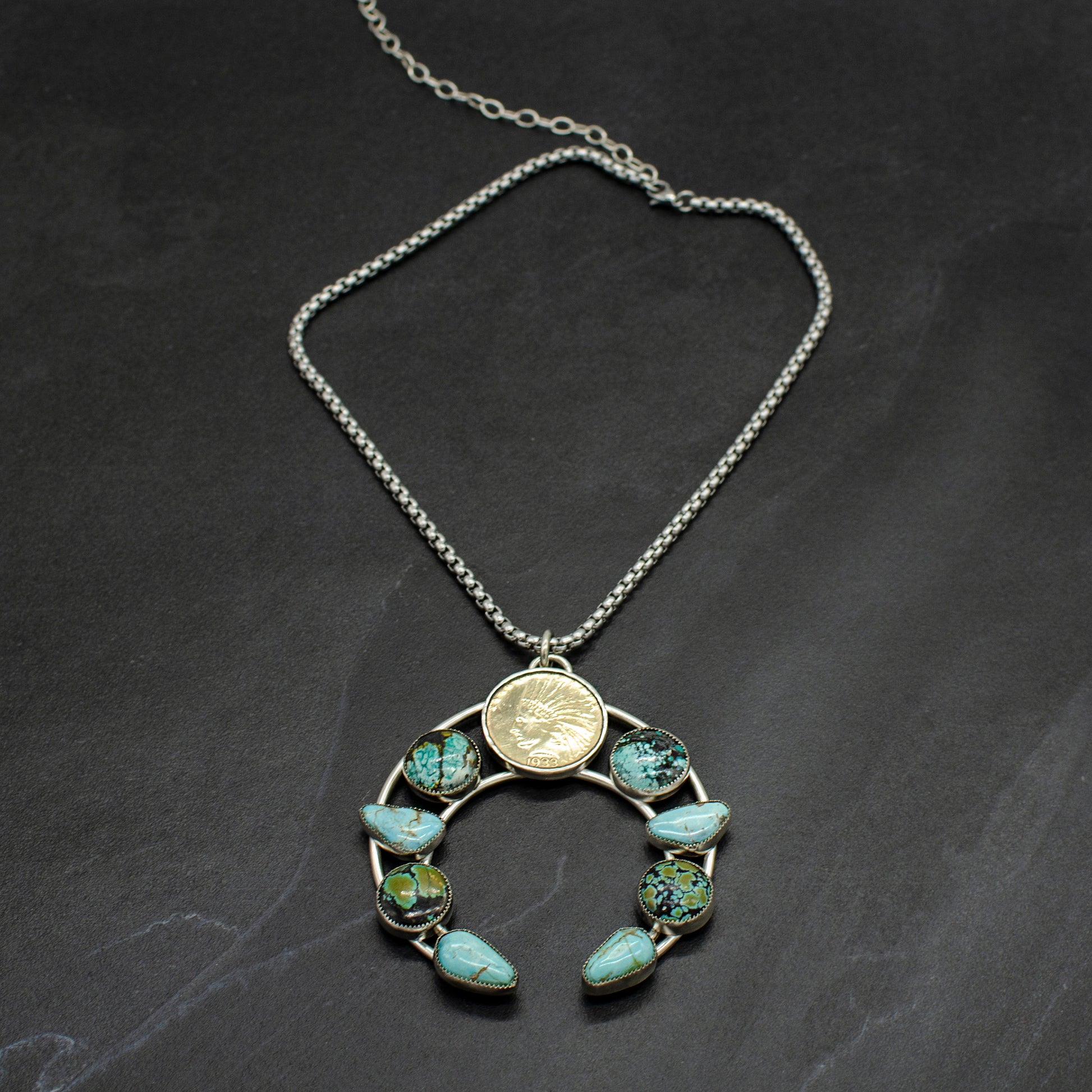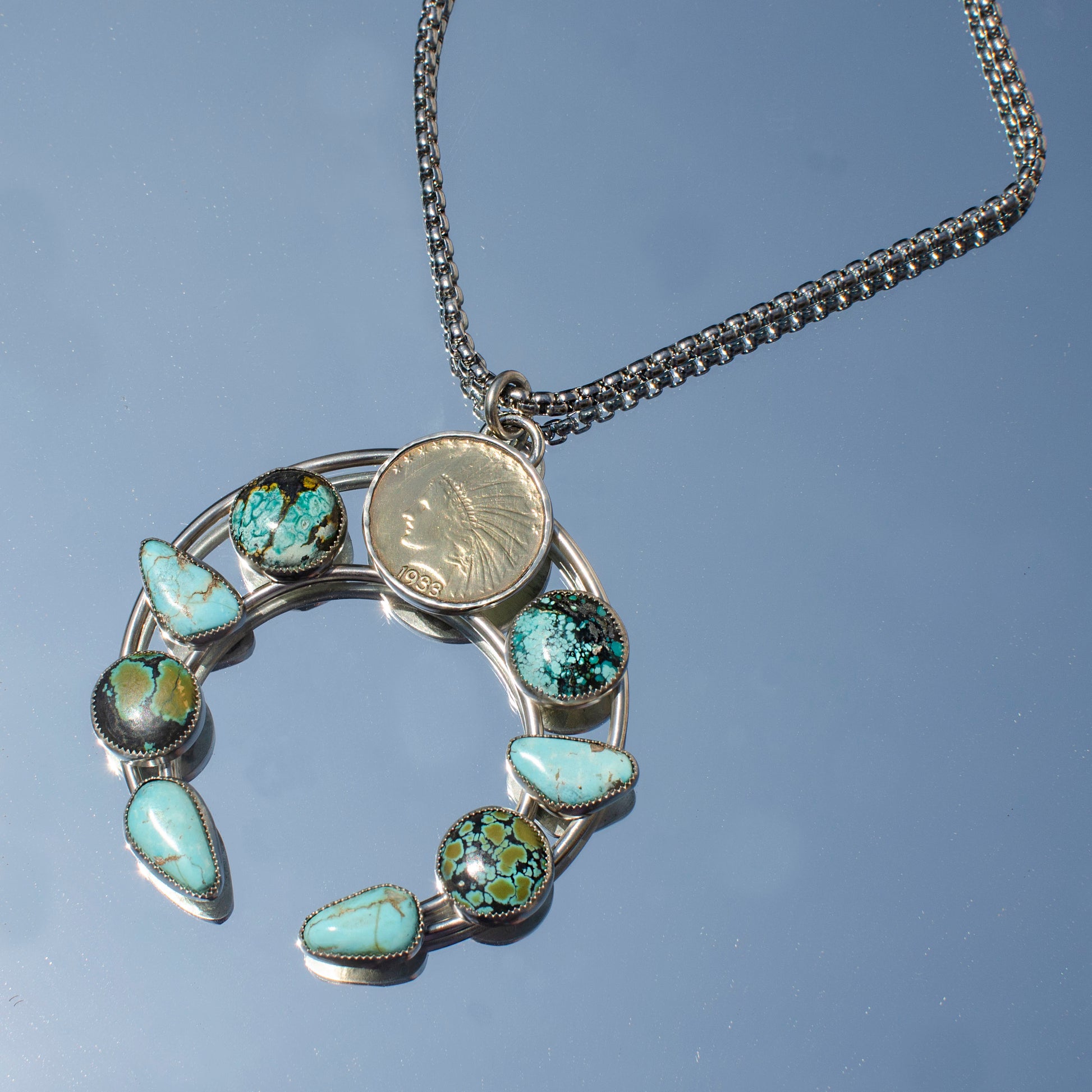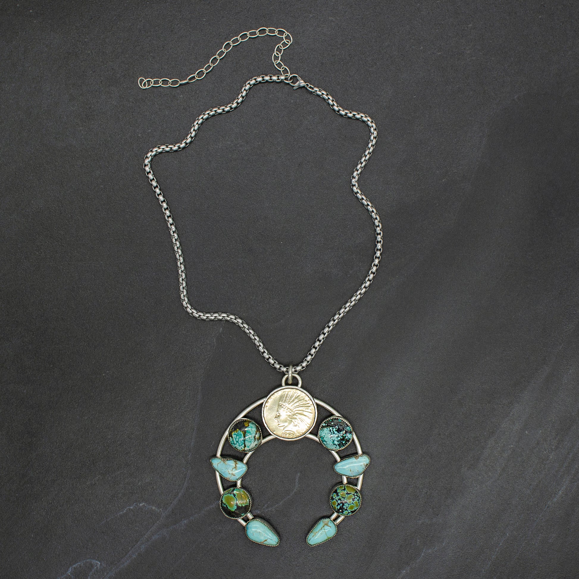 -This necklace features a large Native American Liberty Coin replica surrounded by bezel set turquoise.