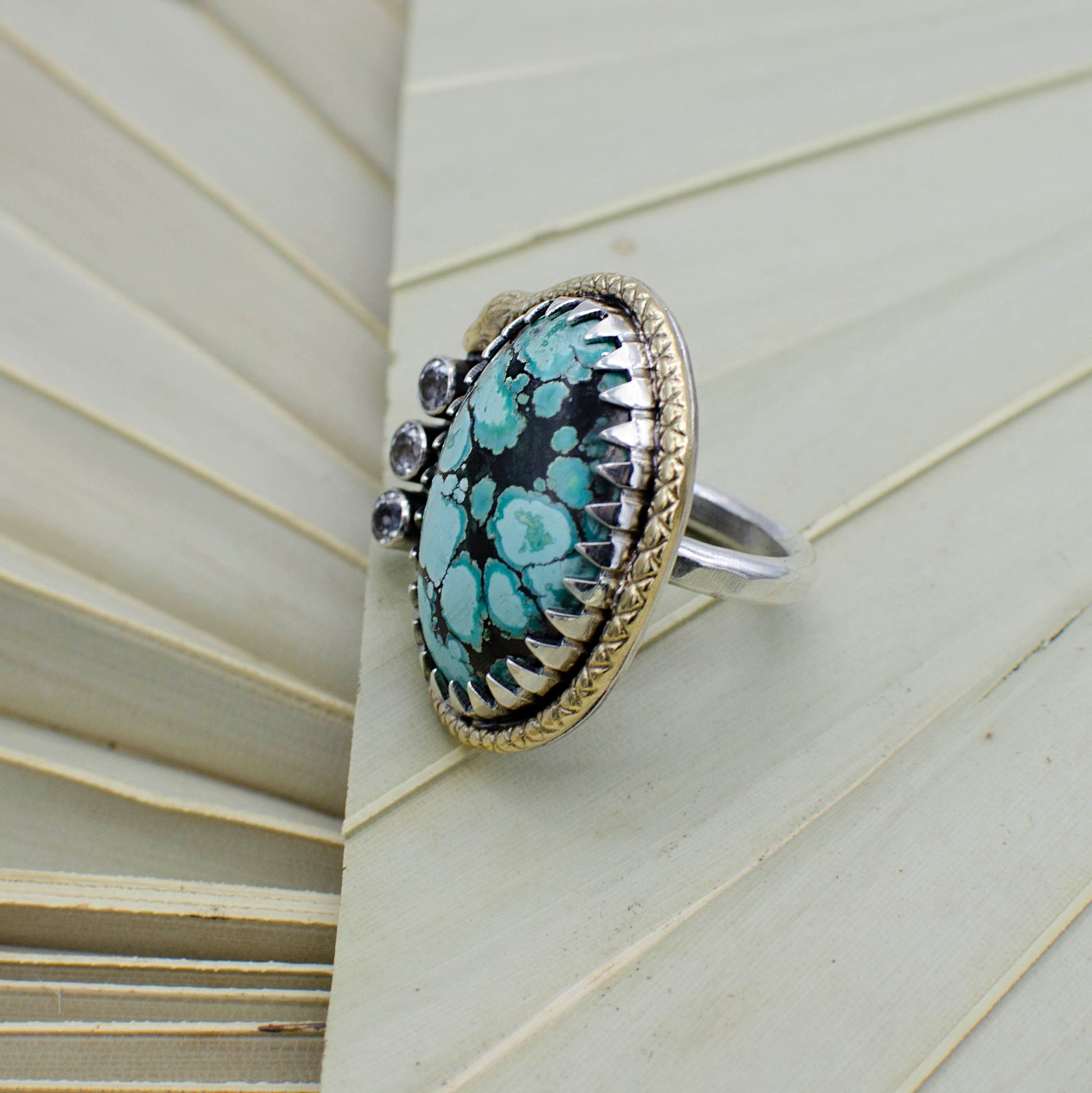 -Handmade sterling silver snake ring featuring a Tibetan turquoise stone and three 4mm white topaz accents stones.