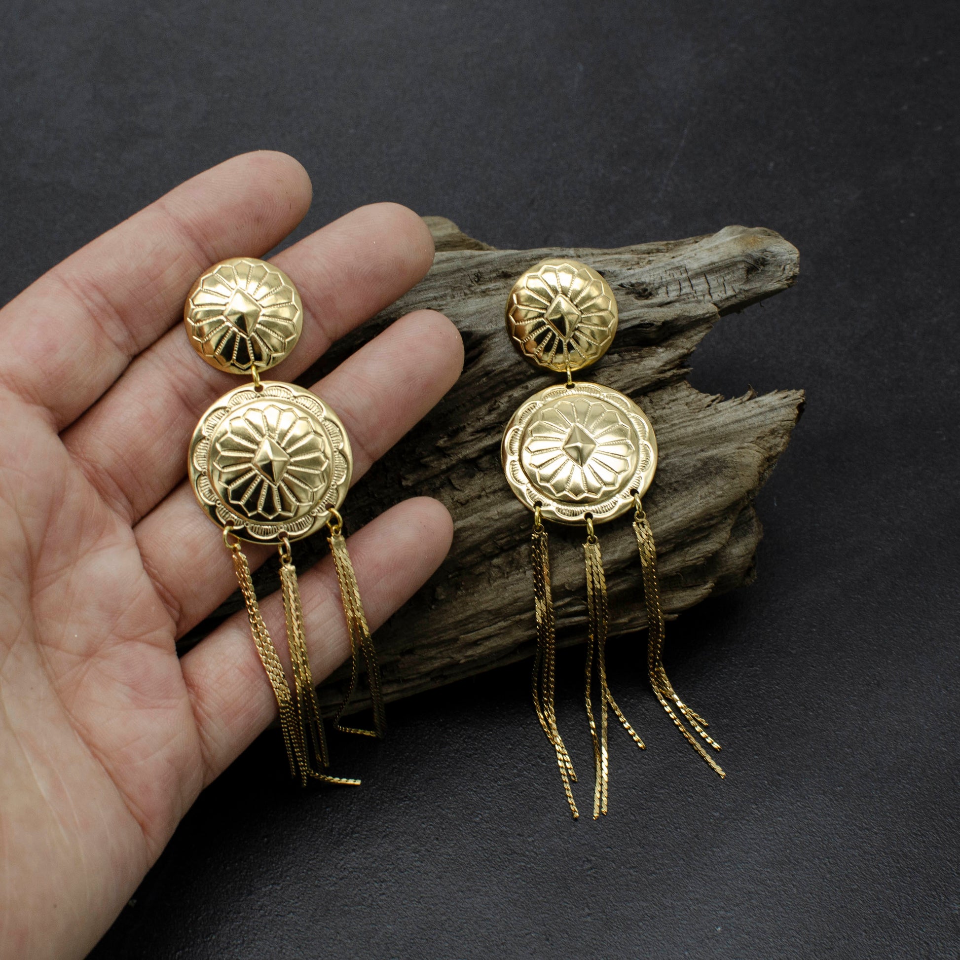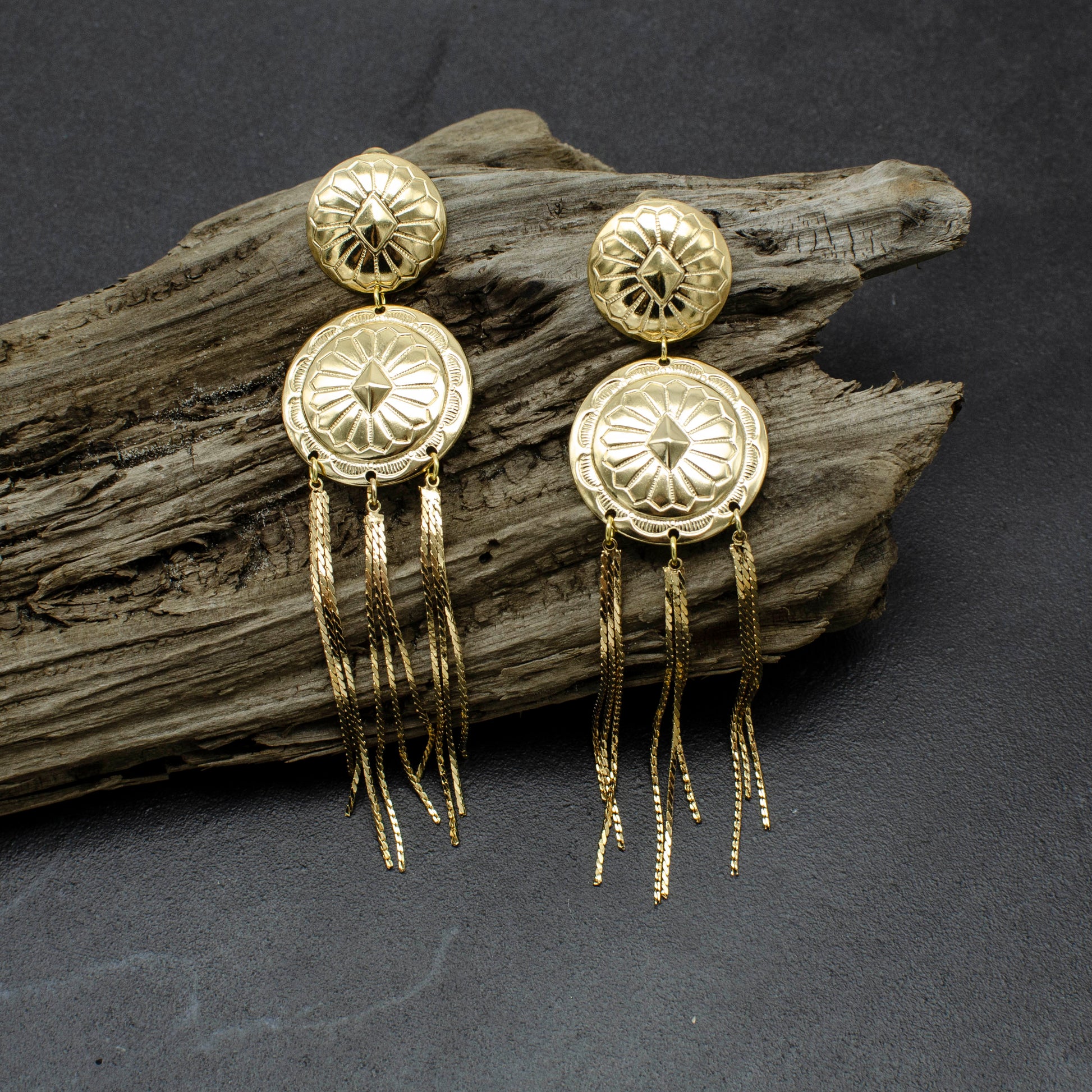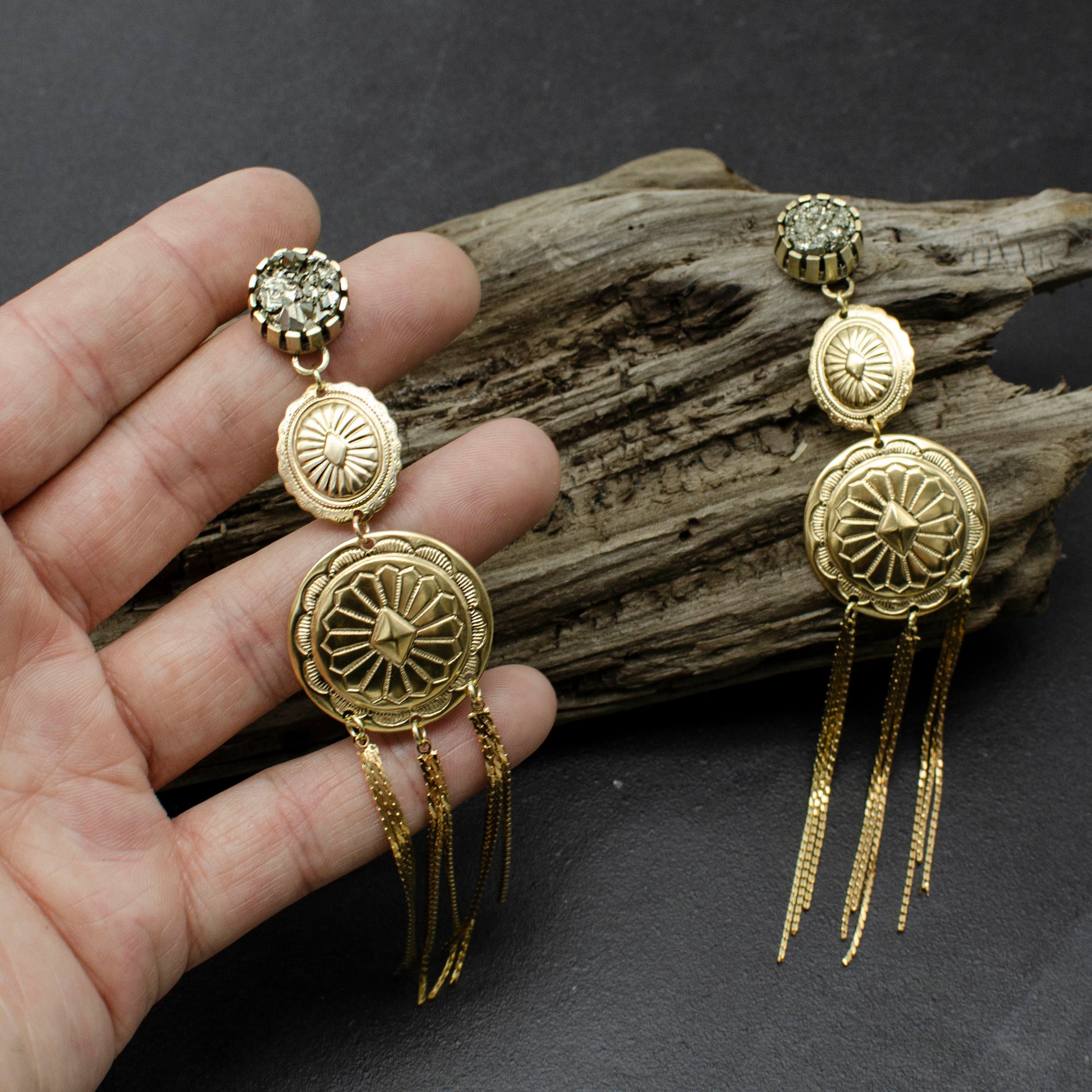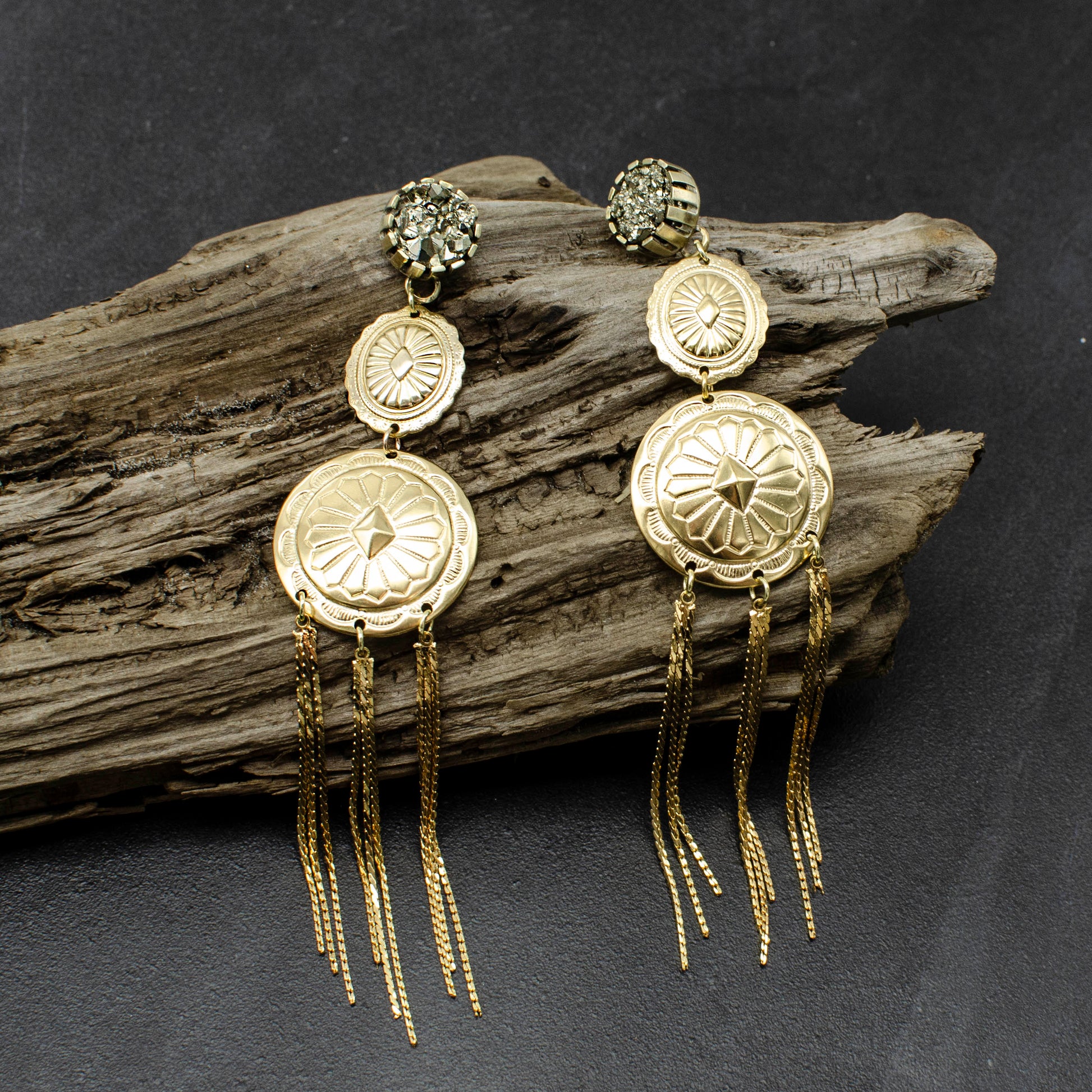 Elevate your style with our Modern Western Cosmic Concho Earrings, handmade in Nashville. Plated in 14k gold for lasting brilliance, they feature sleek metal fringe and contemporary concho accents with or without Peruvian pyrite stones. Available in brass too, with sterling silver posts for effortless wear.
