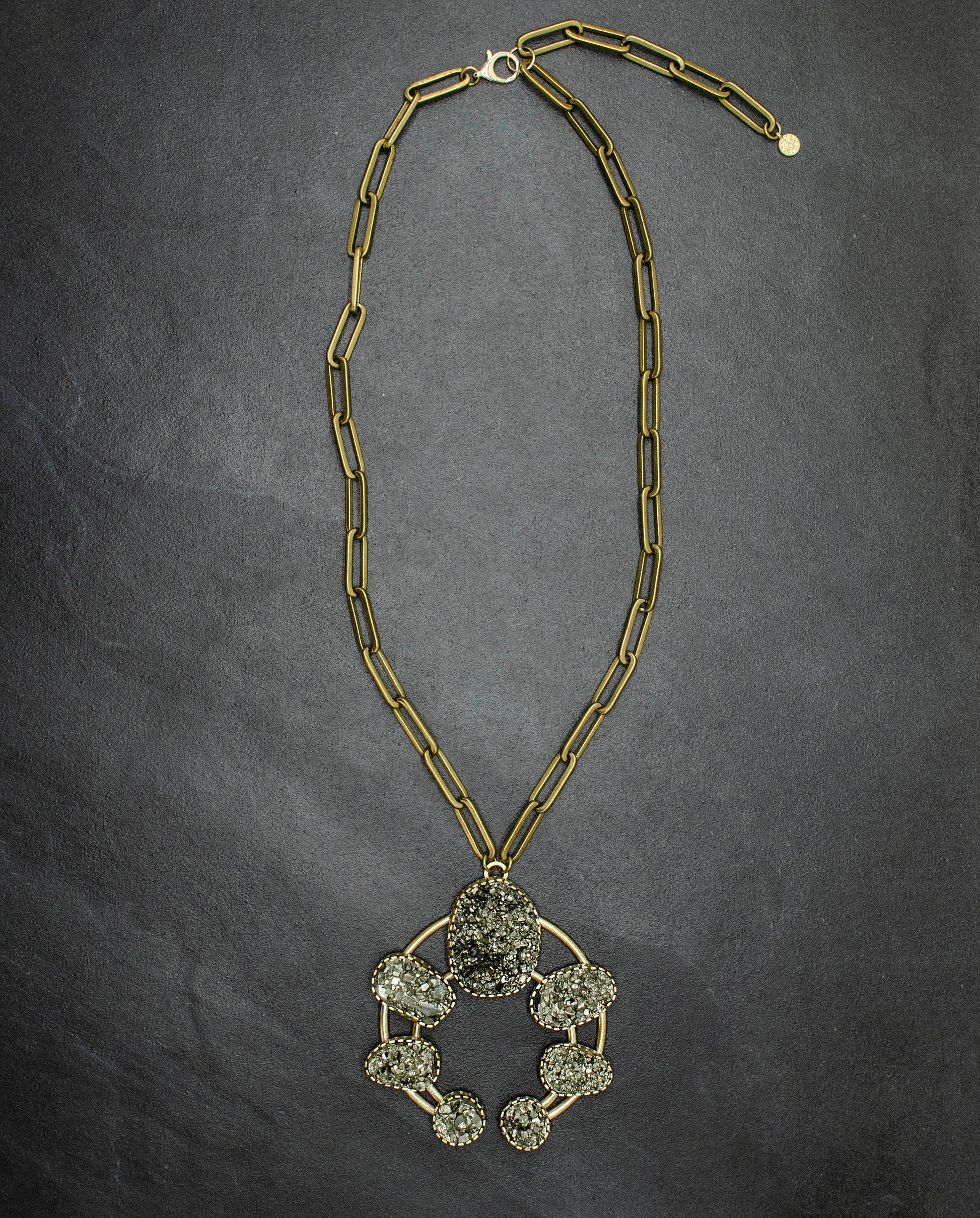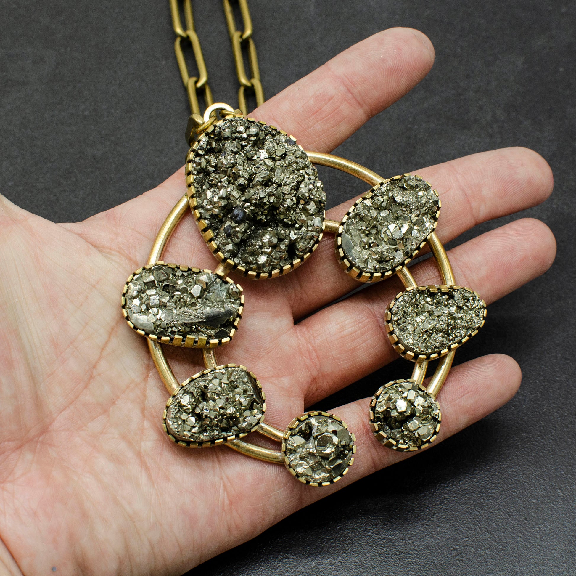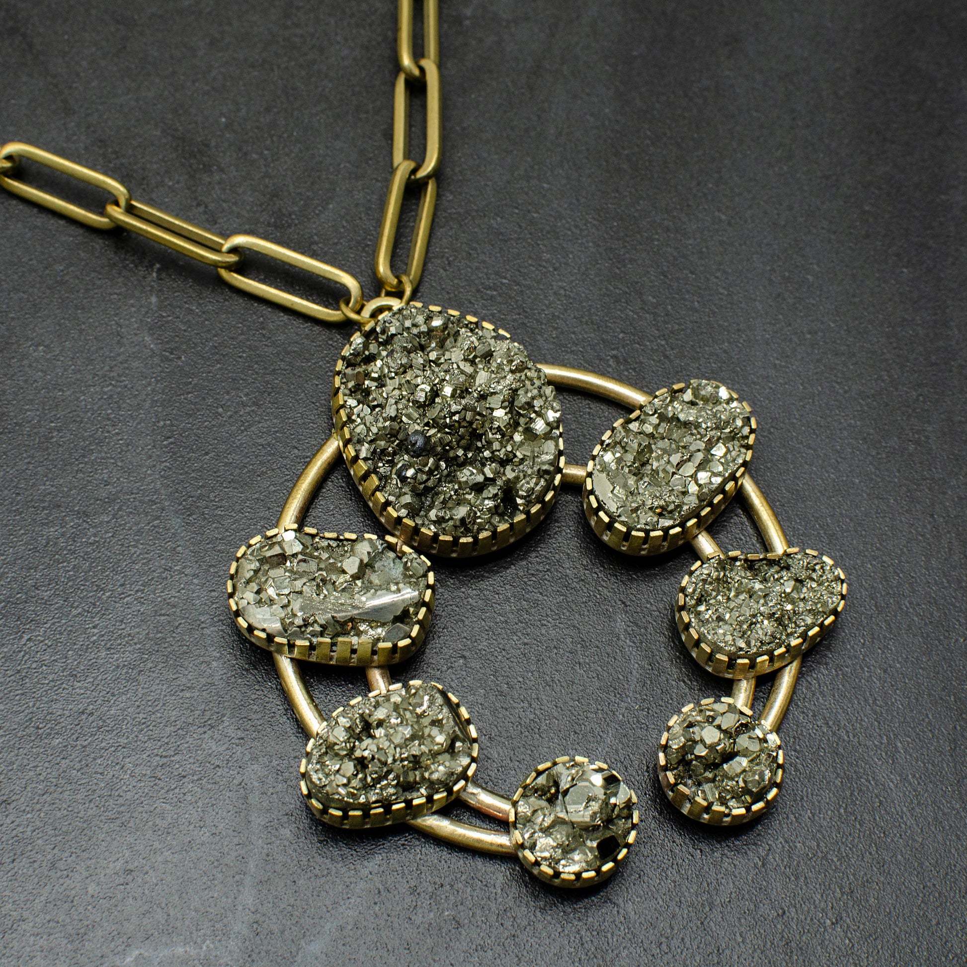 Introducing the Peruvian Pyrite Squash Blossom necklace, a contemporary take on Native American squash blossom craftsmanship. Handmade in jewelers brass, it features six striking pyrite stones on a 22-inch brass paperclip chain. Worn by Grammy Award-winning country star Lainey Wilson in an ad for Coors Beer's new bourbon whiskey "Barmen 1873," this necklace exudes West Nashville style. Own a unique piece worn by one of country's hottest stars.