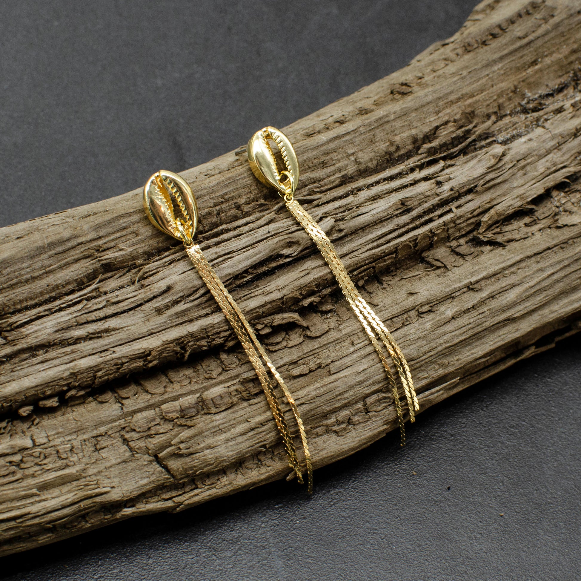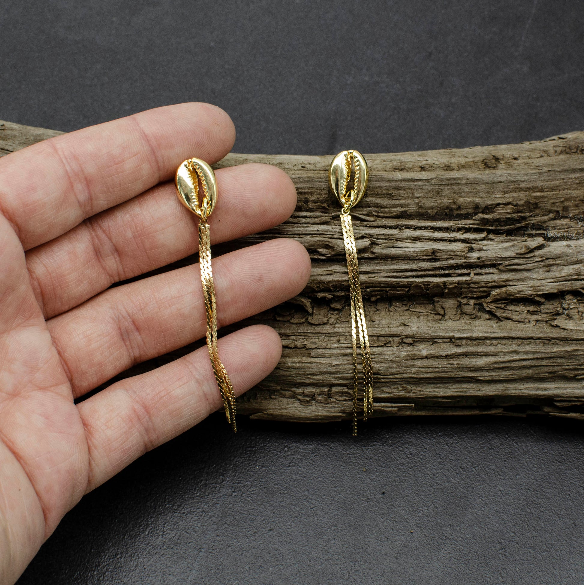 Gold plated cowrie sea shell drops with chain dangles, handcrafted in Nashville, offer a fusion of natural elegance and contemporary style. Crafted from gold plated brass, they exude a subtle sophistication suitable for everyday wear. The option of silver plated or 14k gold plated brass allows for personalization, catering to individual tastes. Perfect for adding a touch of beach-inspired charm with a modern twist to any ensemble, these unique accessories effortlessly elevate your look.