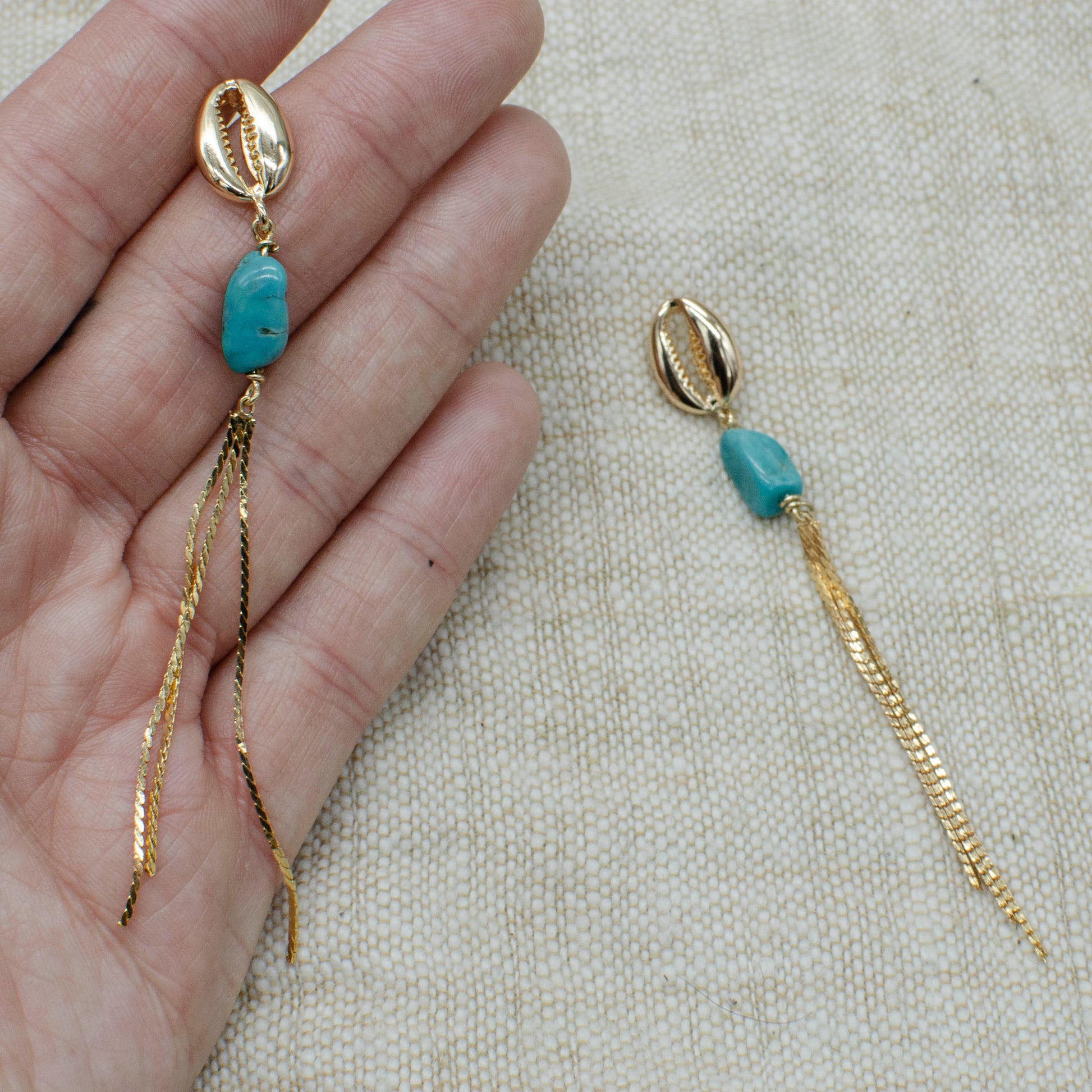 These handcrafted earrings blend coastal charm with a hint of Western flair. Featuring natural cowrie shells paired with vibrant turquoise drops, each earring is finished with a delicate 14k gold-plated tassel for a subtle, eye-catching shimmer. Perfectly lightweight for all-day wear, these earrings are a fresh take on Coastal Cowgirl style. Handmade in Nashville and ready to ship for Christmas, they’re a unique and memorable gift that speaks to natural beauty and effortless elegance.