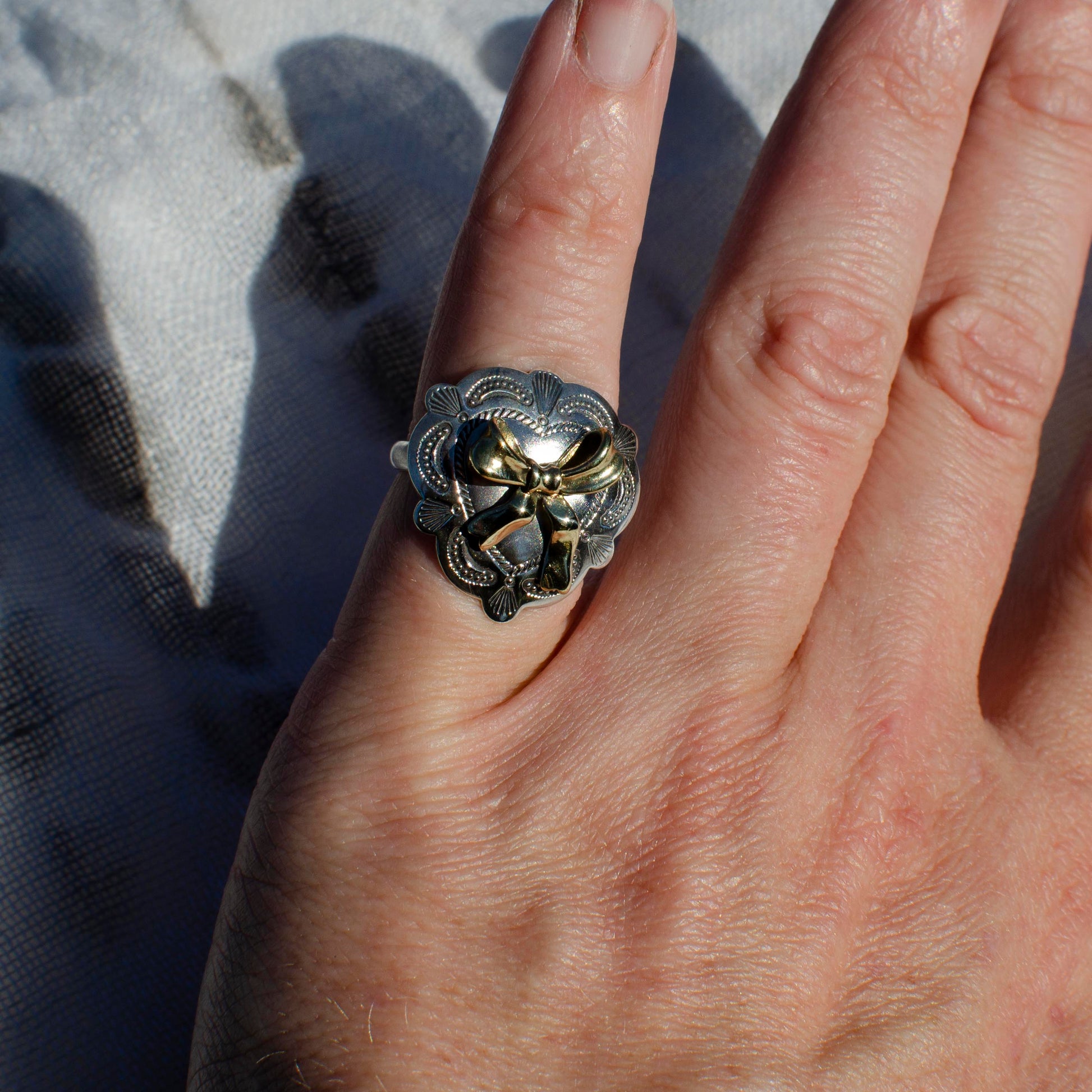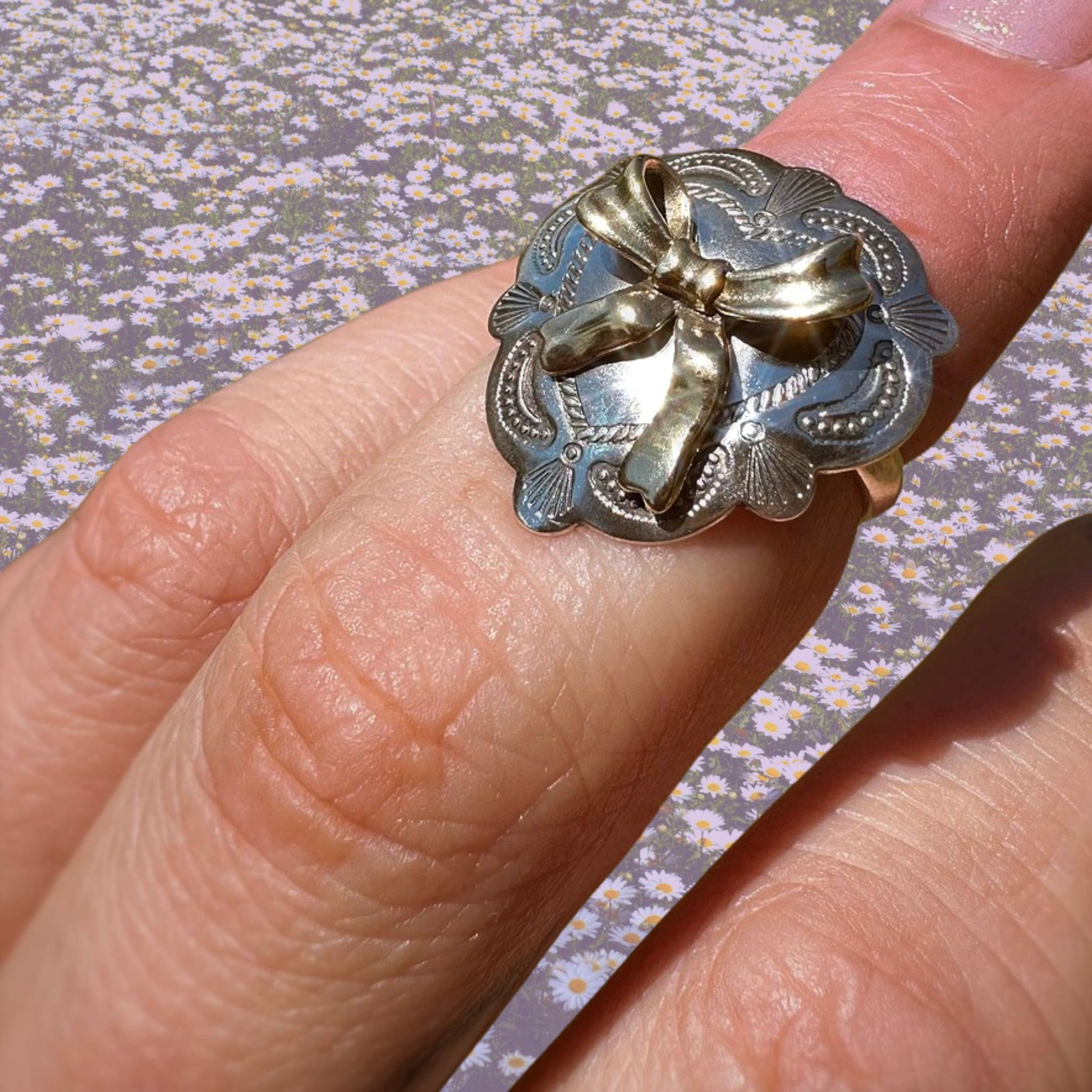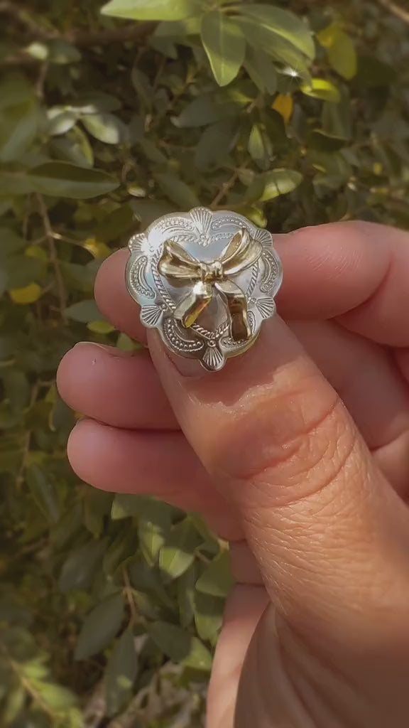 This charming handmade ring features a Western-inspired concho stamped heart, crafted in sterling silver and paired with an elegant brass bow. Finished with a high-shine polish, this piece is a perfect blend of rustic charm and modern style, embracing the current bow trend. Available in sizes 5-10, each ring is made to order with care. Please allow 1-3 days for production and 1 day for shipping preparation. This adorable design is versatile and makes a statement, whether you're dressing up or down!