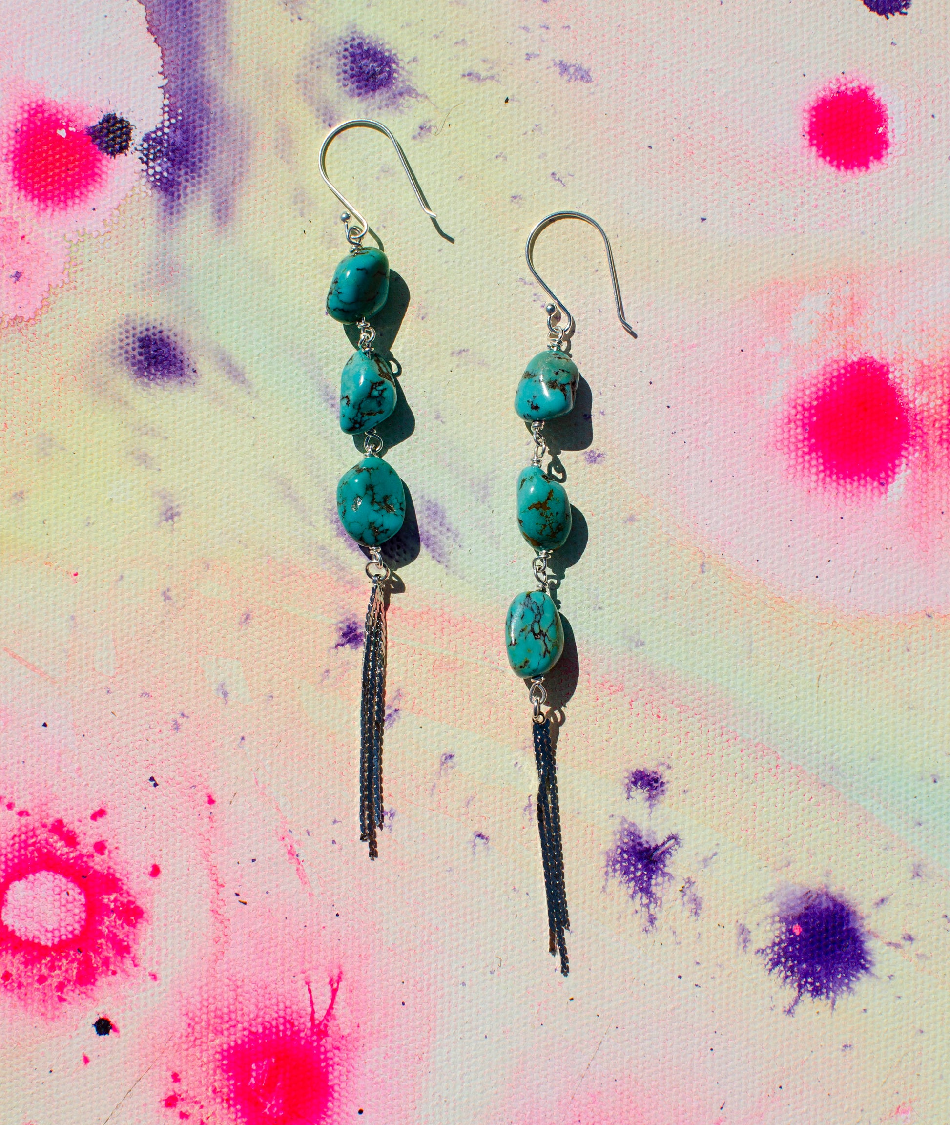 Effortless Western style with a touch of shine. These handmade earrings feature natural turquoise nuggets paired with sleek sterling silver tassels for subtle movement and sparkle. Lightweight and versatile—perfect for everyday wear or dressing up.