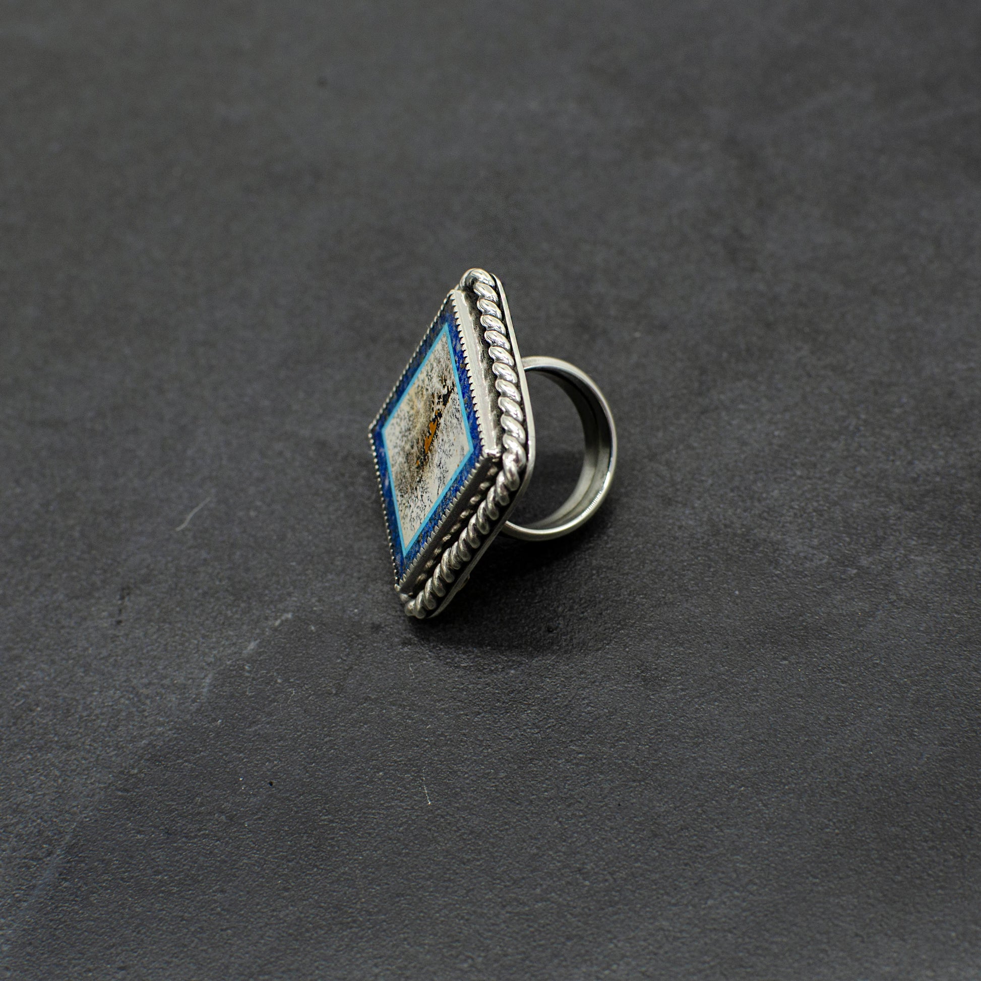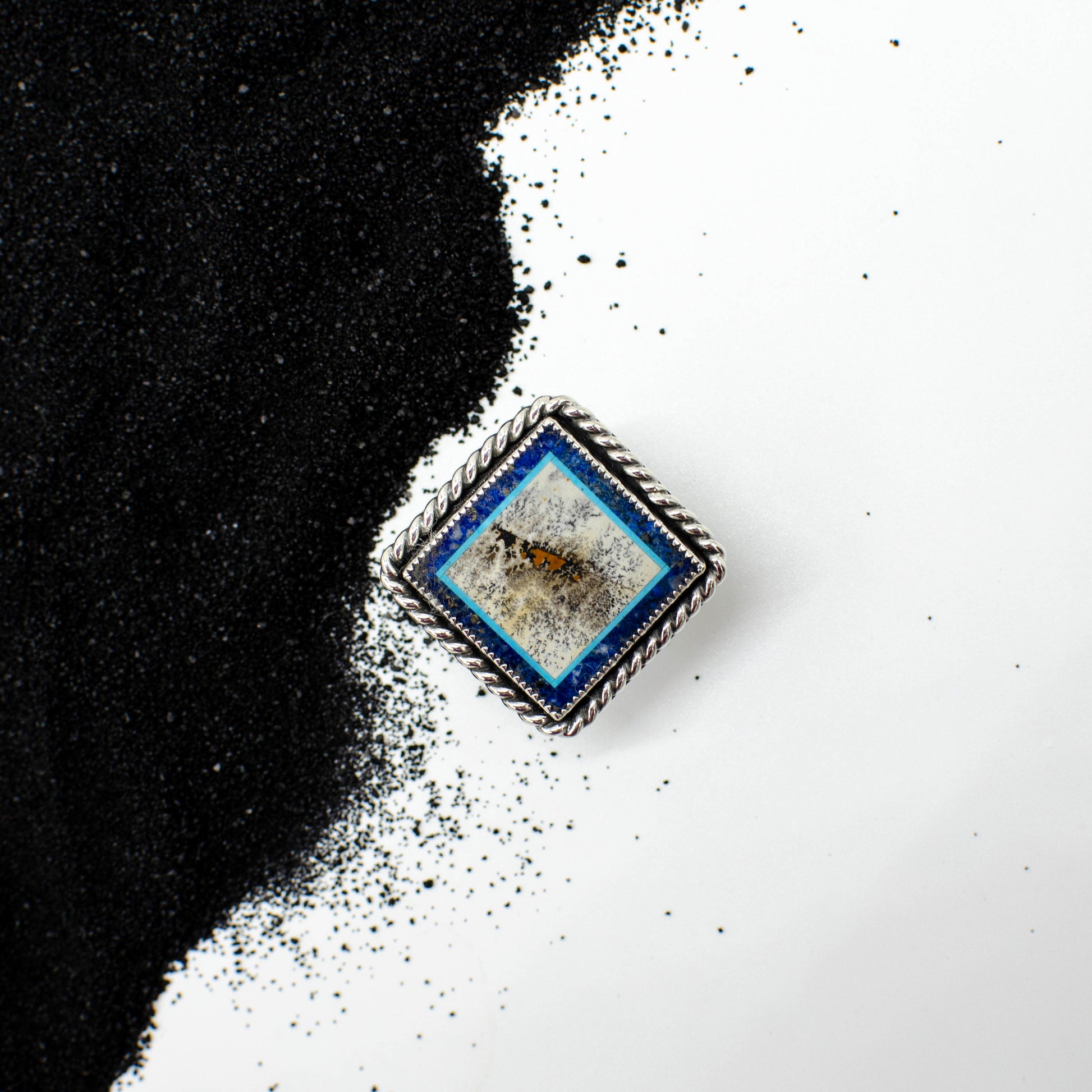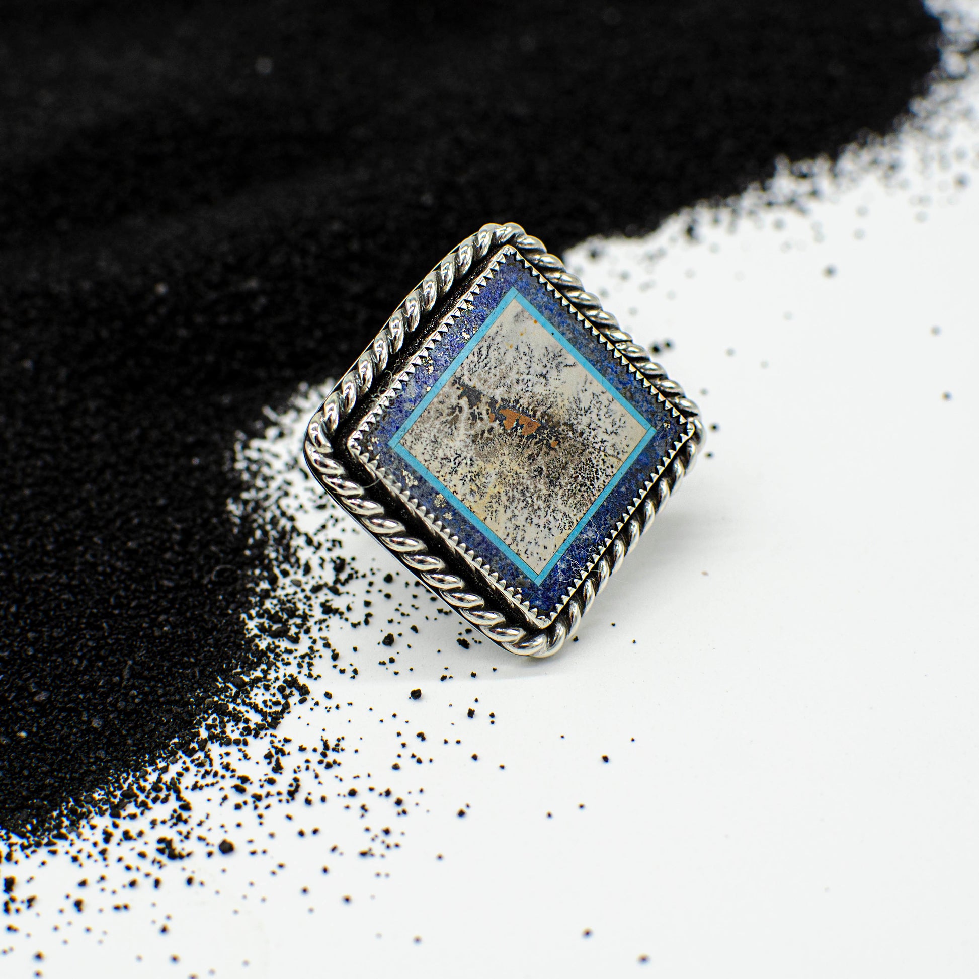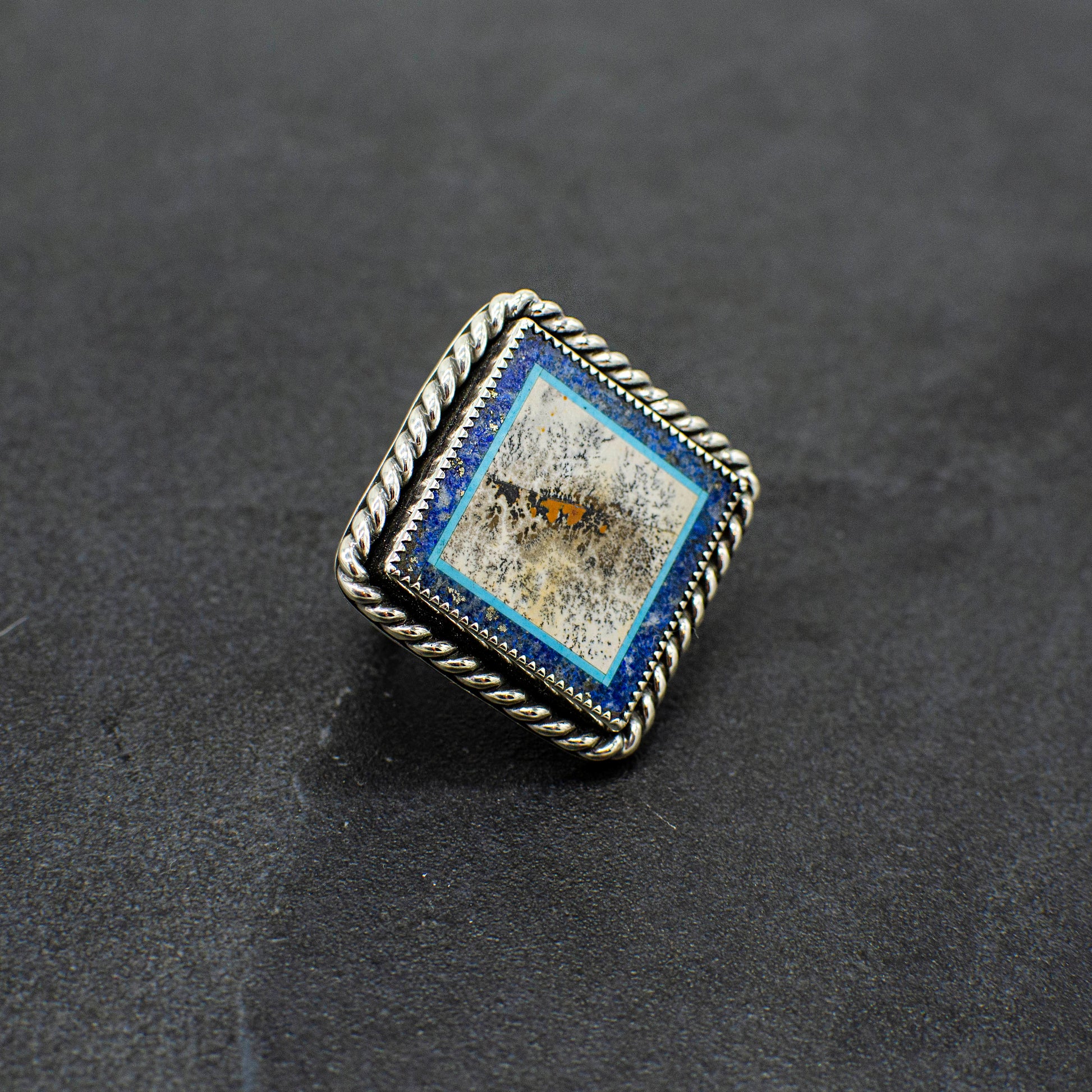 Handmade sterling silver ring with decorative bezels and a diamond shaped inlay cabochon made up of lapis lazuli and Chohua Jasper. Hand hammered ring shank.