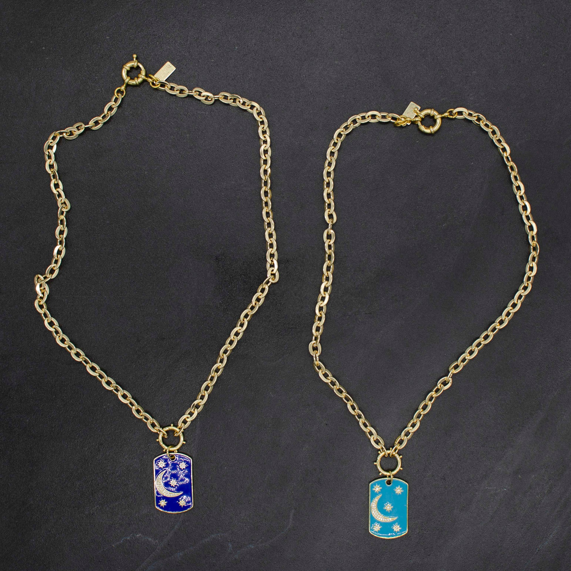 Enamel Moon and stars tag with pave cz stone detail on 14k gold plated chain. This necklace measures 18".
