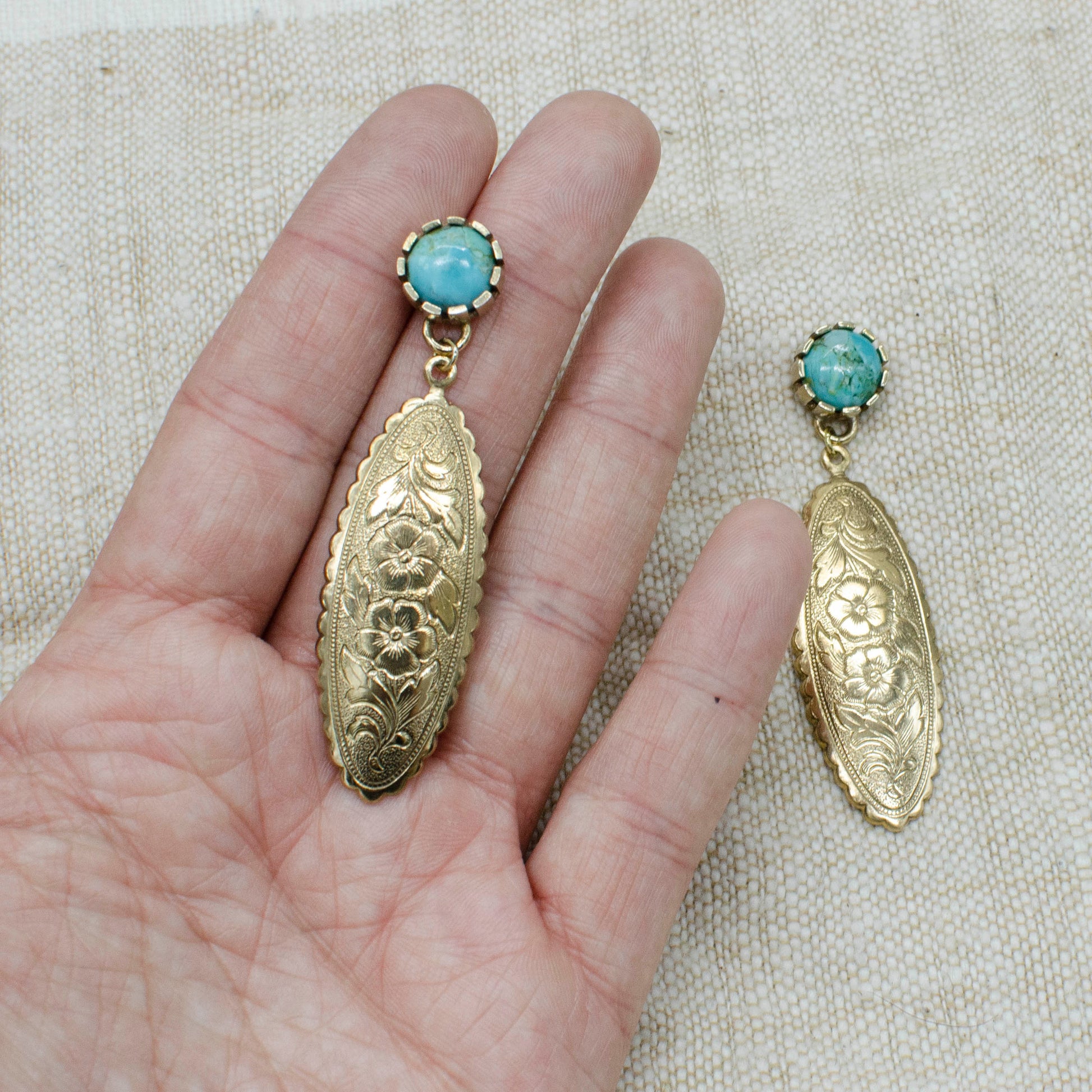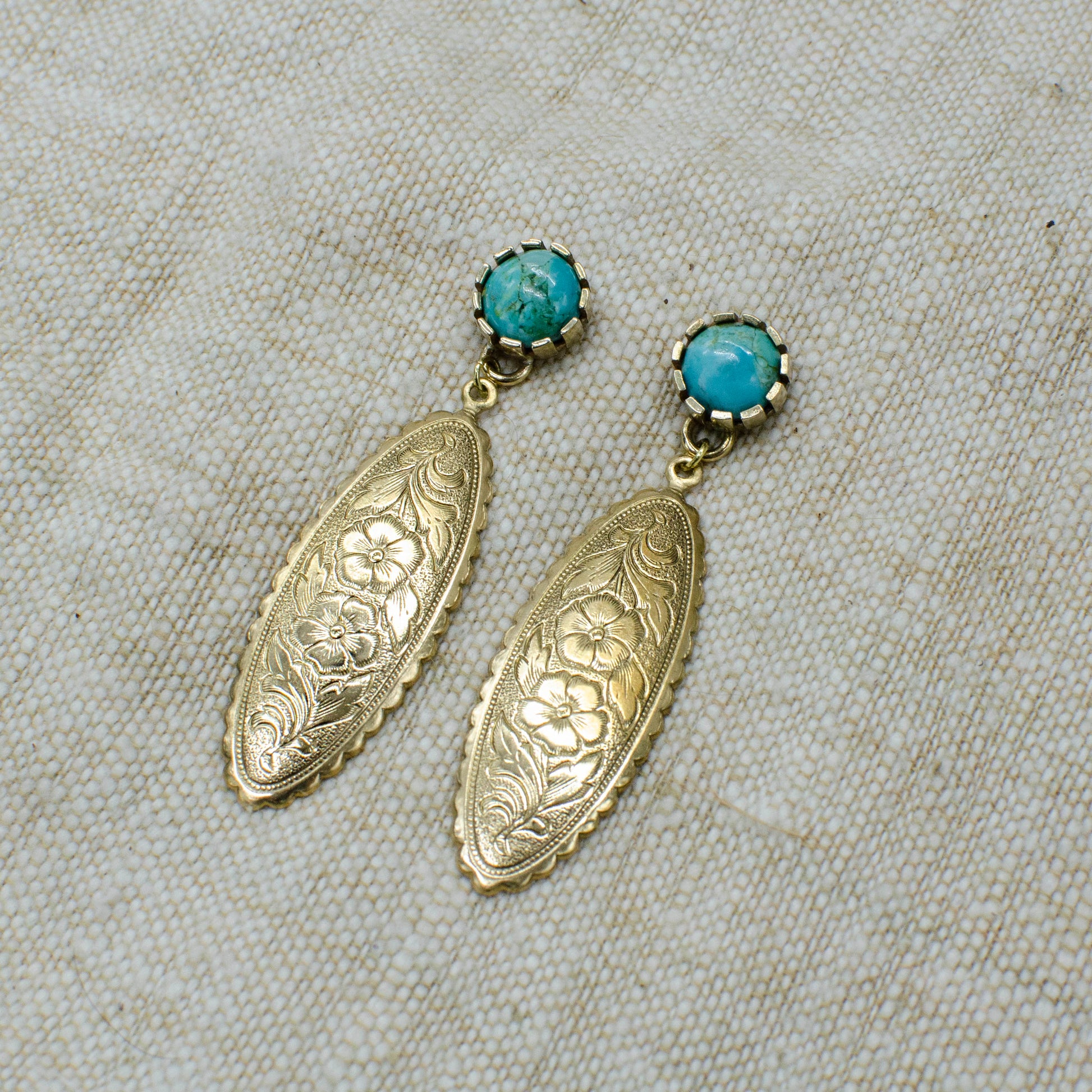 Handmade in Nashville, these Southwest-inspired earrings bring a unique charm with a 10mm Tibetan turquoise cabochon set in beautifully engraved brass dangles. Featuring an elegant floral design, each pair is crafted with a medium weight for comfortable, standout wear. A perfect addition for those who love one-of-a-kind jewelry that combines tradition with a modern flair.