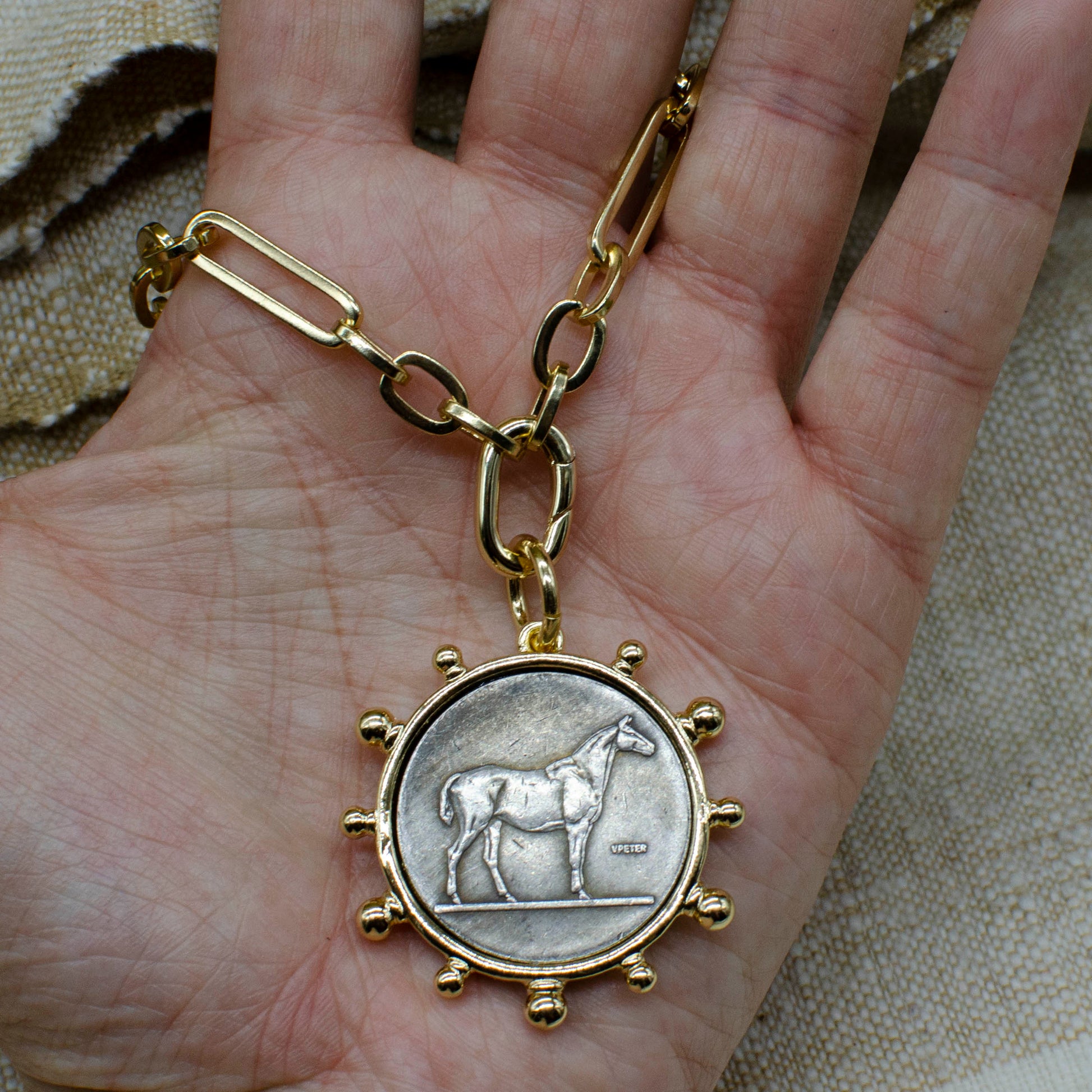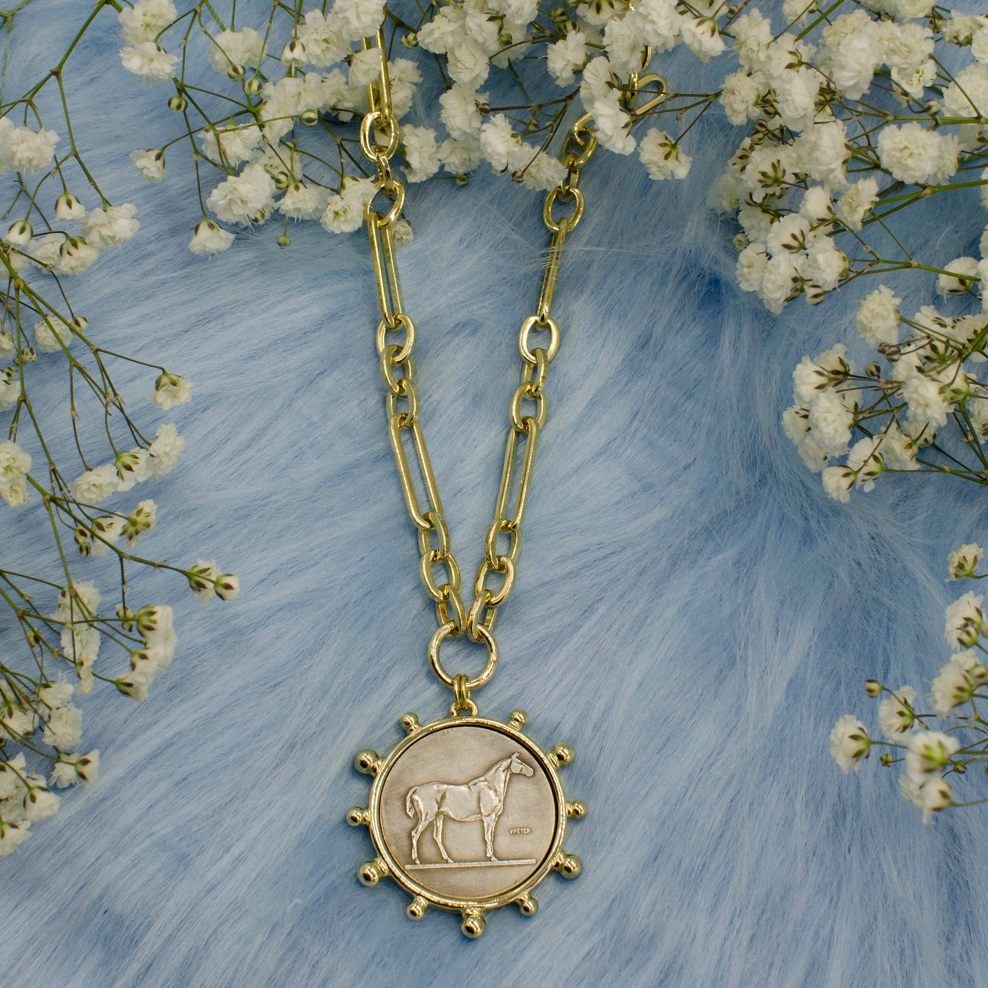 This stunning equestrian-inspired necklace features a beautifully detailed horse coin pendant, crafted in sterling silver and plated with 14K gold. The pendant hangs from a 14K gold-plated link chain, measuring 16" with a 3" extender for a perfect fit. The front clasp opens, allowing you to easily switch out the pendant for a personalized look, while an additional clasp at the back ensures secure wear. Ready to ship, this necklace is a timeless addition to any equestrian lover's collection. Perfect for any horse lover!