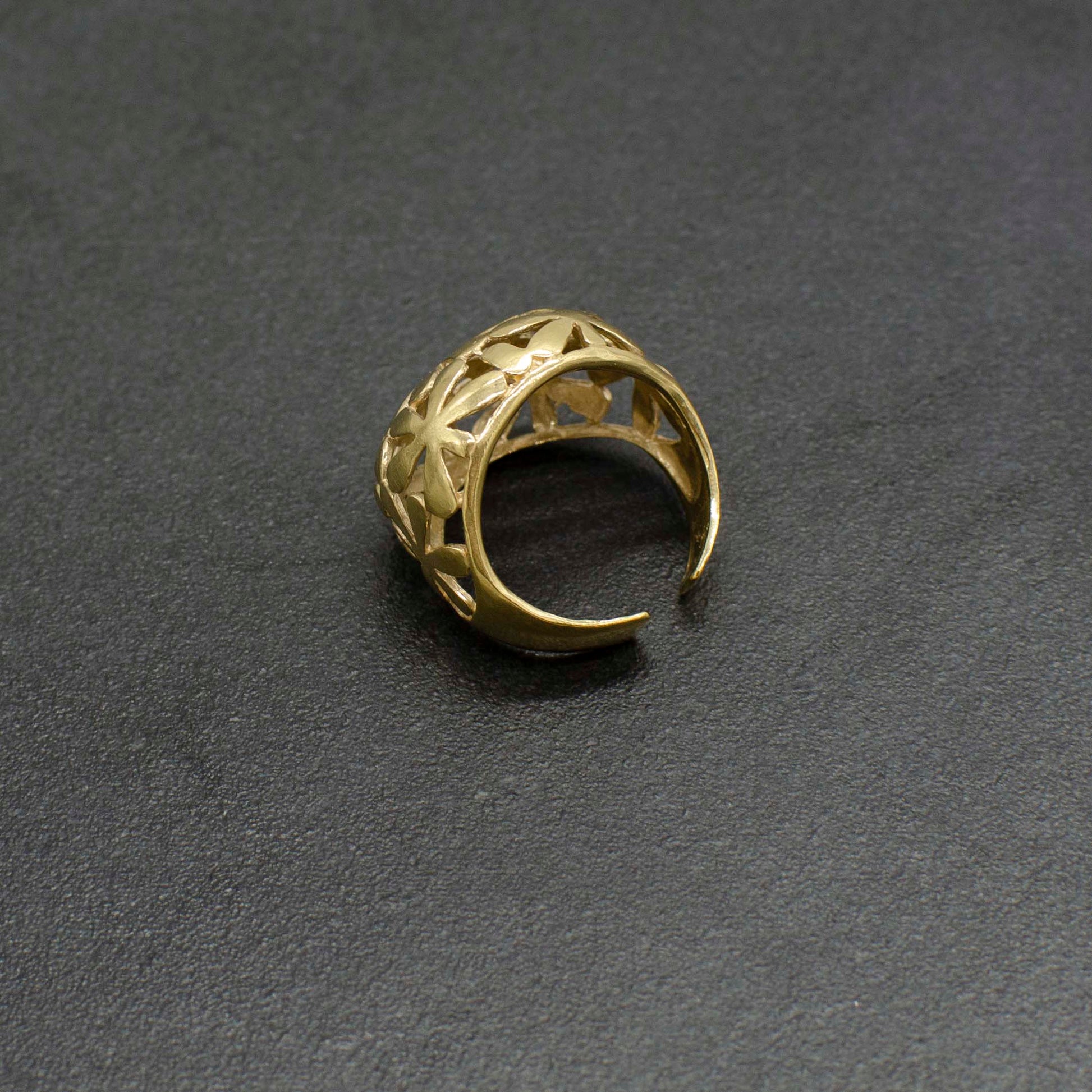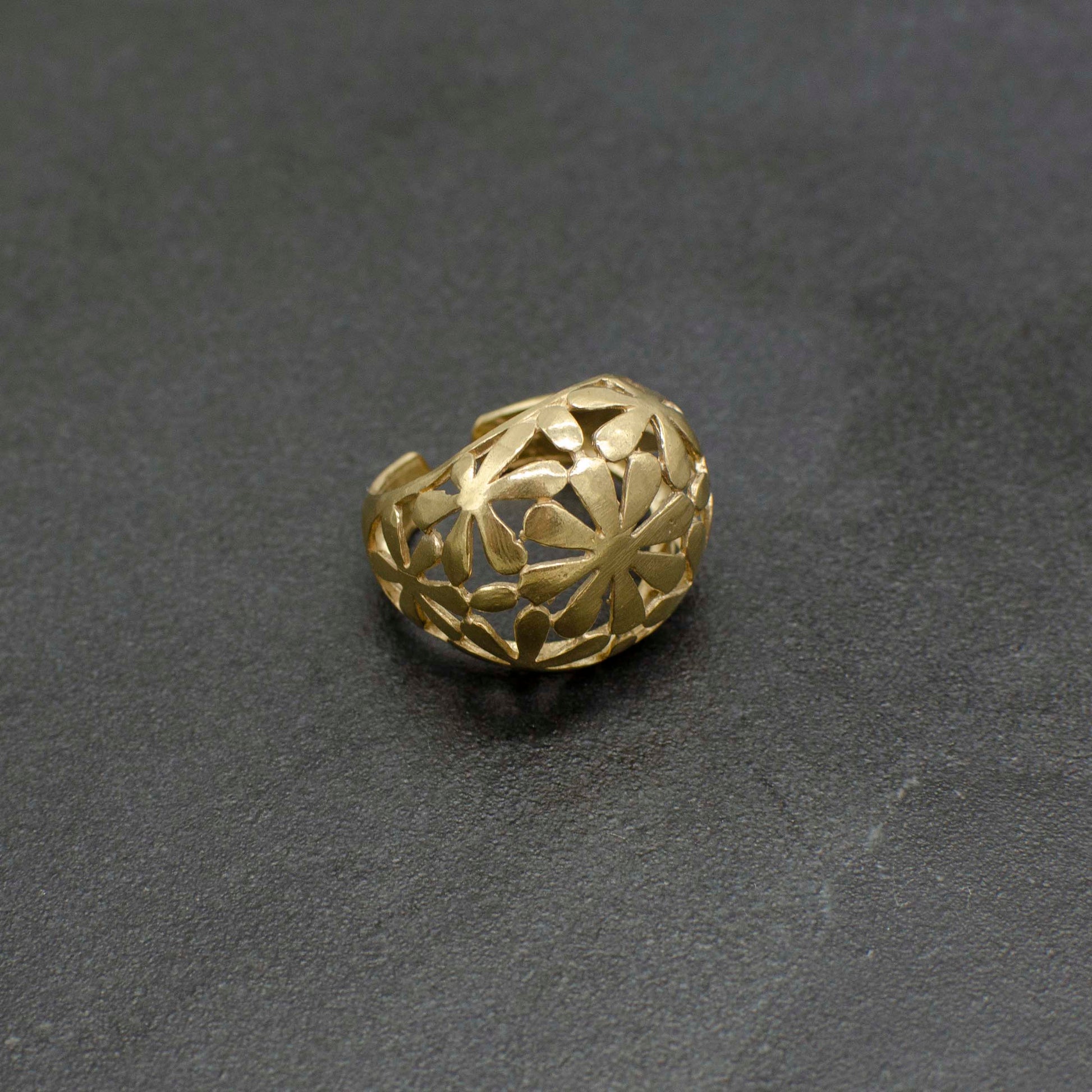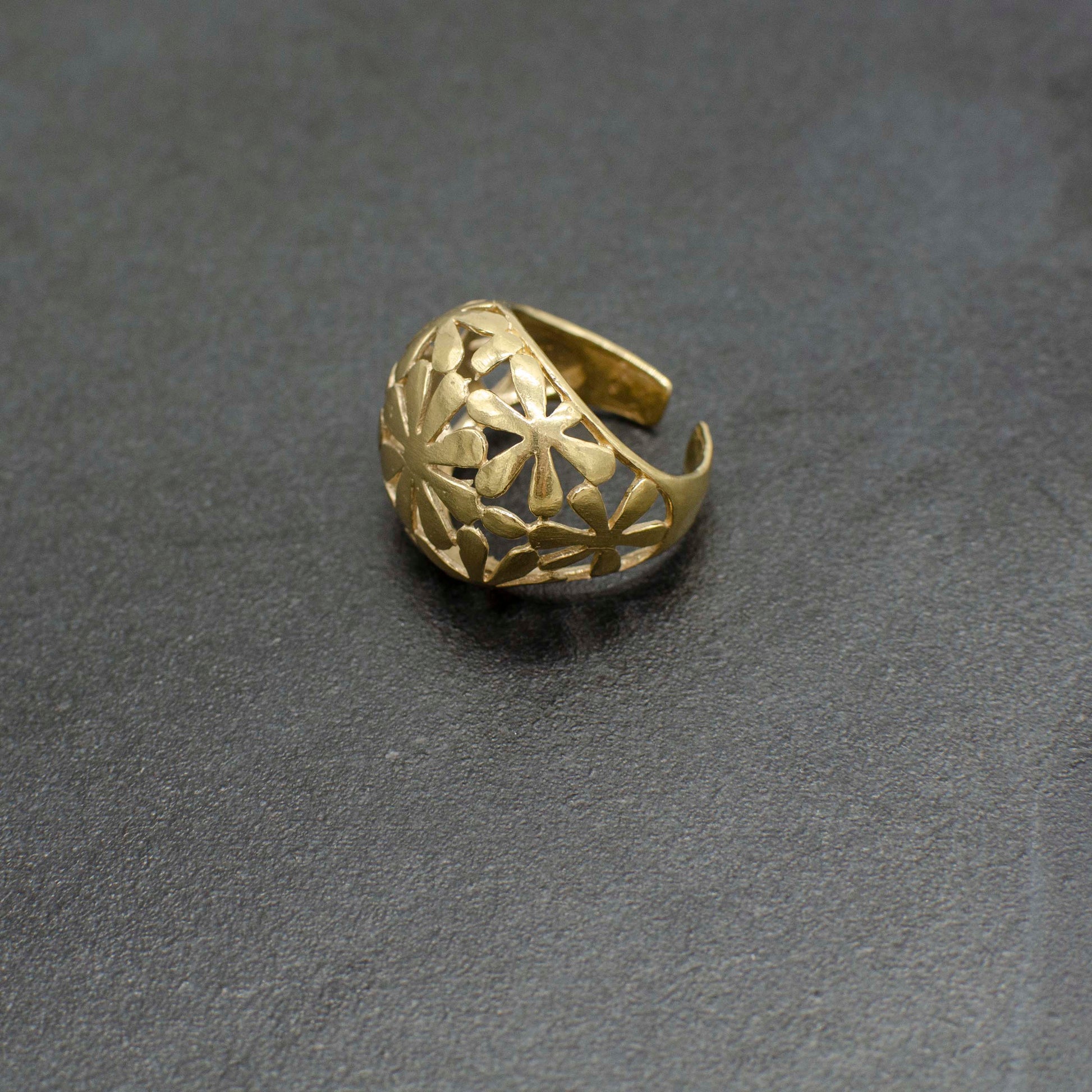 Adjustable casted ring. Made of brass and heavily plated in 14k gold.