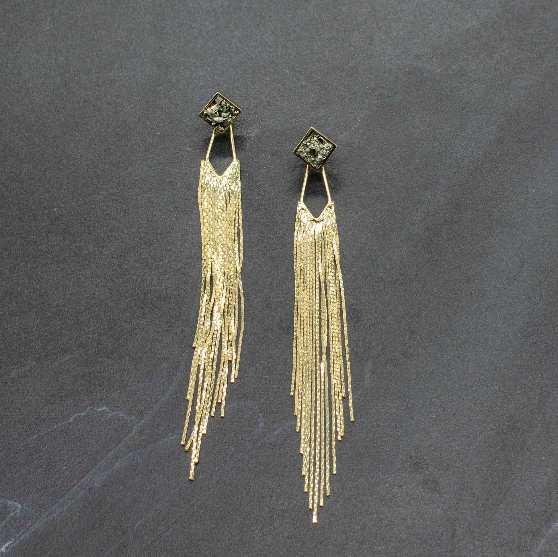 These 14k gold plated handmade snake chain fringe earrings are the perfect earring fro going out or to wear with a white a t shirt. These convertible jackets can be purchased/worn with our signature Peruvian pyrite studs or studs of your choice.