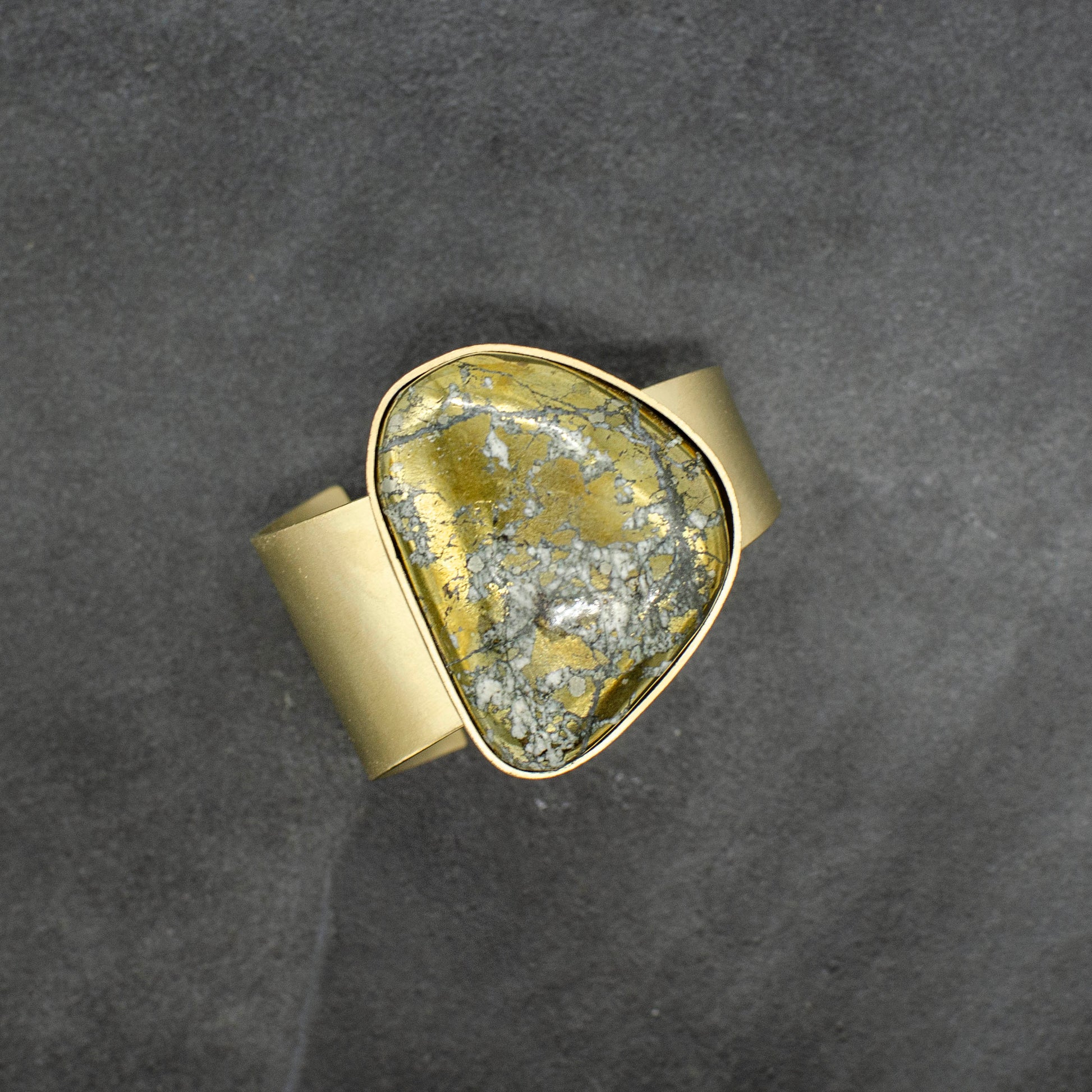 Handmade asymetrical 14k gold plated brass cuff with satin finish and golden pyrite cabochon.