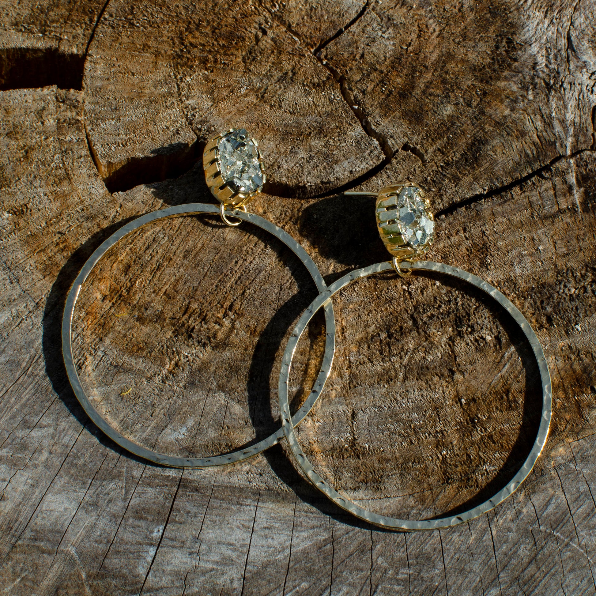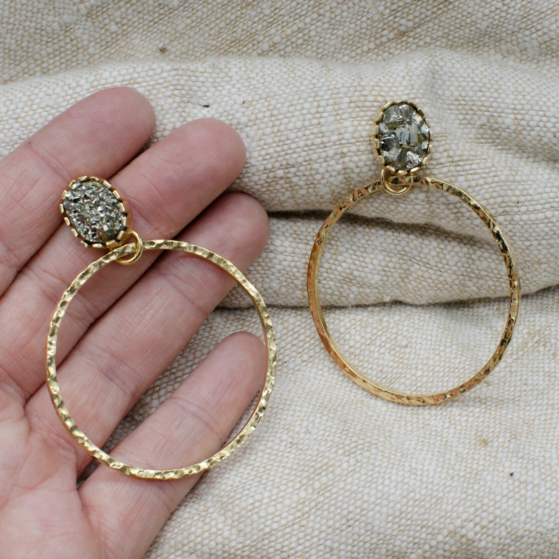 These stunning earrings are handmade in the U.S. from brass and heavily plated in 14k gold. Each pair features sparkling Peruvian pyrite cabochons that bring a touch of earthy glamour to your everyday style. Finished with textured hammered hoops, they're light to medium in weight—perfect for day-to-night wear. Versatile enough to pair beautifully with both gold and silver jewelry.
