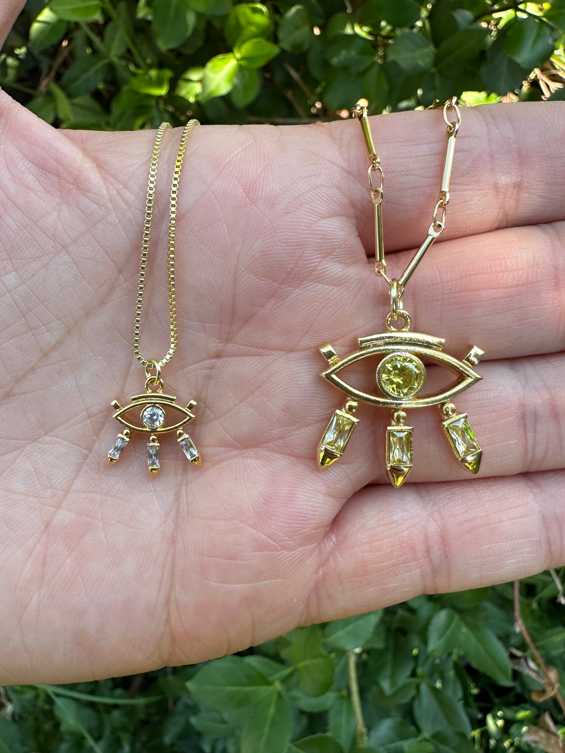 -Evil eye pendant featuring clear cz(small) and light green cz (larger).