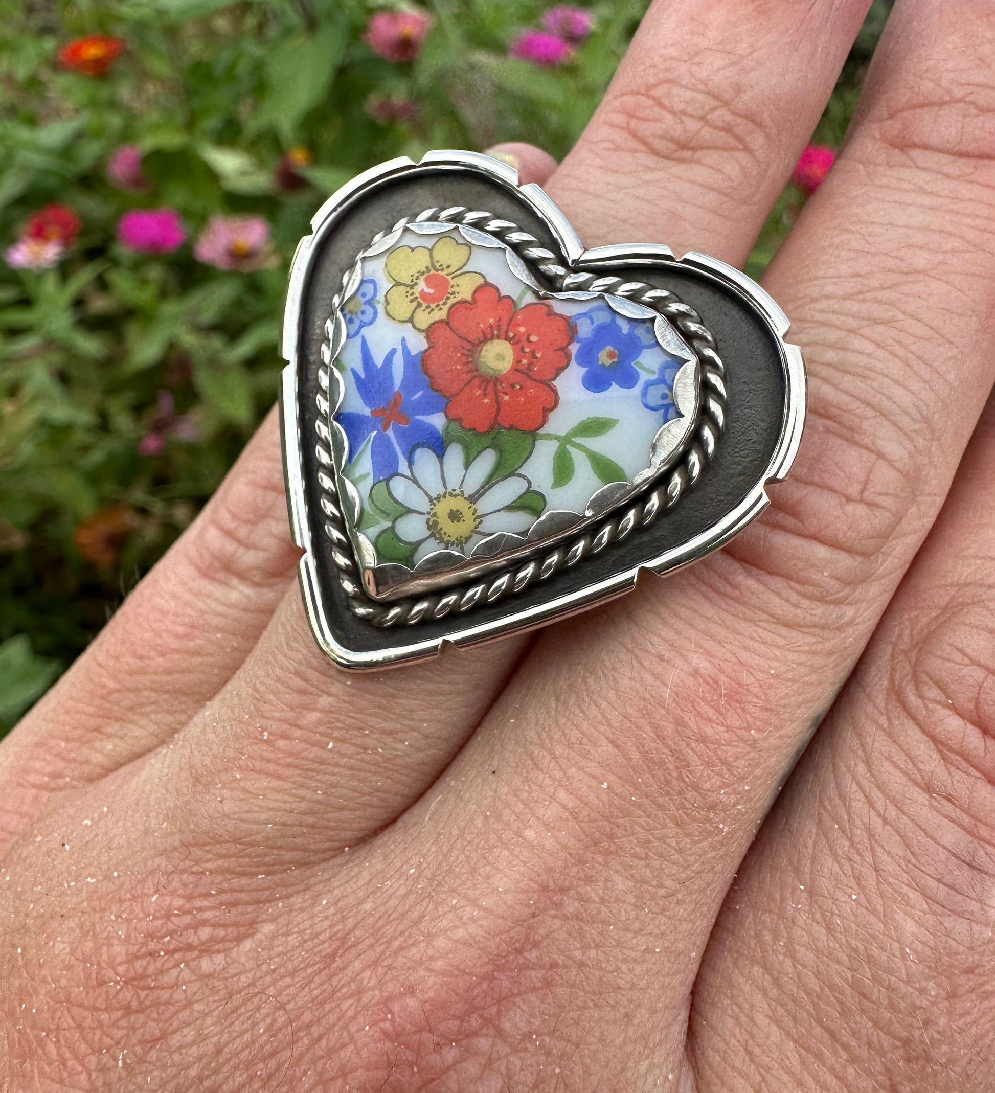 This stunning sterling silver ring features a vintage German floral cabochon from the 1970s, crafted from dead stock for a truly one-of-a-kind piece. The intricate design includes elegant rope accents and Western details, blending a boho vintage Western aesthetic that’s both timeless and unique. This is one of my favorite designs, embodying the free spirit and charm of the Southwest.