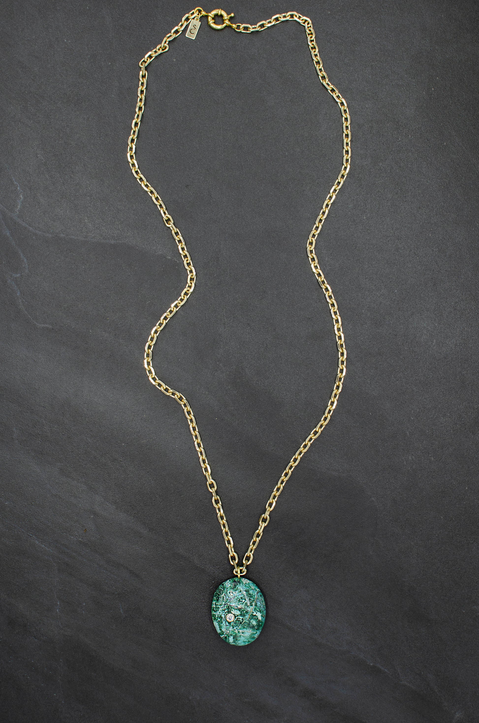 Hand drilled chrysocolla with 3mm cz inlay set in 14k gold bezel. 35mm long gold plated chain with spring clasp.