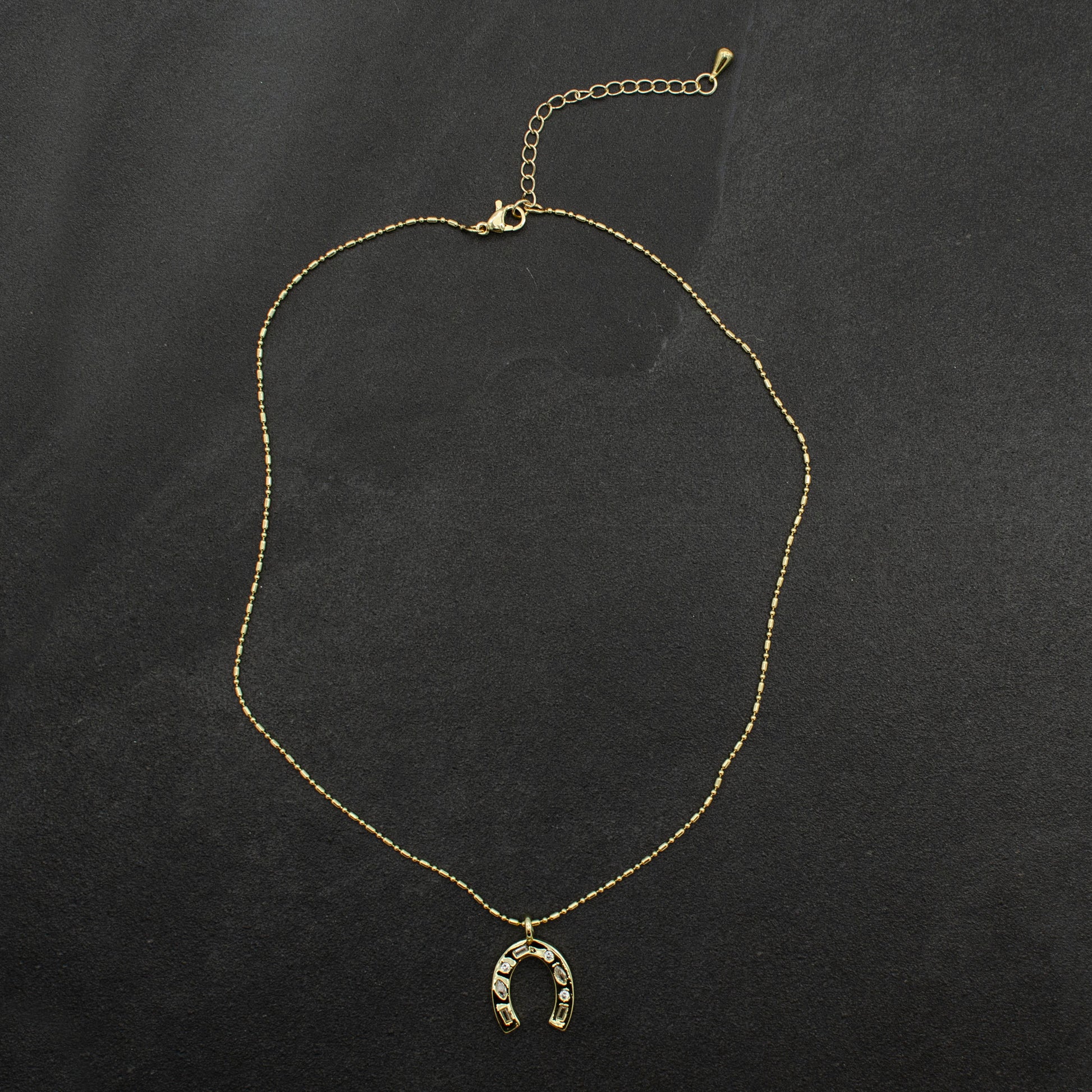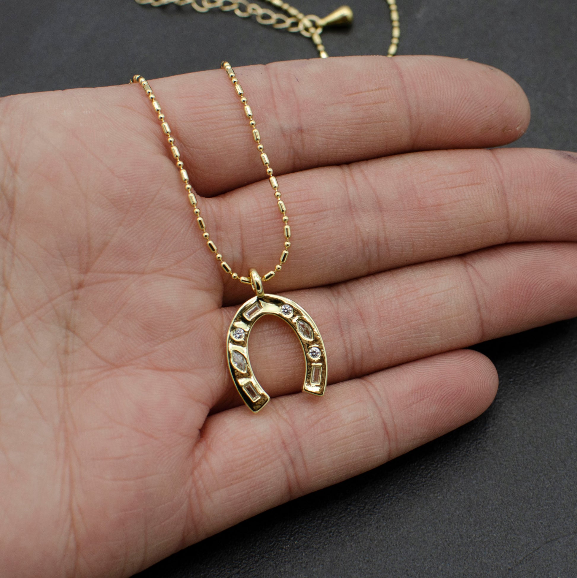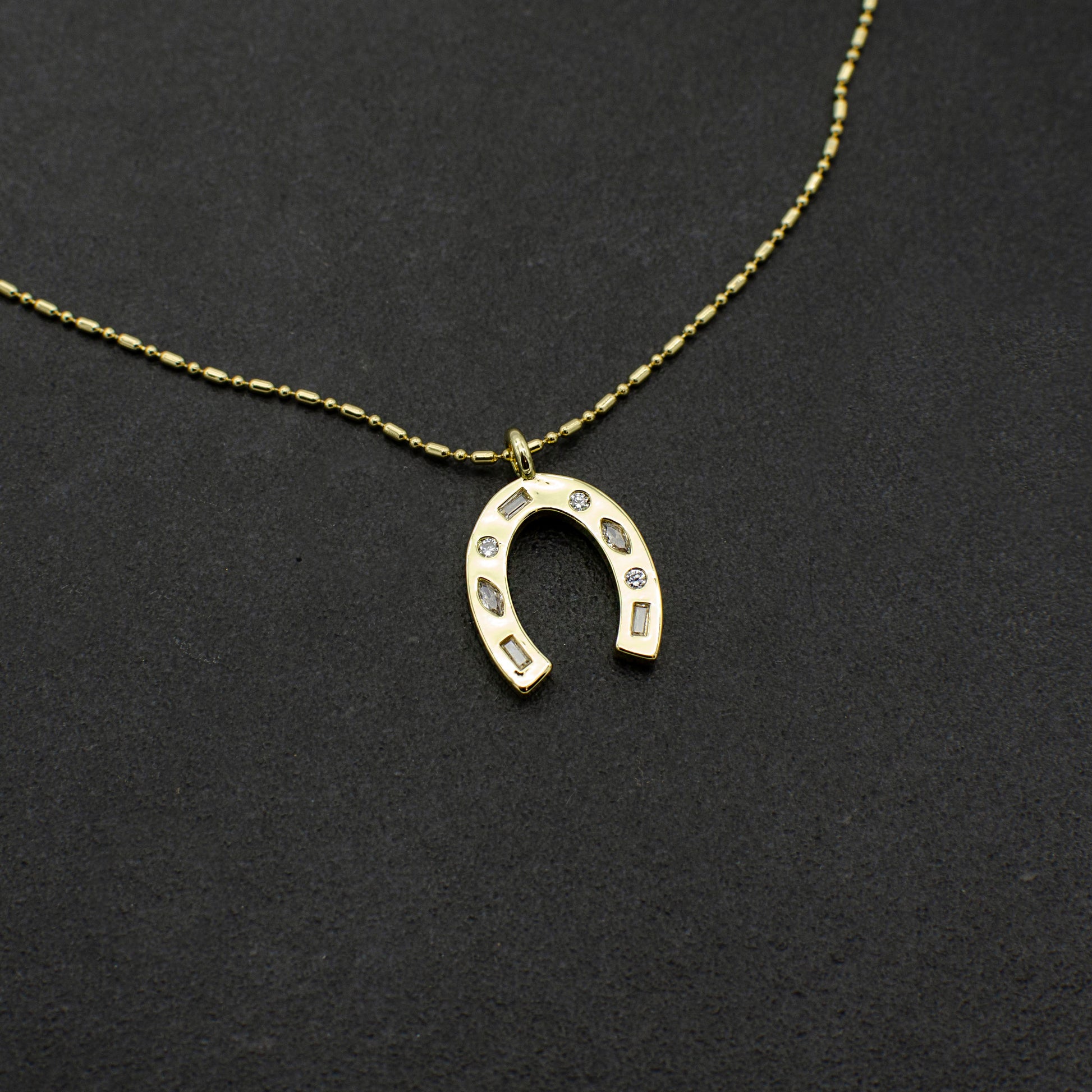 -14k gold plated horseshoe pendant with flush set cubic zircon faceted stones.