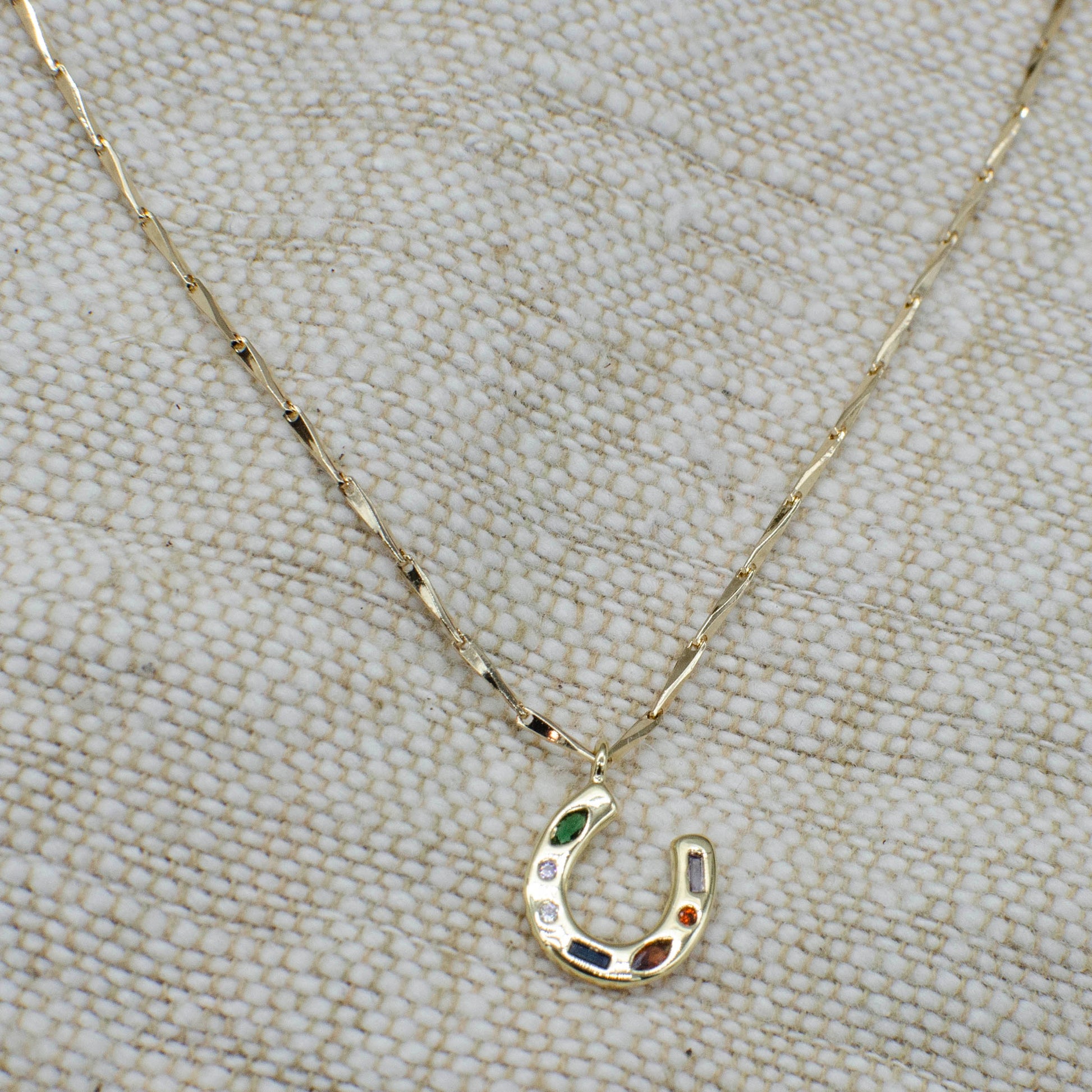 Dainty horseshoe necklace great fro everyday wear. Features 7 various shaped flush set colored stones with unique gold plated chain that measures 16" with a 2"extender.