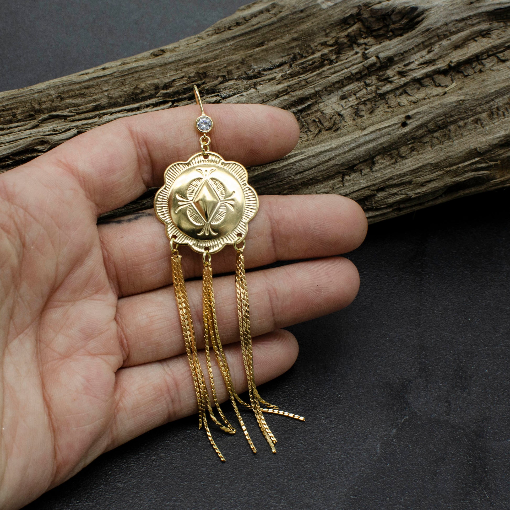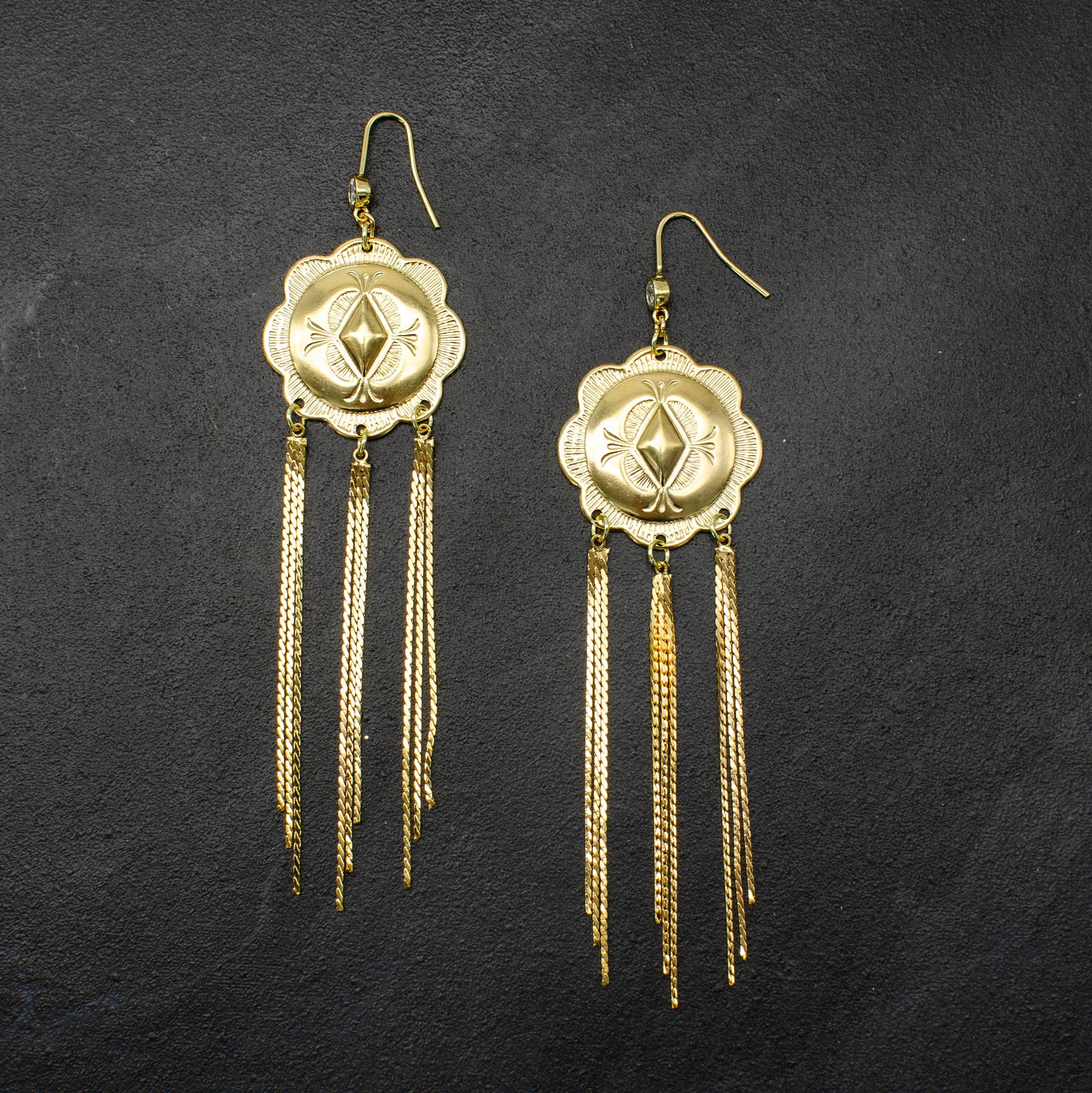 Introducing the Mod West Concho Fringe Chain Earrings, a blend of classic Western style and modern elegance. Handmade in Nashville, available in brass or heavily plated 14k gold, these lightweight earrings feature a long ear hook with a CZ accent. The fringe chain detail adds movement and charm, perfect for those who love a touch of Western flair with a hint of glamour. I just love a good western style earrings in gold dont you?