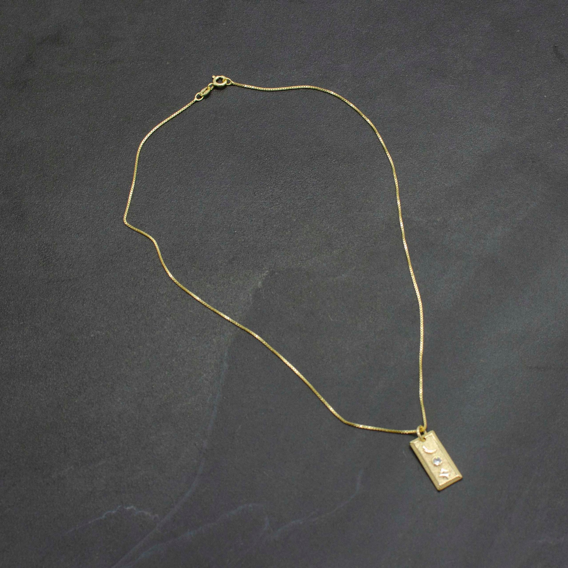 14k gold plated box chain with 14k gold plated celestial pendant with flush set cz this necklace measures 18".