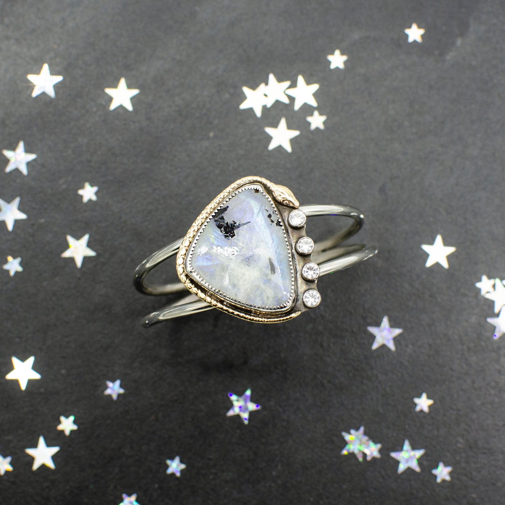 -Handmade Sterling Silver Rainbow Moonstone Serpent Cuff with White Topaz faceted stones.