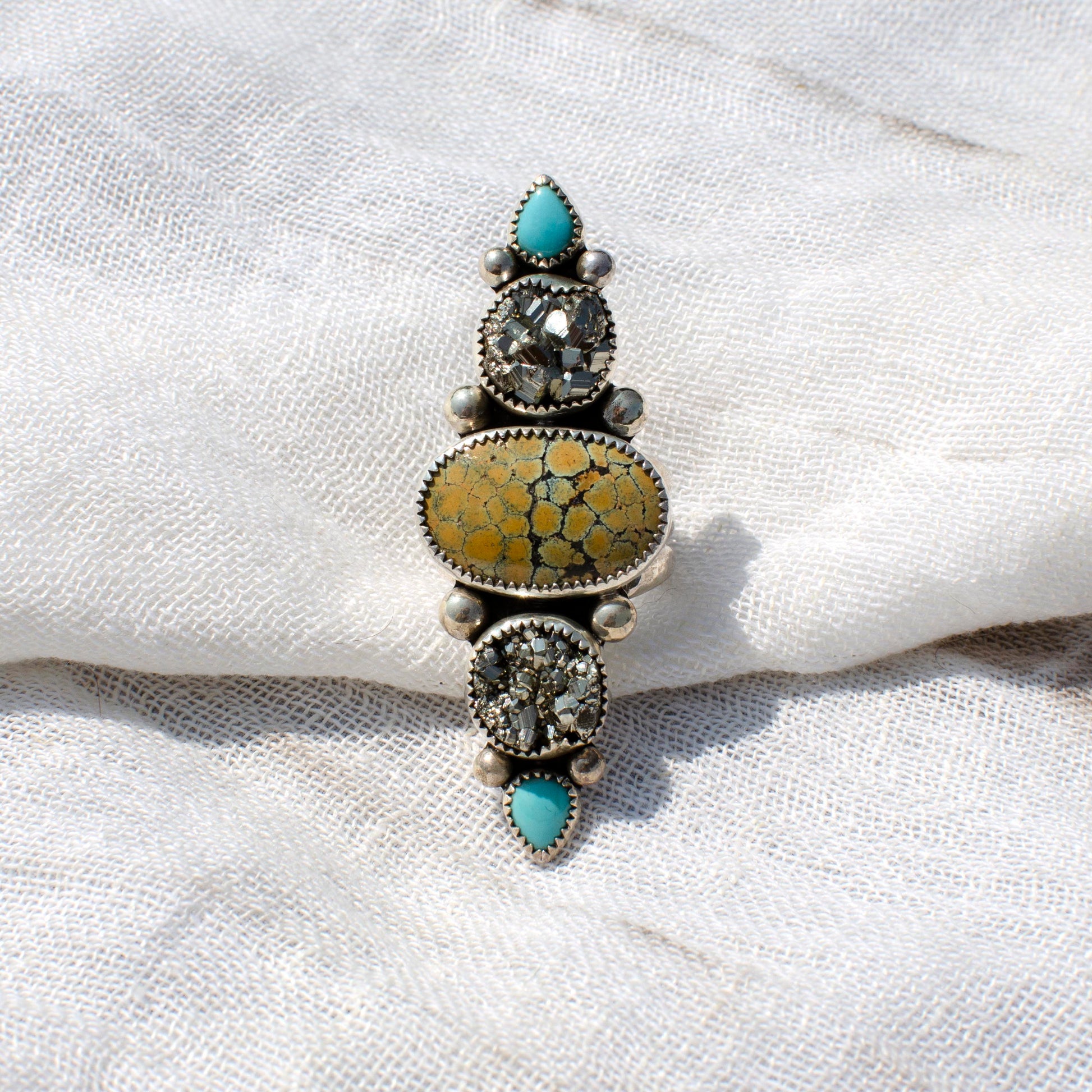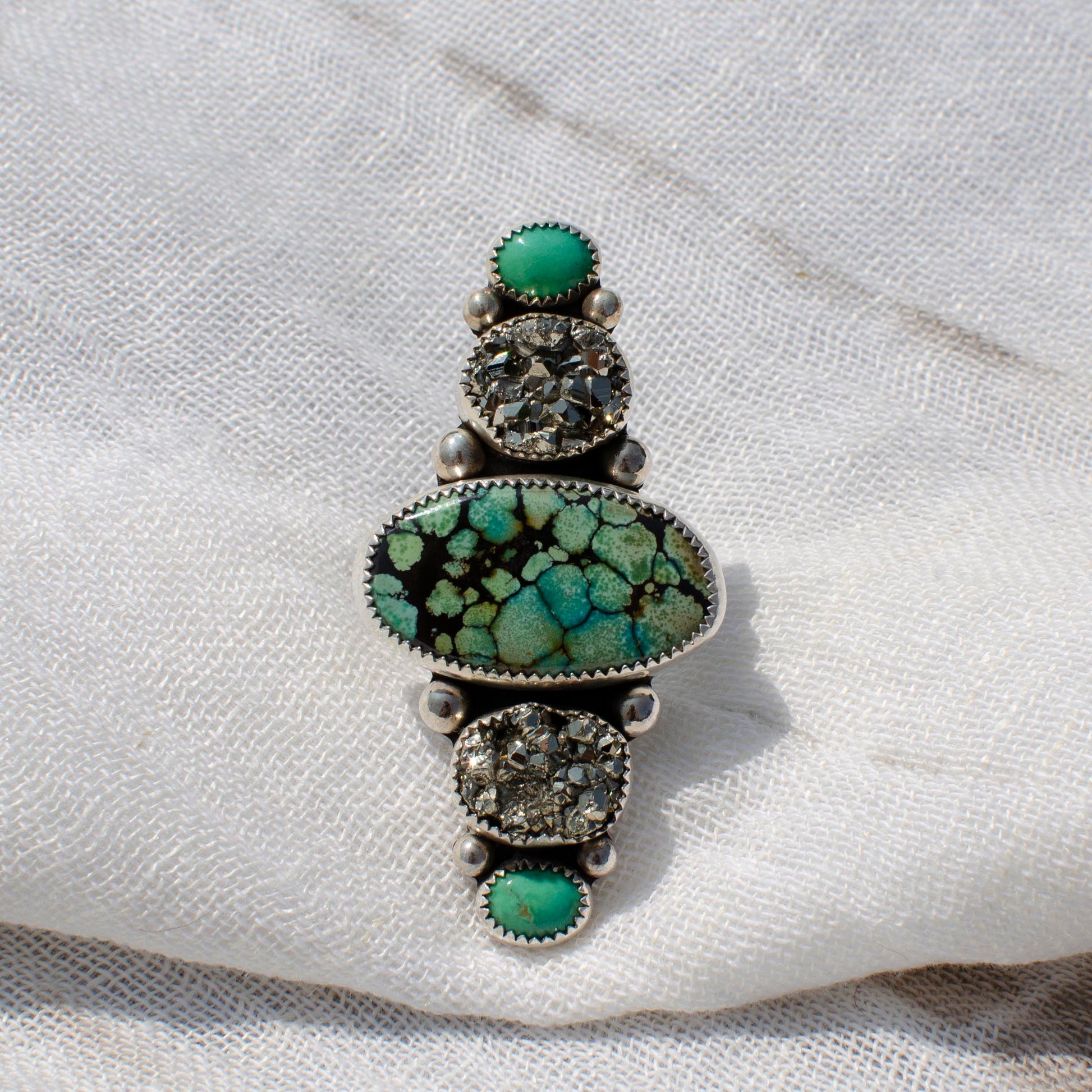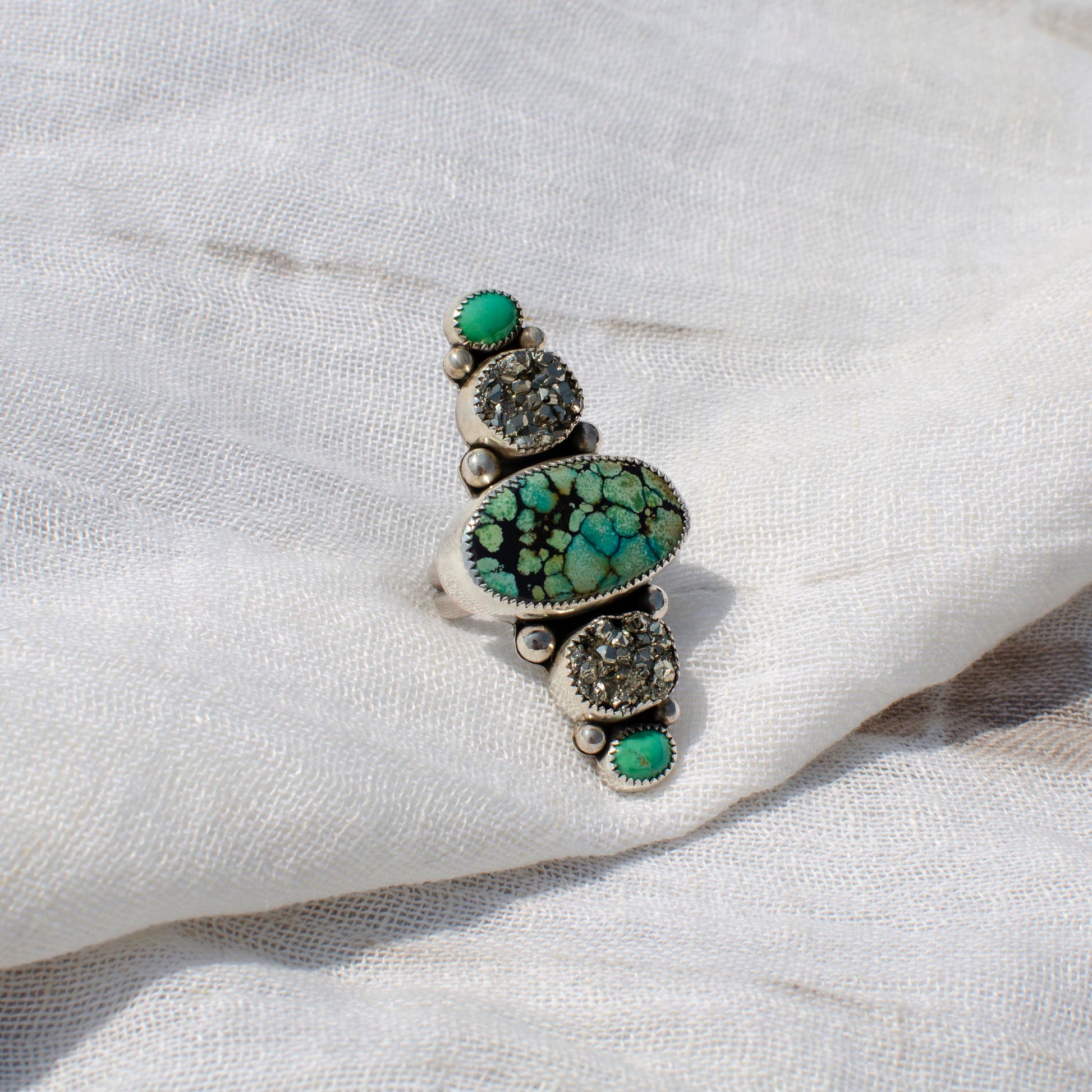 A captivating Qingu Turquoise center stone is flanked by Peruvian pyrite oval cabochons and two green turquoise ovals on each end. This ring is a perfect balance of elegance and striking color combinations, making it a true statement piece.