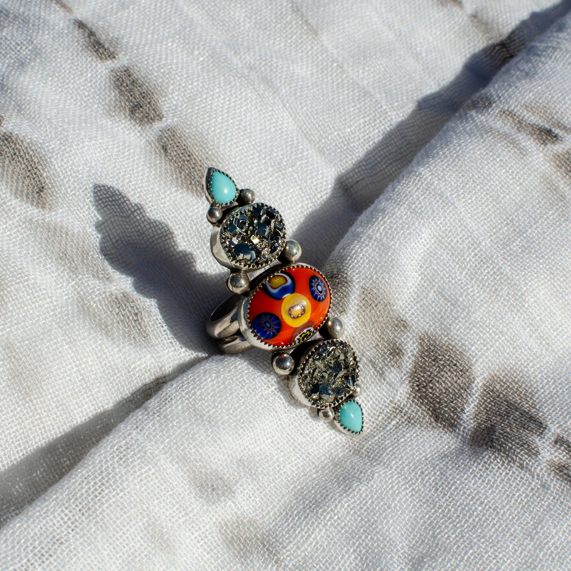 Featuring a mesmerizing Italian Murano glass center cabochon, this ring is accented with two Peruvian pyrite ovals and pear-shaped Kingman turquoise cabochons. The unique blend of textures and hues creates a show-stopping design that sparkles in every light.