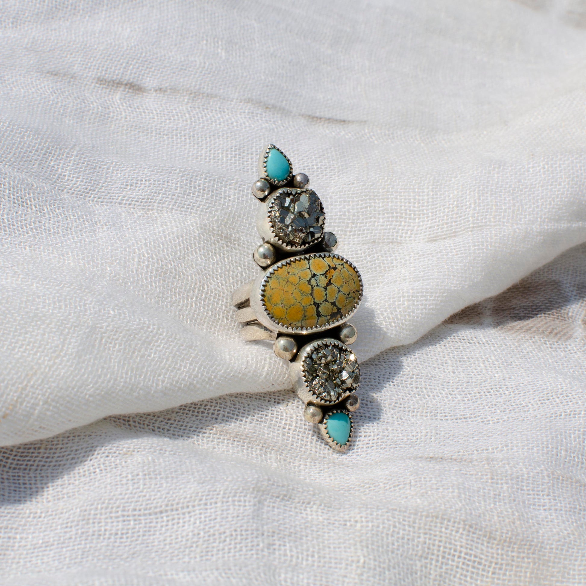A vibrant Orange Turquoise center stone is beautifully complemented by two sparkling pyrite stones and pear-shaped Kingman turquoise. The stunning contrast of colors and textures ensures this ring will shine brightly in the sunlight.