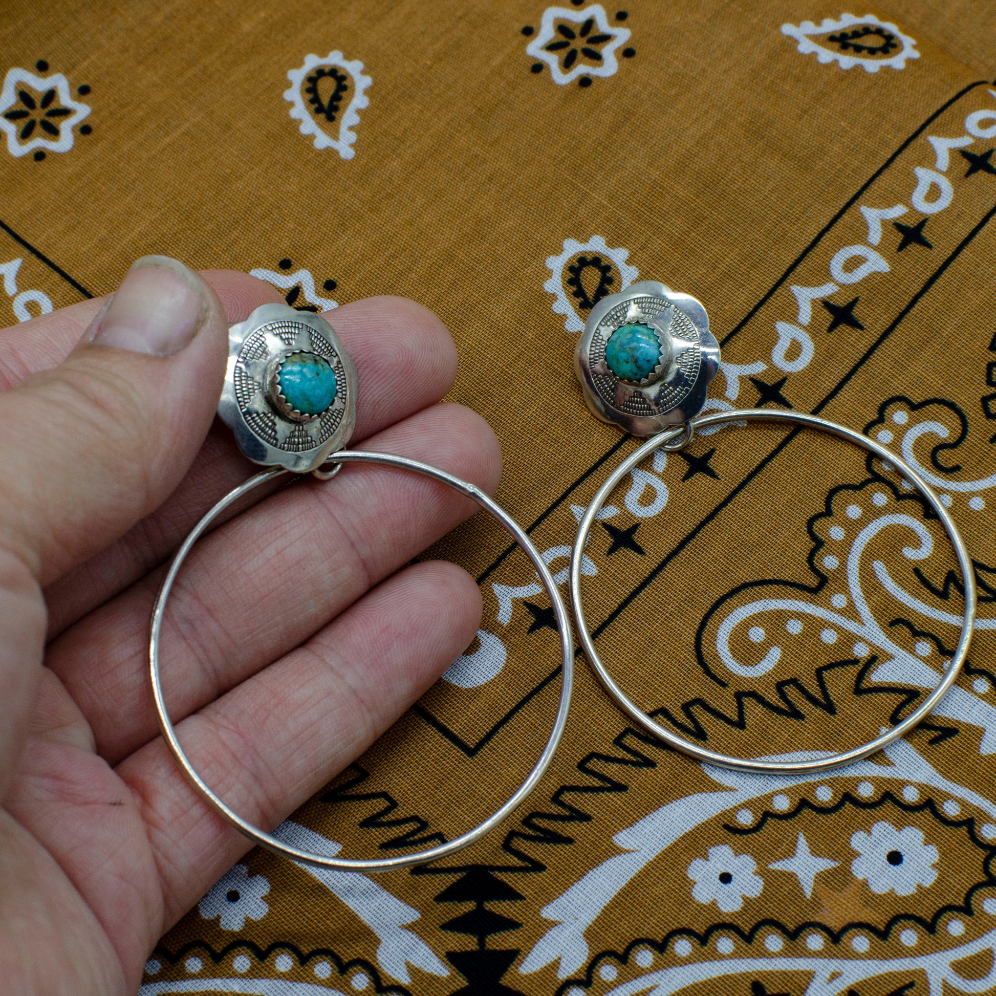 Timeless Western charm with a modern Nashville edge. These handmade sterling silver hoops feature stamped concho tops set with authentic 6mm turquoise cabochons and lightweight open hoops for an easy, effortless look. Worn by country “it” girl Lainey Wilson in her Wrangler Spring 2025 Collection.