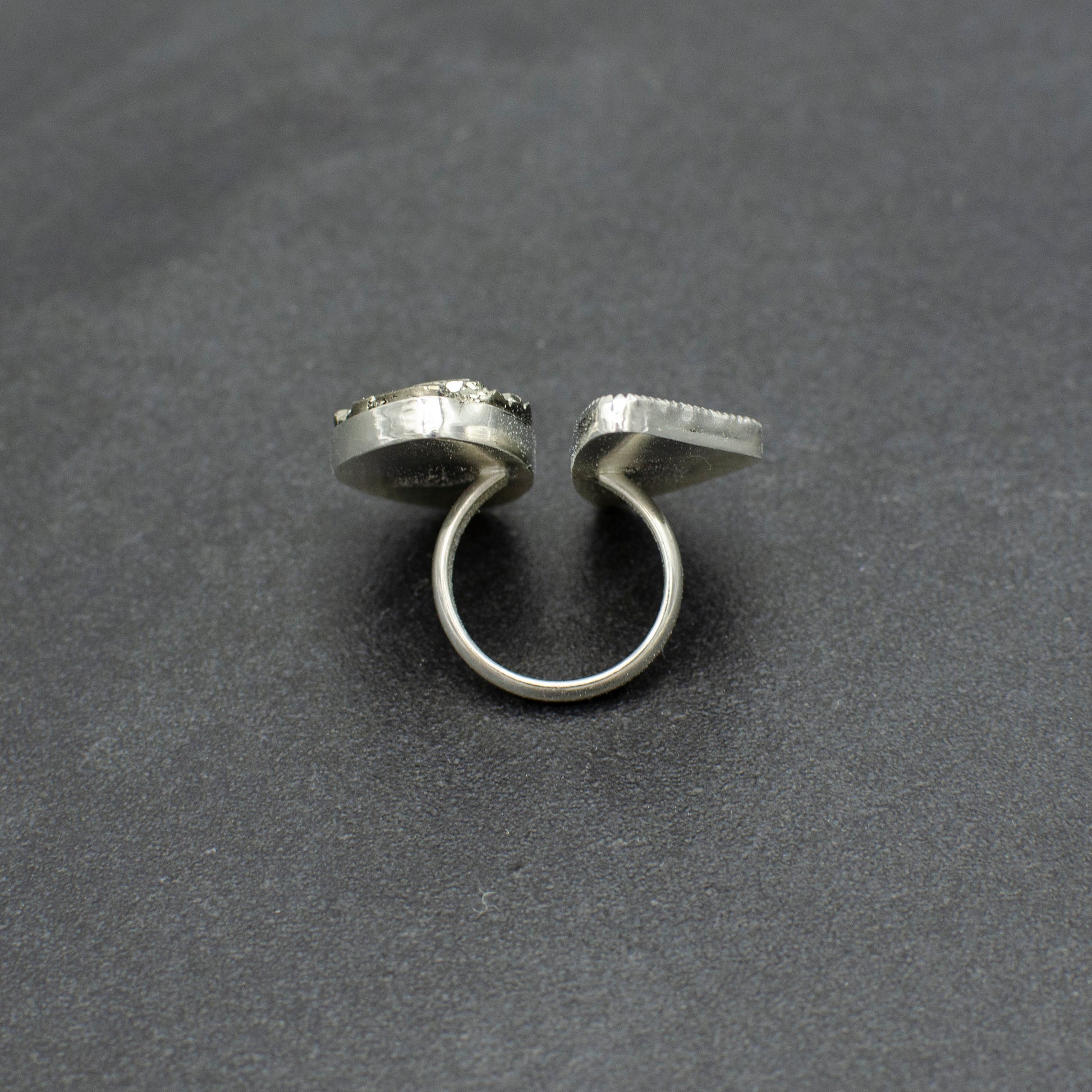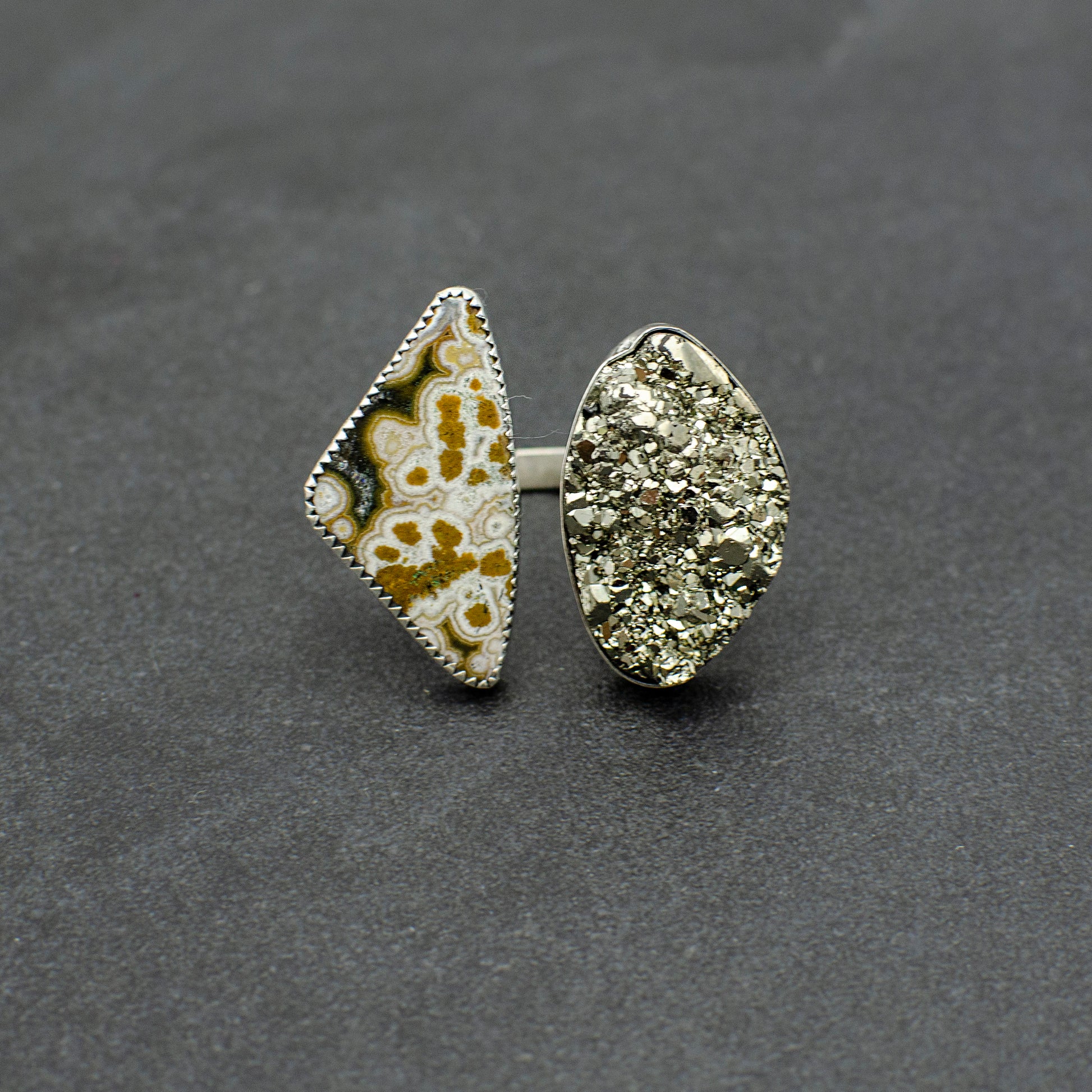 Beautifully handmade sterling silver open face ring with our signature Peruvian pyrite and an ocean jasper stone. This ring adds the perfect sparkle to any look.