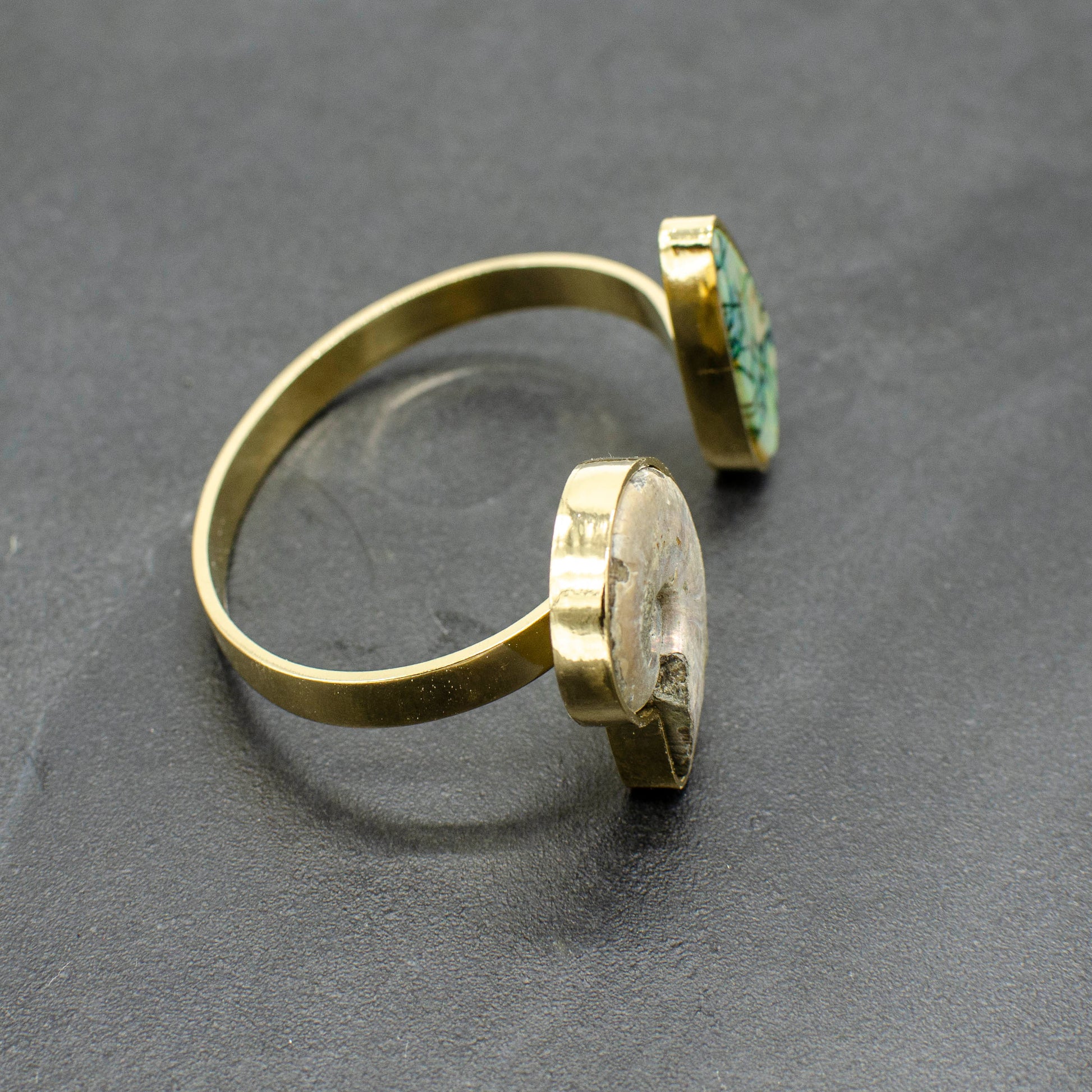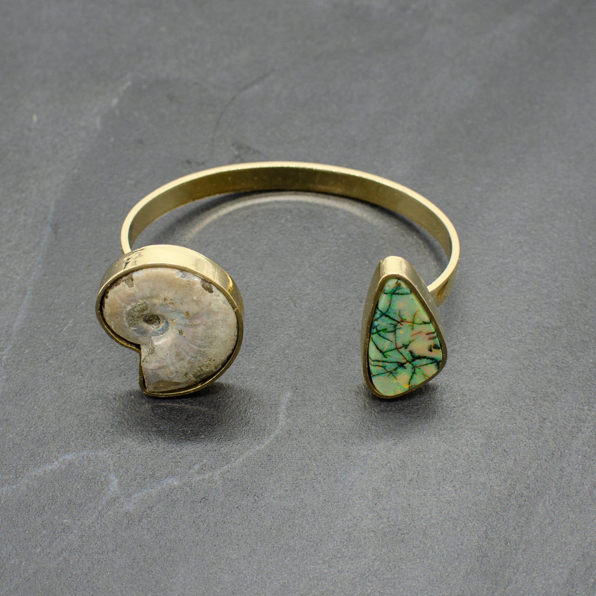One of a kind handmade 14k gold plated brass with cultured opal and ammonite fossil cabochons. Custom stone options available, please fill out form on our custom order page for inquiries.