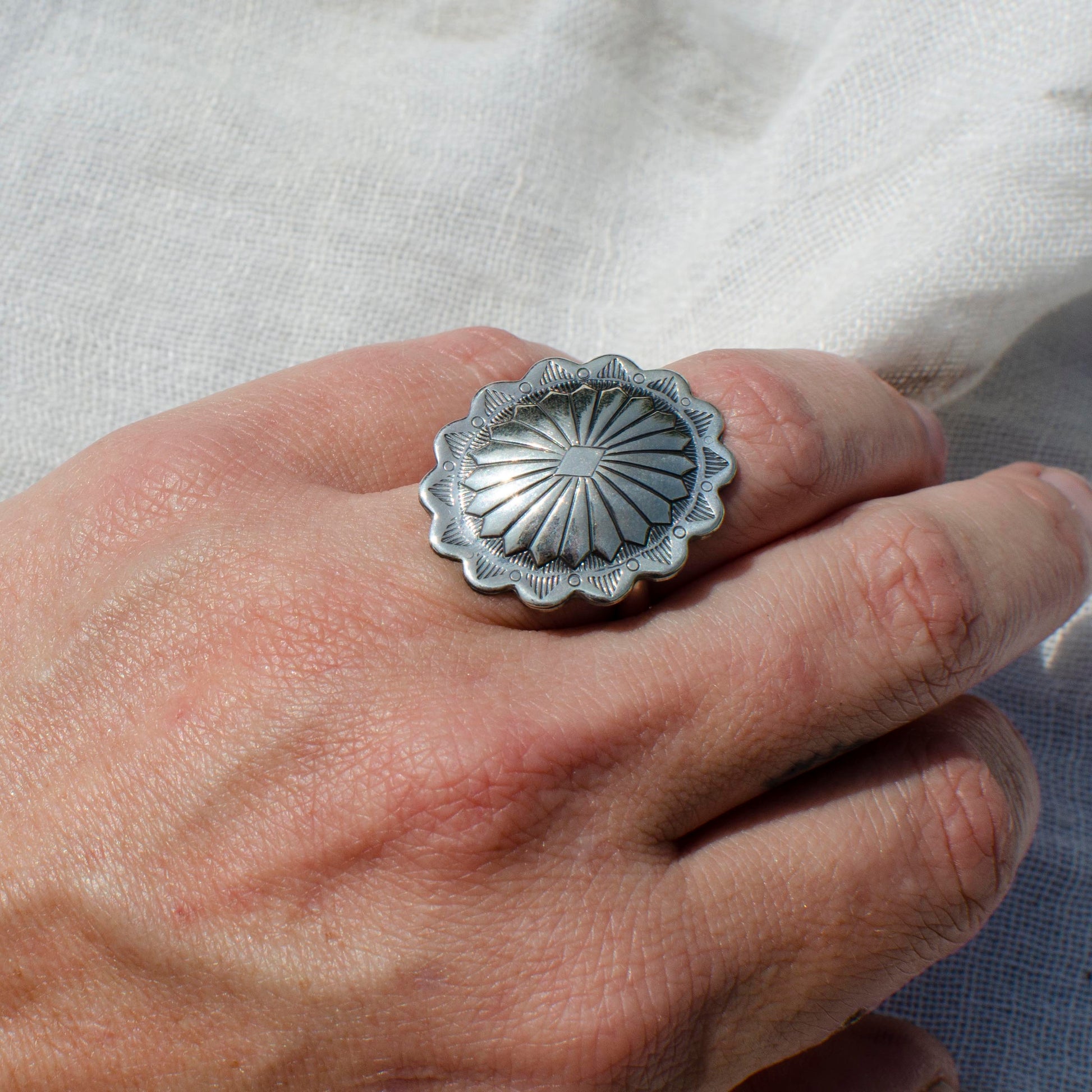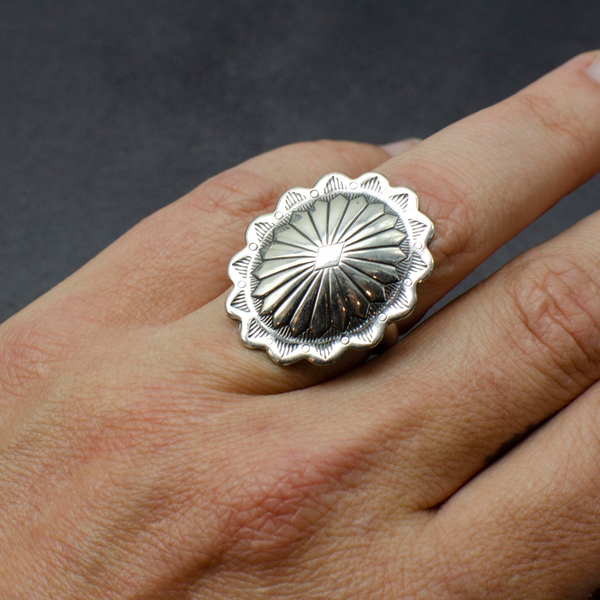 Elevate your everyday style with our handcrafted Western Concho Ring. This striking piece features a beautifully stamped Western concho set on a sleek half-round sterling silver band. Finished with a mirror shine, it offers a timeless look that complements any collection. Perfect for daily wear, this ring combines rugged Western charm with modern elegance, making it a versatile staple in your jewelry wardrobe.