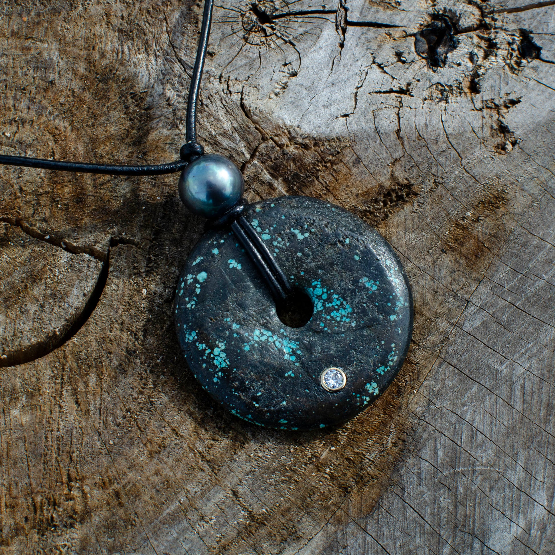 Earthy meets ethereal in this one-of-a-kind statement necklace. Featuring a natural turquoise-speckled stone disc with a hand-drilled 4mm cubic zirconia in a 14k gold-plated bezel, this piece is accented with a luminous peacock pearl and strung on an adjustable leather cord. Wear it as a choker or style it long—up to 20".