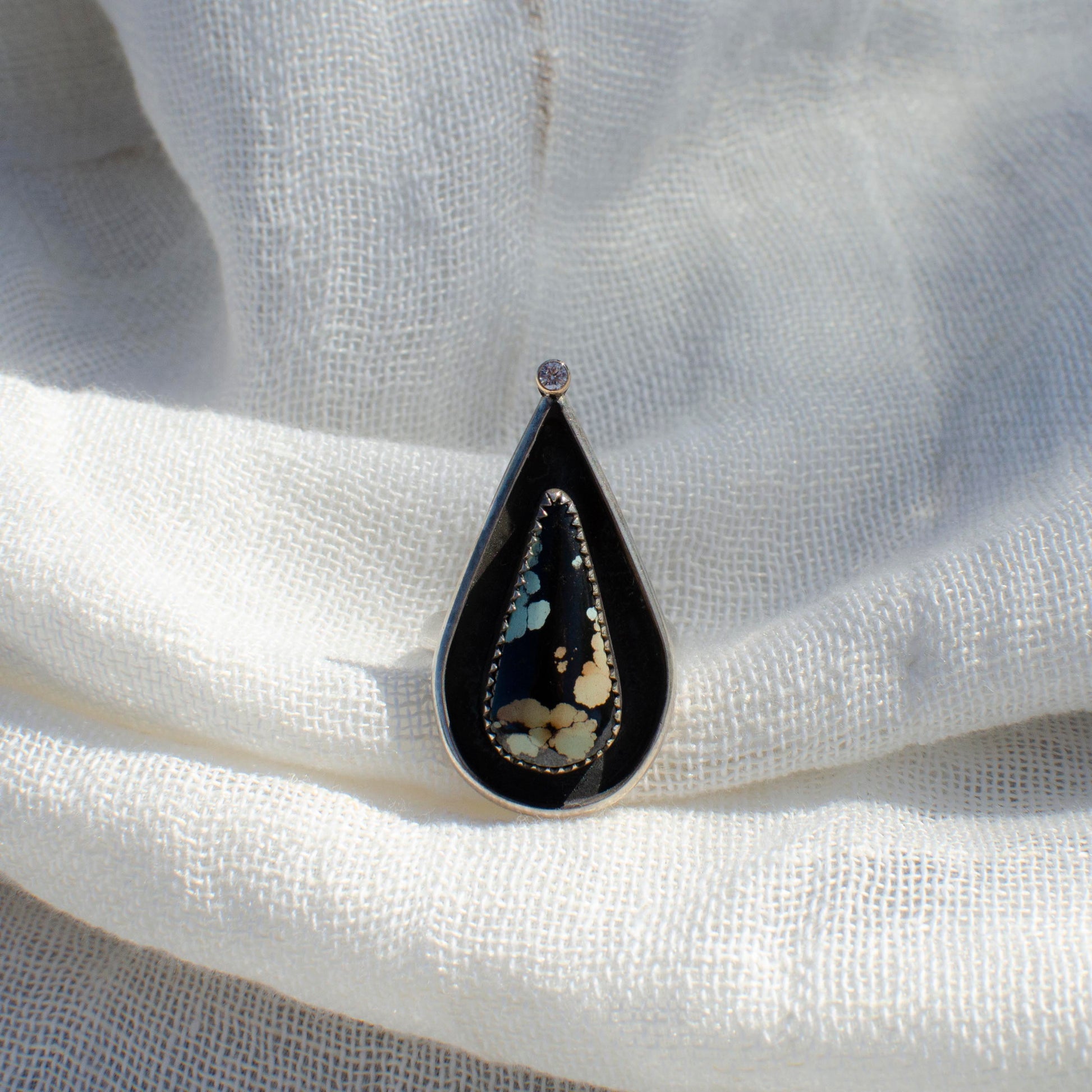 Handmade in sterling silver, this exquisite ring showcases a stunning pear-shaped natural Turquoise Cabochon from Treasure Mountain. The shadow box style setting highlights the vibrant turquoise, while a 2.5mm bezel-set cubic zirconia in 14k gold adds a touch of elegance. This one-of-a-kind piece, crafted with meticulous attention to detail, is a size 6. Celebrate the unique beauty of natural stones with this captivating ring.