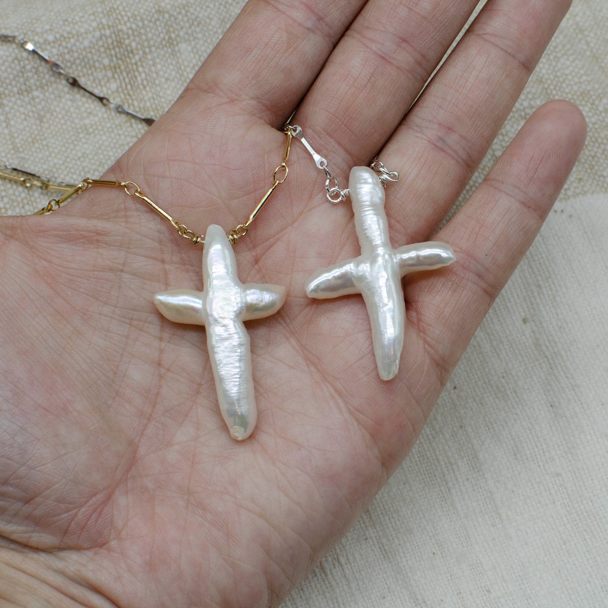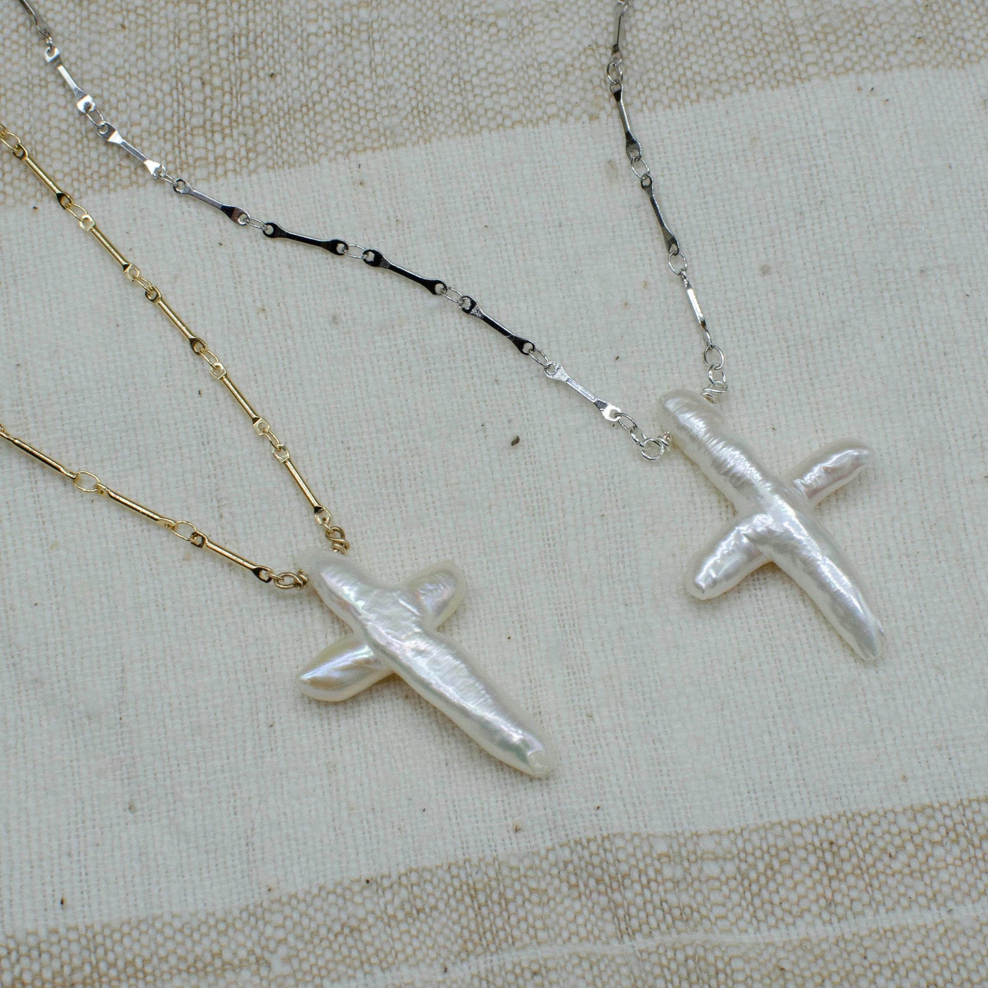 These elegant and lightweight natural pearl cross necklaces are designed for effortless, everyday wear. Each piece features a beautiful, organically shaped freshwater pearl in the form of a cross, offering a unique and natural look. Available in both silver-plated and gold-plated options, each necklace is 16 inches in length with a 2-inch extender, allowing for a versatile fit. Perfect for layering or wearing on its own, these necklaces add a touch of subtle sophistication to any outfit.