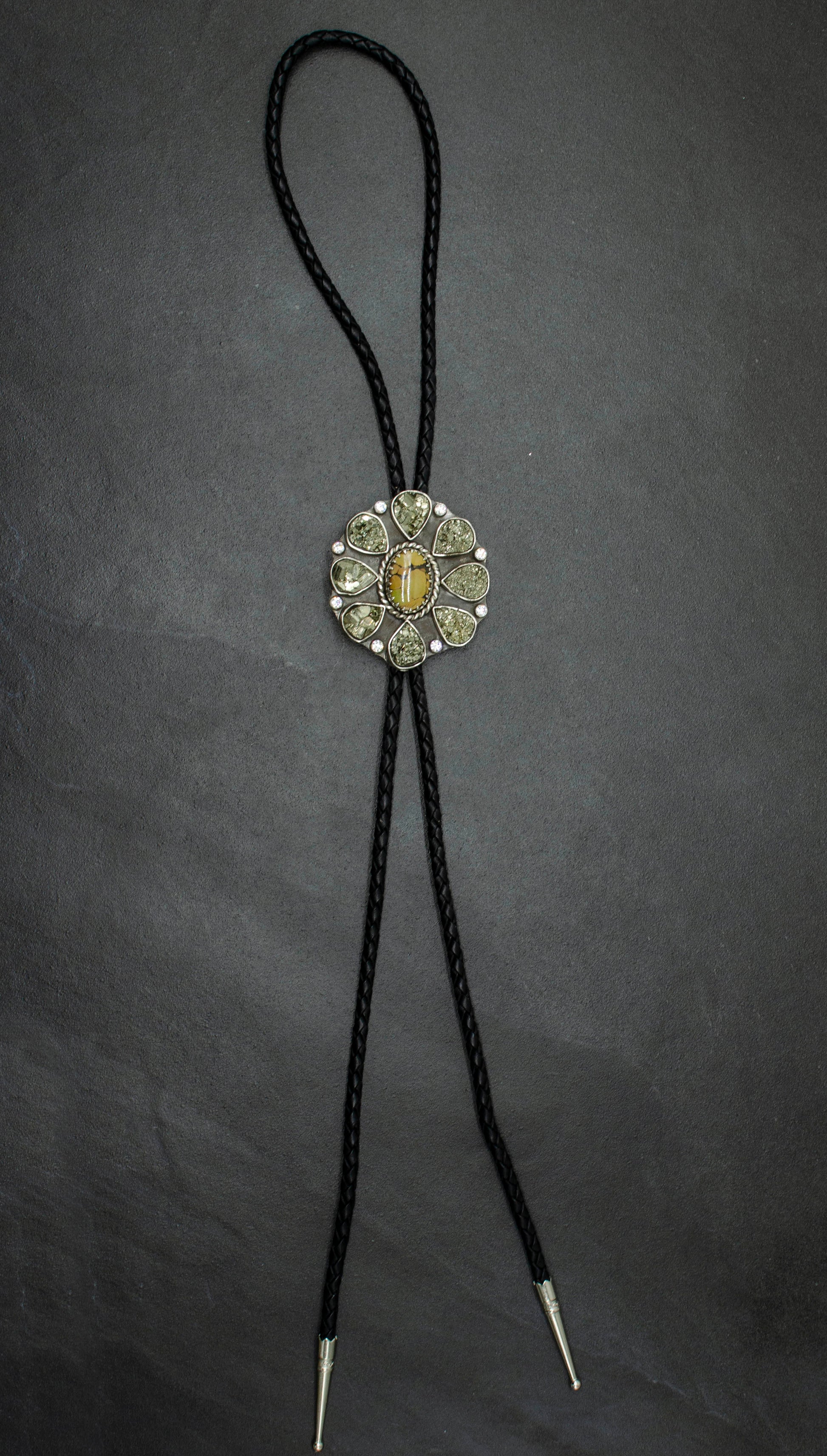 Elevate your Western-inspired ensemble with this stunning Handmade Peruvian Pyrite and Yellow Hubei Turquoise Statement Bolo, measuring 3" x 3" at its widest points. Crafted with meticulous attention to detail, this bolo features eight pear-shaped pyrite stones complemented by a striking Hubei turquoise center stone, all set in sterling silver.