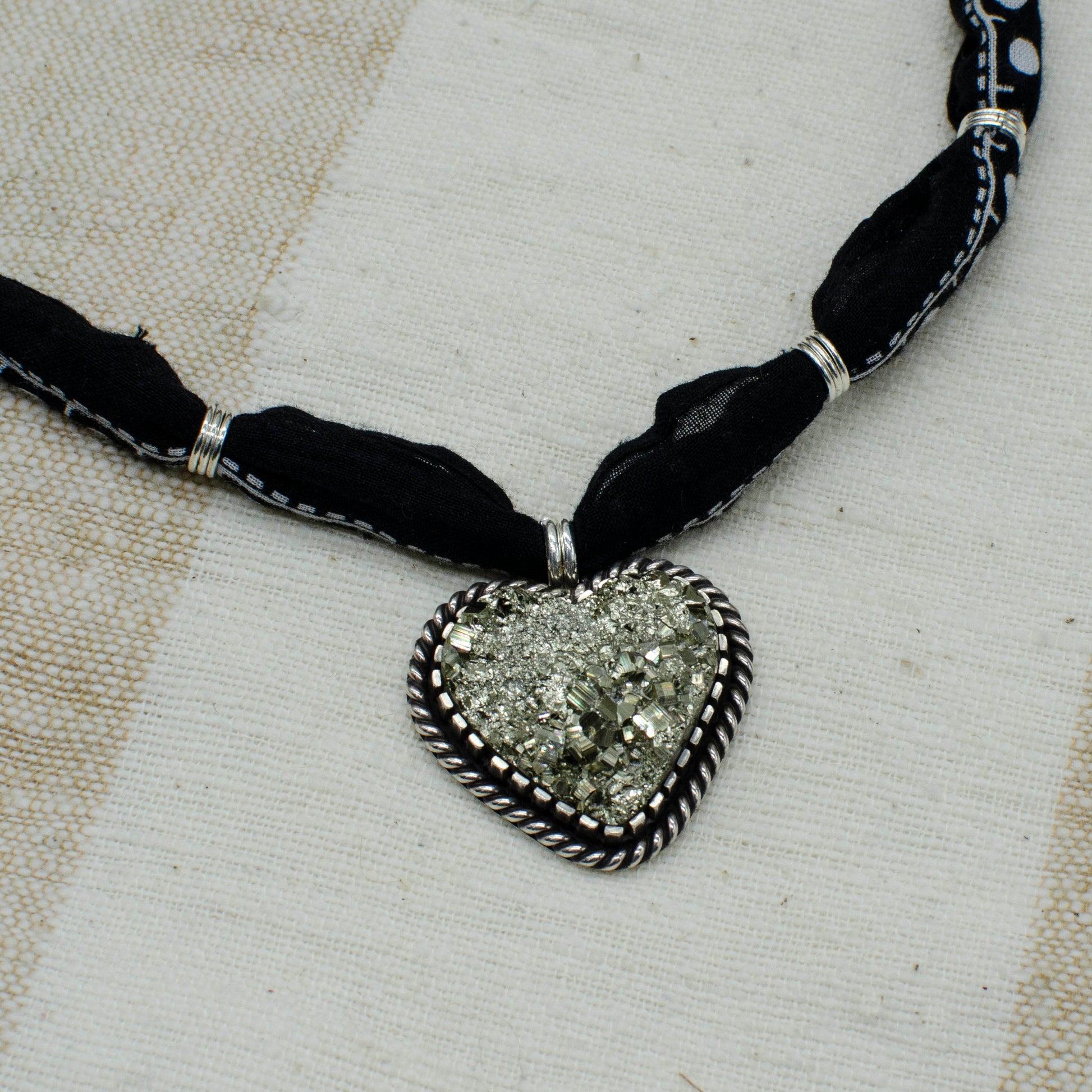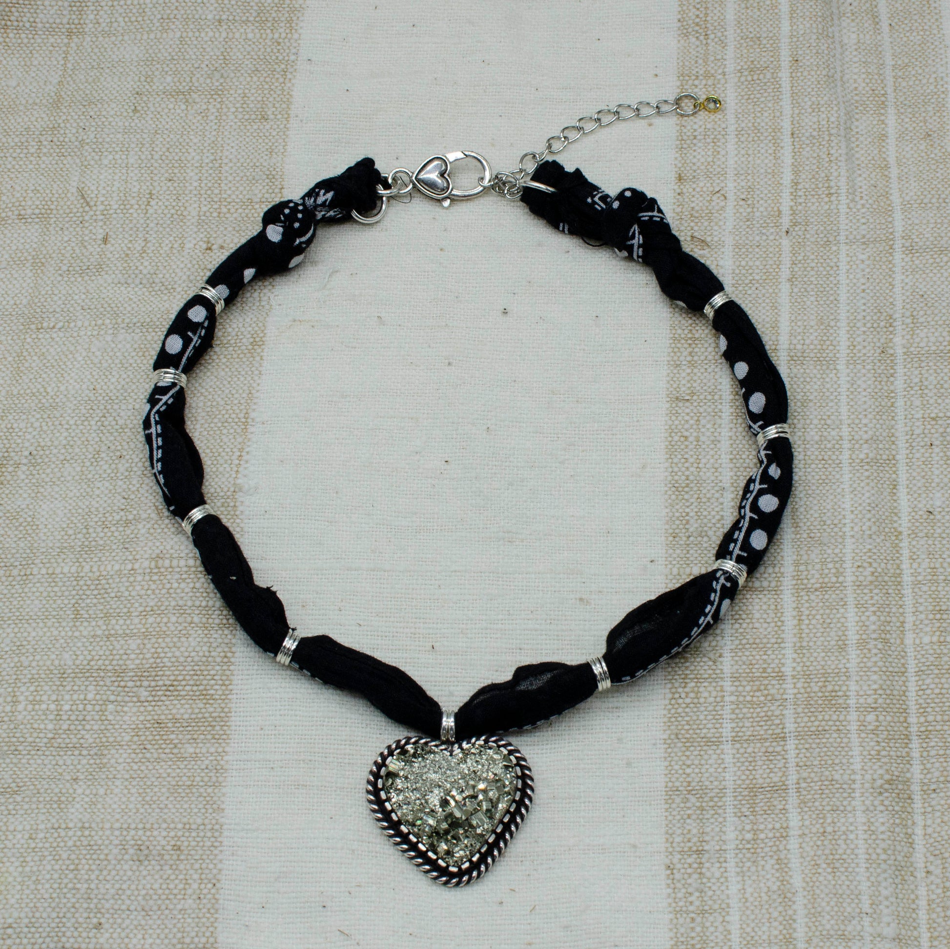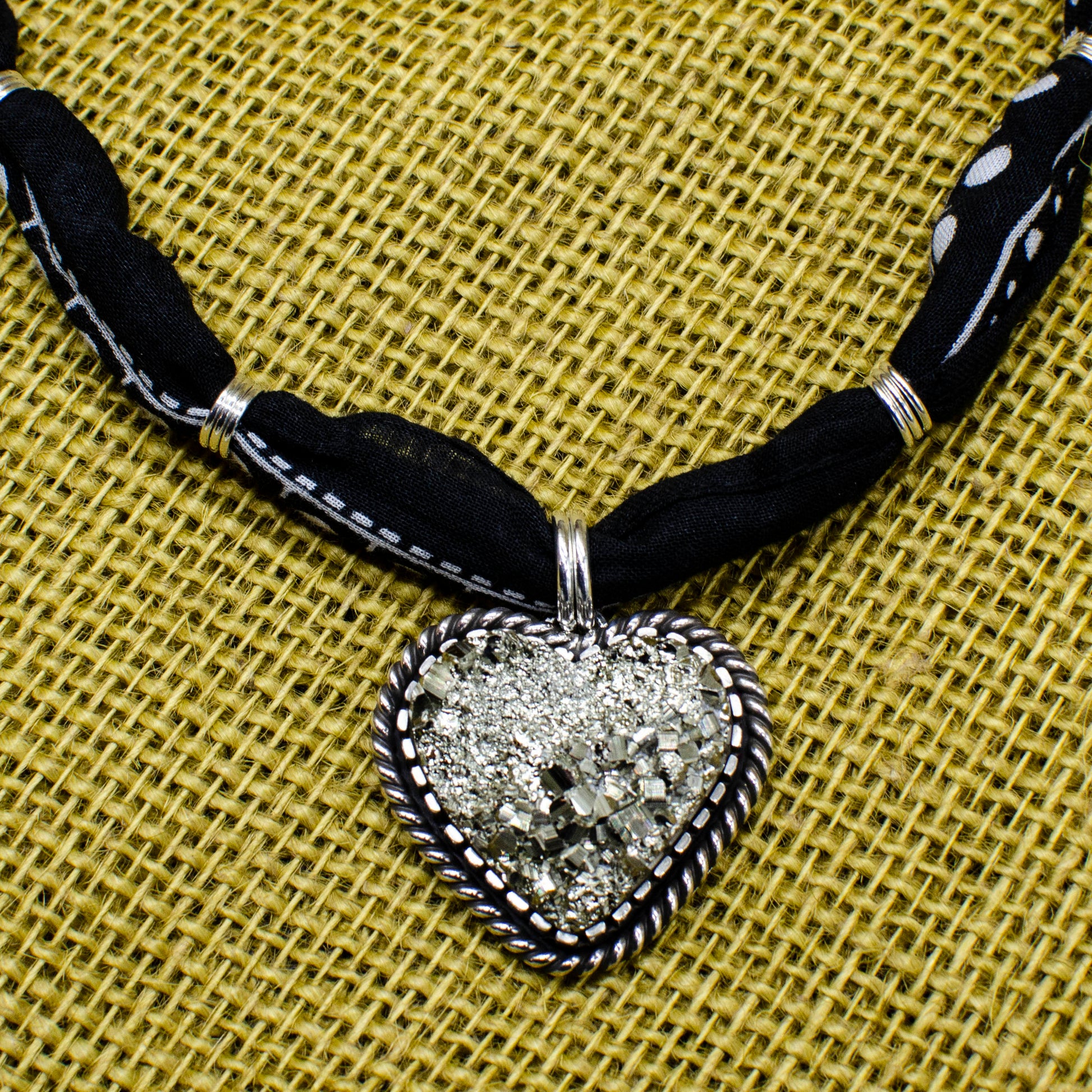 Make a bold statement with this one-of-a-kind handmade necklace, featuring a heart-shaped Peruvian pyrite pendant set in sterling silver with intricate rope details. The super sparkly, high-quality pyrite stone adds a touch of Western-inspired flair. Strung on a versatile black bandana with adjustable lengths and clasp, this show-stopping piece is perfect for adding a unique edge to any outfit. Necklace length is 16" with a 3" extender.