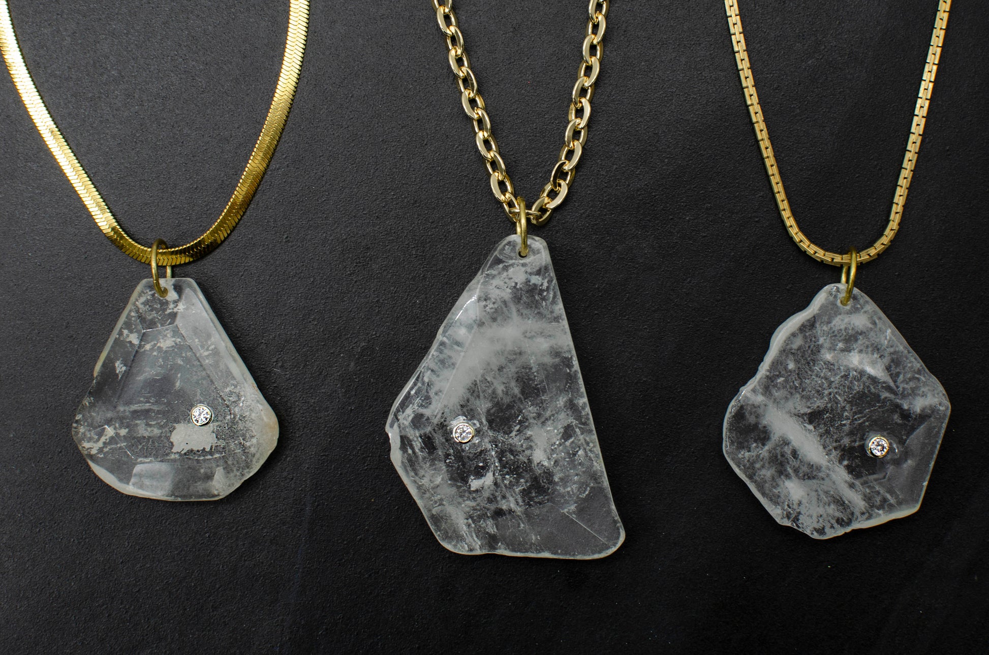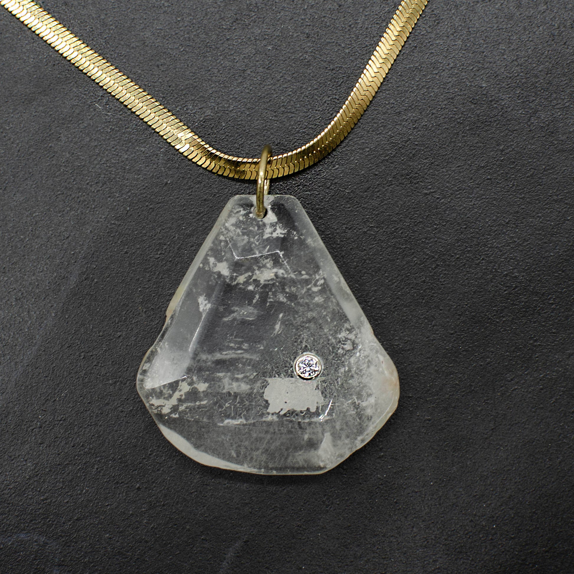 Hand drilled quartz slab with inlay cz set in 14k gold bezel. 16" gold plated herringbone chain.